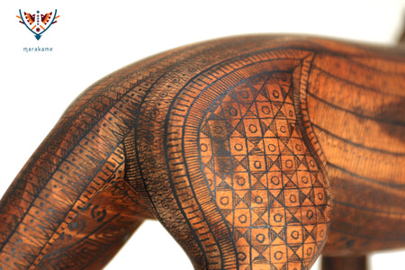Este alebrije de jaguar, tallado a mano en madera de copal, es una obra maestra del arte popular oaxaqueño. Decorado con patrones geométricos vibrantes y líneas fluidas, representa la fuerza, agilidad y espíritu protector del jaguar, una figura sagrada en la cosmovisión mesoamericana. Cada detalle ha sido pintado a mano con gran precisión, reflejando la herencia simbólica zapoteca. Ideal como pieza de colección o acento protagónico en cualquier espacio, esta escultura única transmite una energía poderosa y elegante.