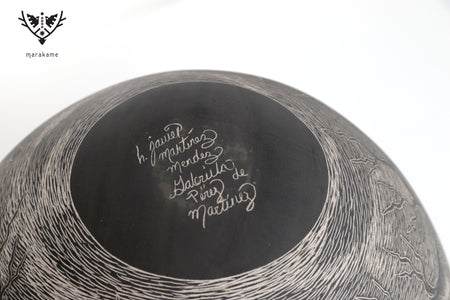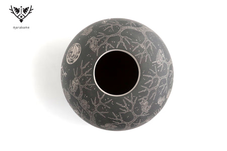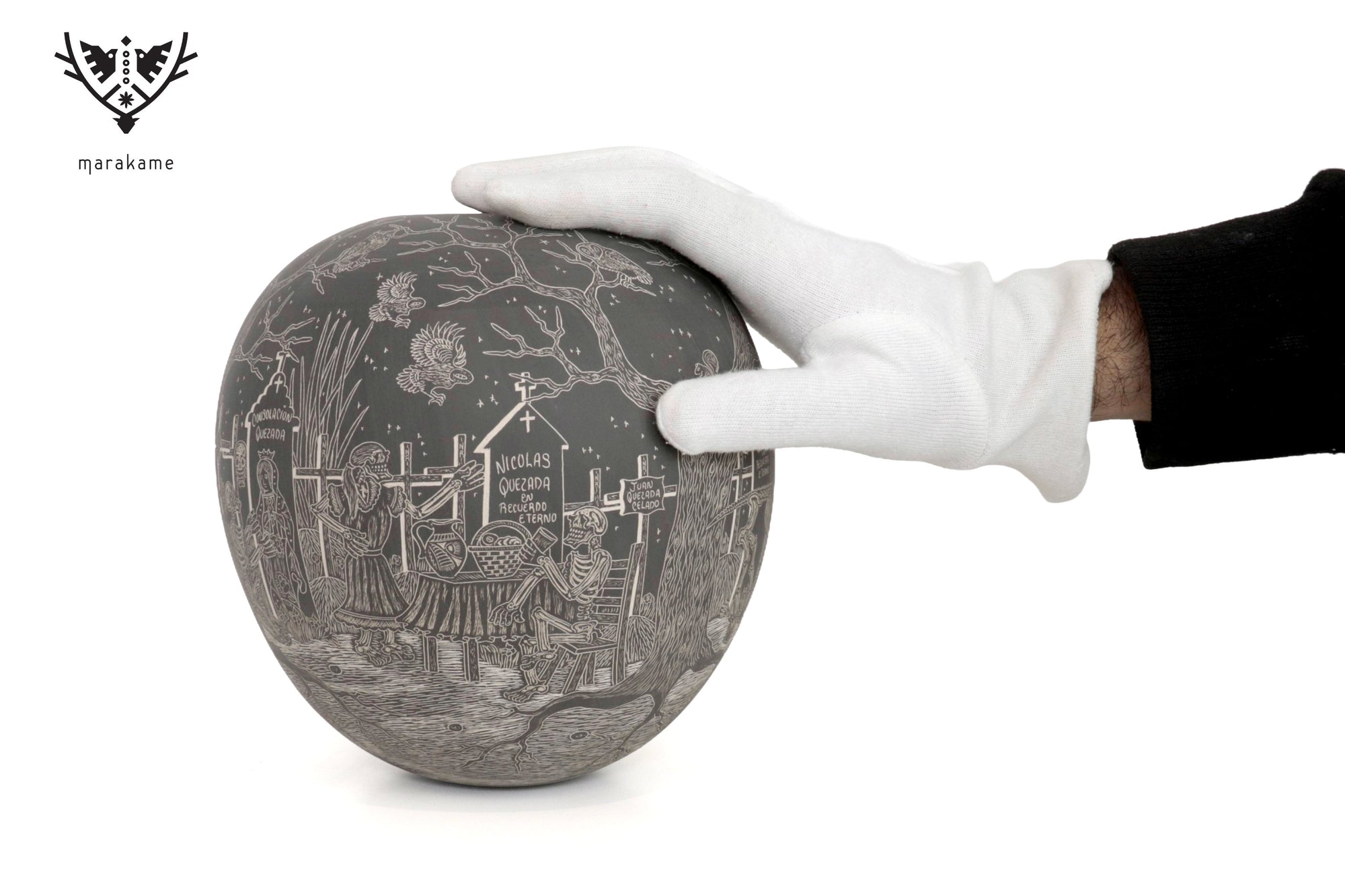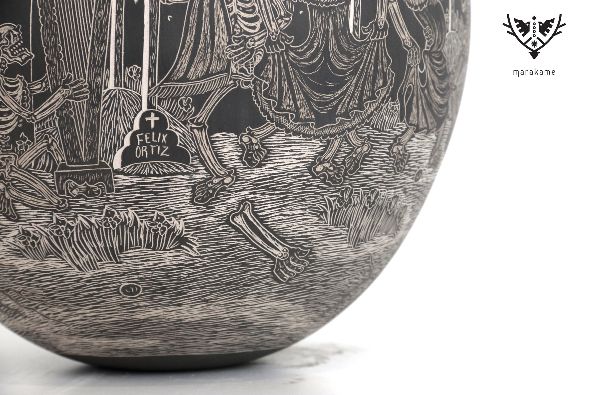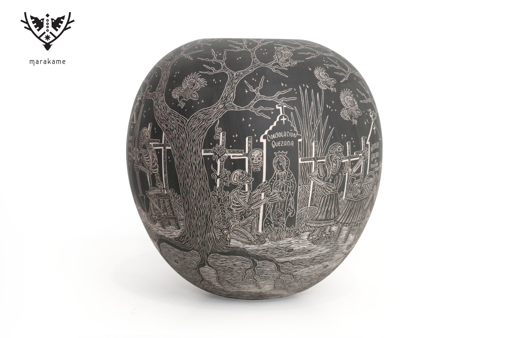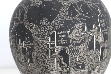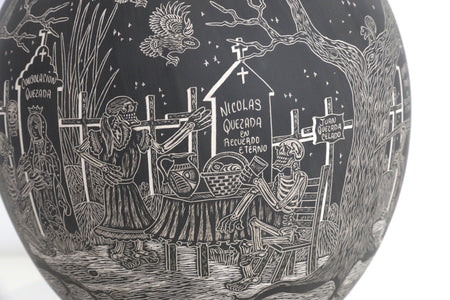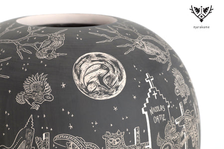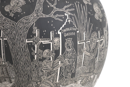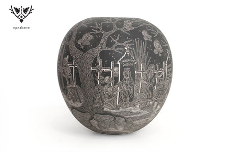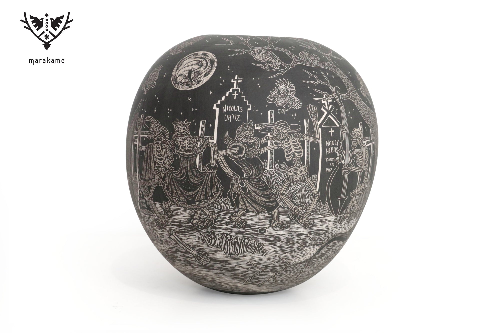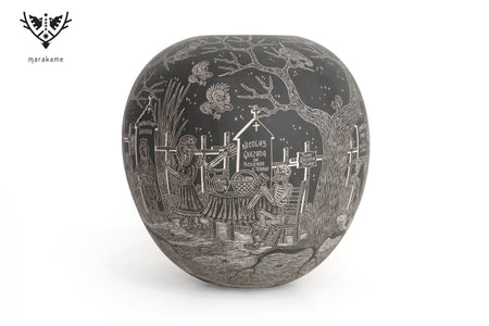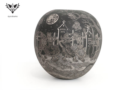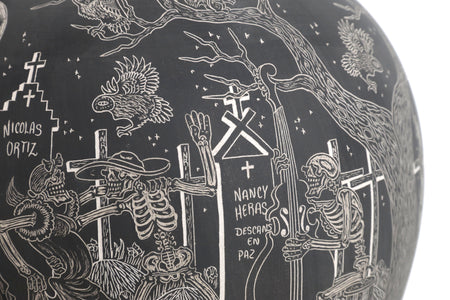 En esta pieza de cerámica de Mata Ortiz, presenta una escena nocturna de Día de Muertos finamente grabada: un jinete esquelético cabalga sobre un caballo huesudo entre lápidas, cruces y nombres que evocan memoria y eternidad. Bajo un cielo estrellado y el ramaje retorcido de un árbol antiguo, el panteón cobra vida con humor macabro y poesía visual, celebrando el vínculo entre los vivos y los que han partido.