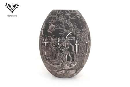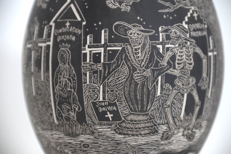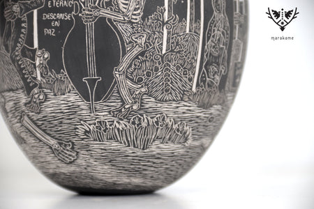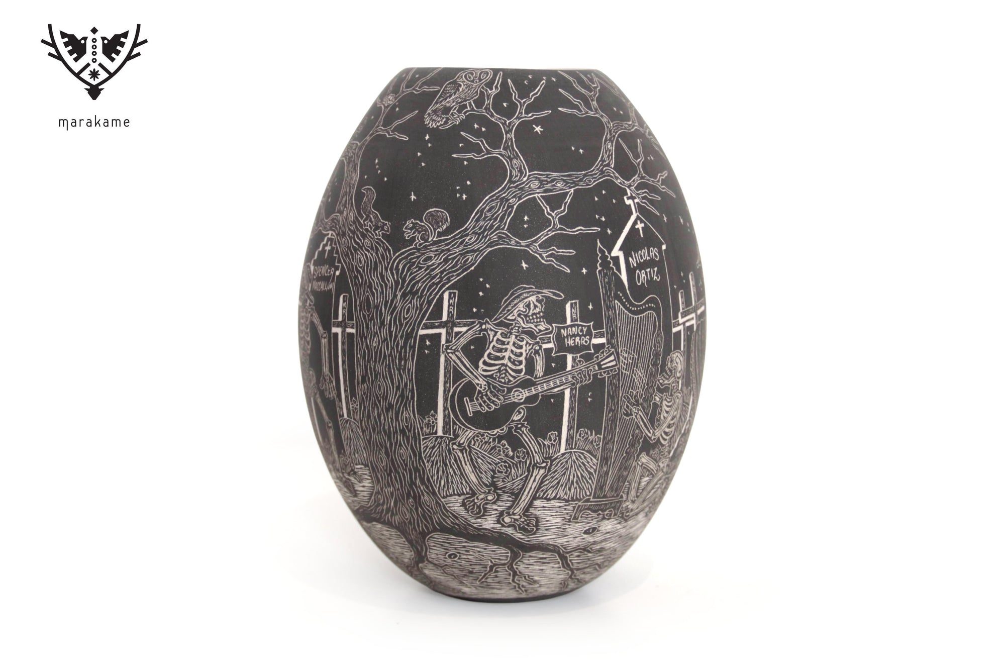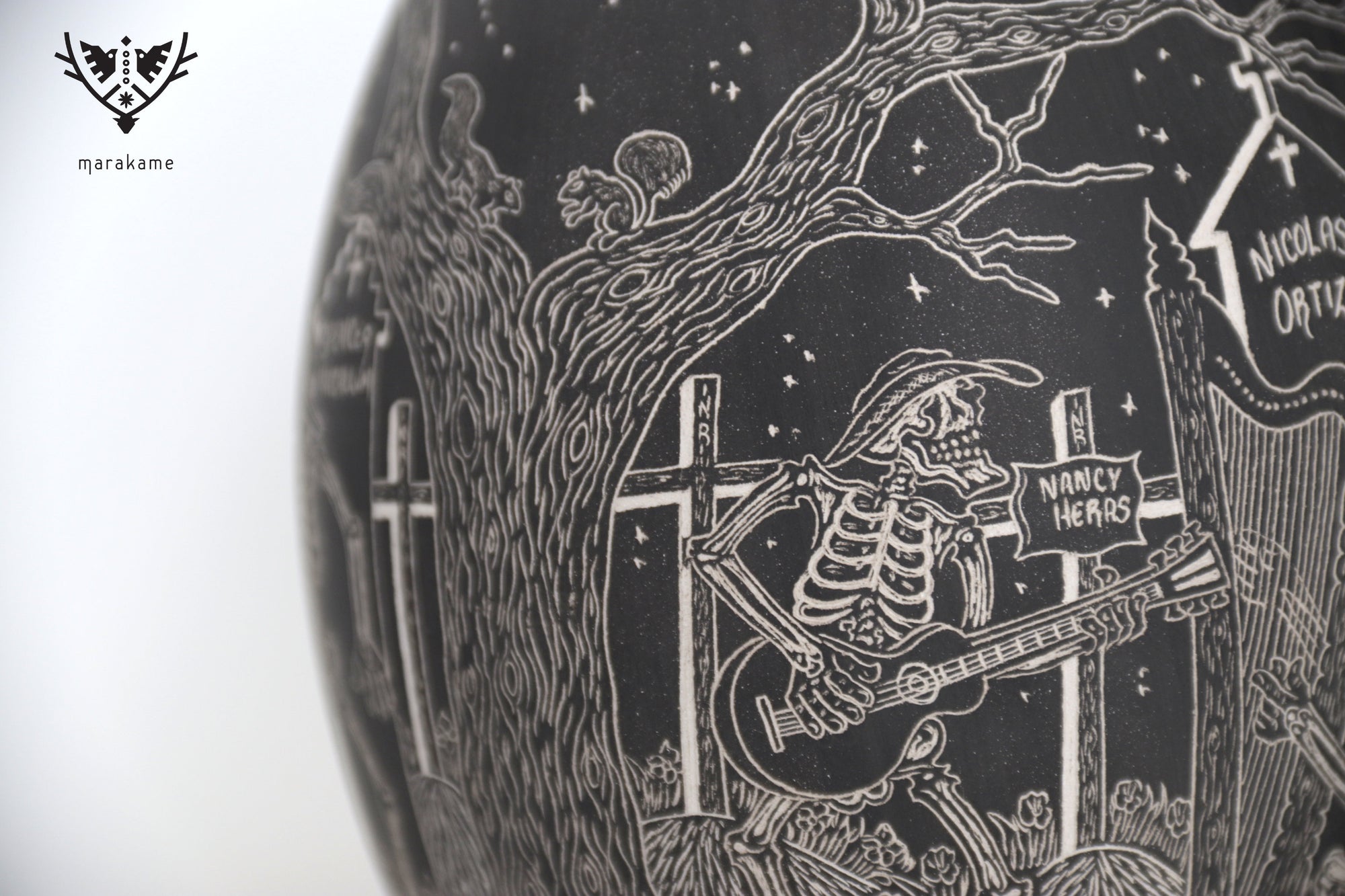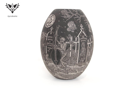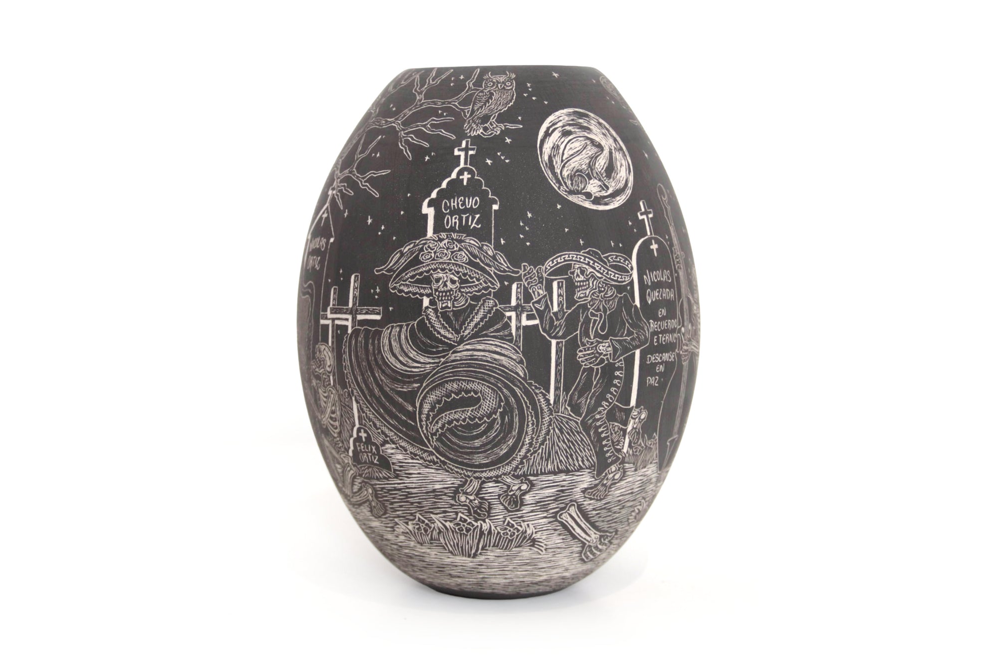 En esta pieza de cerámica de Mata Ortiz, inspirada en la iconografía del Día de Muertos y el imaginario funerario popular. En el centro aparece una calavera envuelta en un sarape y sombrero, caminando entre cruces y lápidas con nombres inscritos, como si recorriera un panteón bajo la luna.