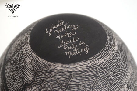 • Héctor Javier Martínez (Mata Ortiz, 1984) irrumpió en la escena alfarera de Mata Ortiz en el año 2008, con el estilo característico que lo distingue hasta el día de hoy: los motivos de la noche y el día de los muertos, en un modelo gráfico muy mexicano y personal. Éste fue resultado de una conversación que él sostuvo con el conocido coleccionista norteamericano Steve Rose. Héctor ha sido ganador del Premio Nacional de Cerámica en Tlaquepaque, Jalisco en 2014, y ha recibido reconocimientos importantes en el Concurso Anual de Cerámica en Mata Ortiz. Continúa con su labor colaborando con su compañera Gabriela Pérez, con quien comparte créditos en la firma de sus piezas.