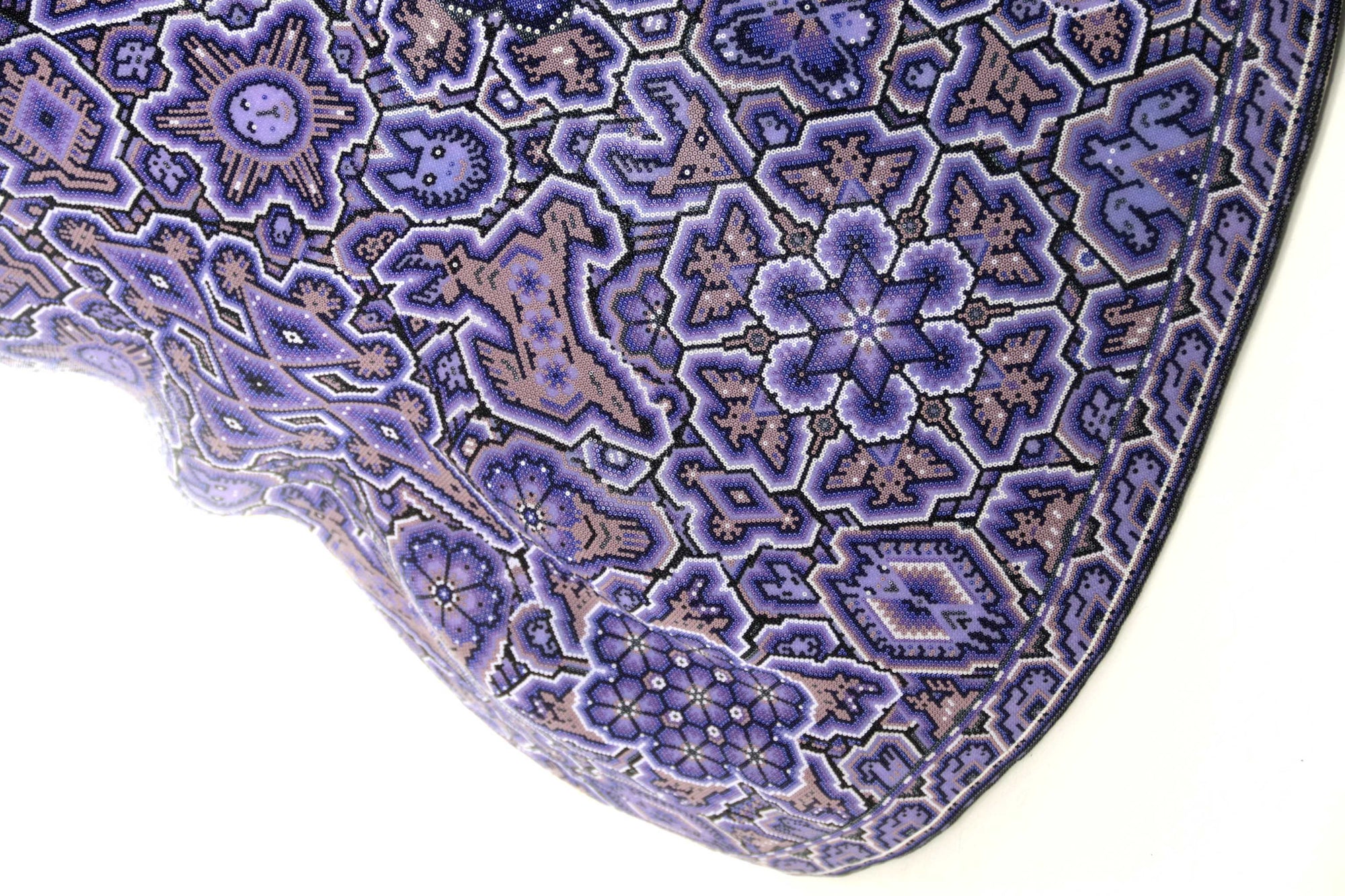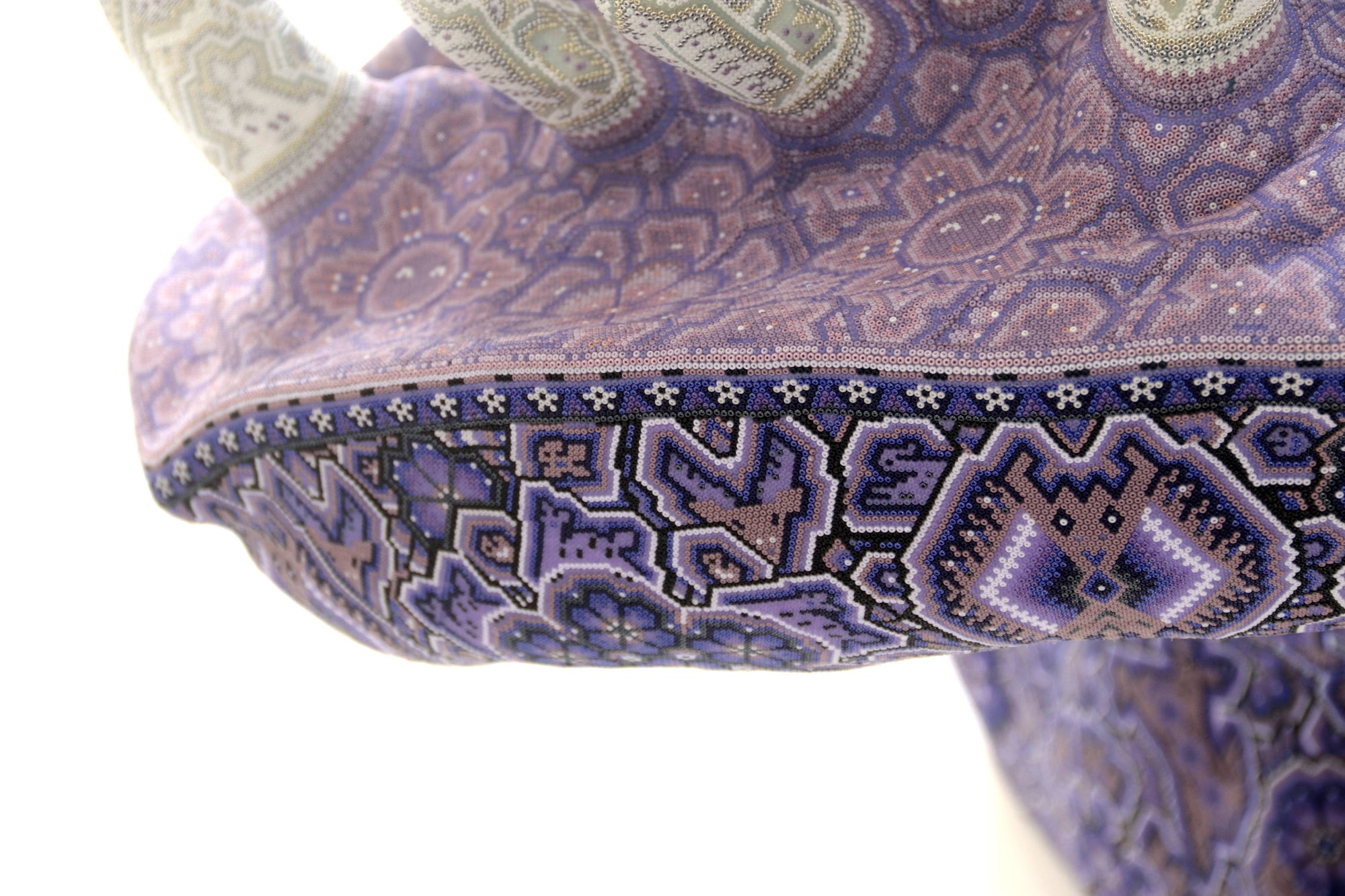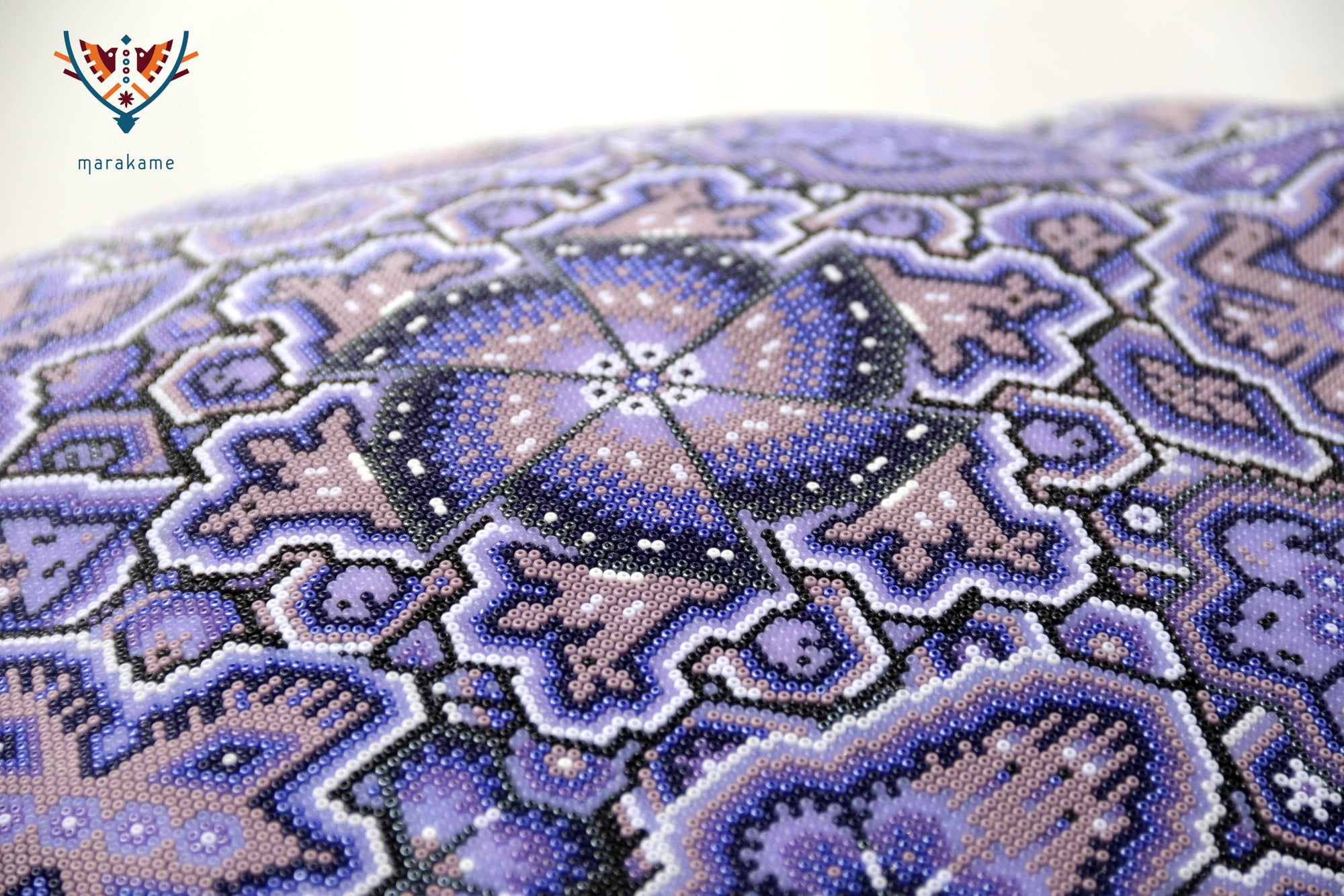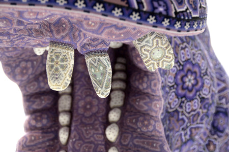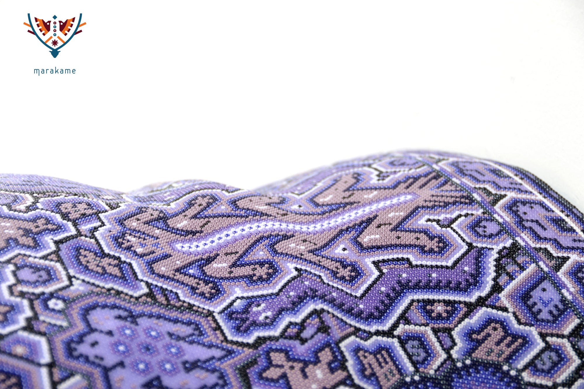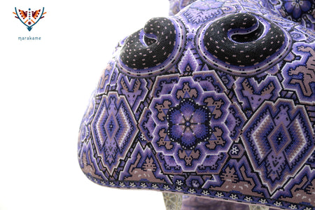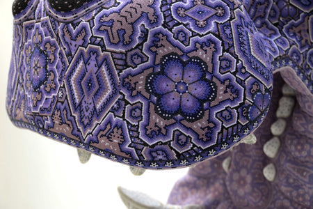 “Yurienaka niukieya” —La voz de la tierra— es una poderosa escultura huichola que representa la cabeza de un hipopótamo recubierta completamente con chaquiras aplicadas a mano. Su rugido simbólico evoca la energía primordial que conecta al ser humano con los elementos naturales. Los patrones geométricos y florales, característicos del arte wixarika, fluyen sobre la superficie en tonos violetas y lilas que aluden a la espiritualidad y al misterio del mundo interior. Esta obra es una alegoría de la fuerza contenida en la naturaleza, un recordatorio de que toda vida vibra con la misma voz ancestral de la tierra.