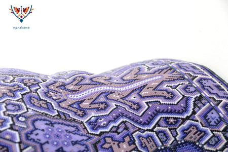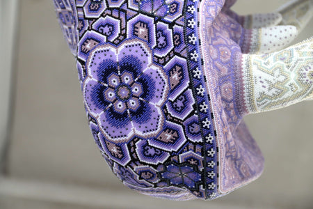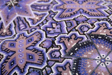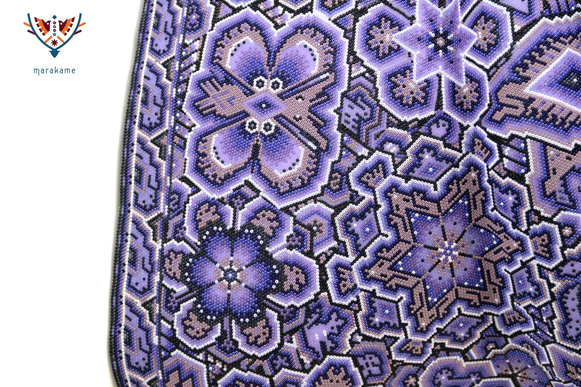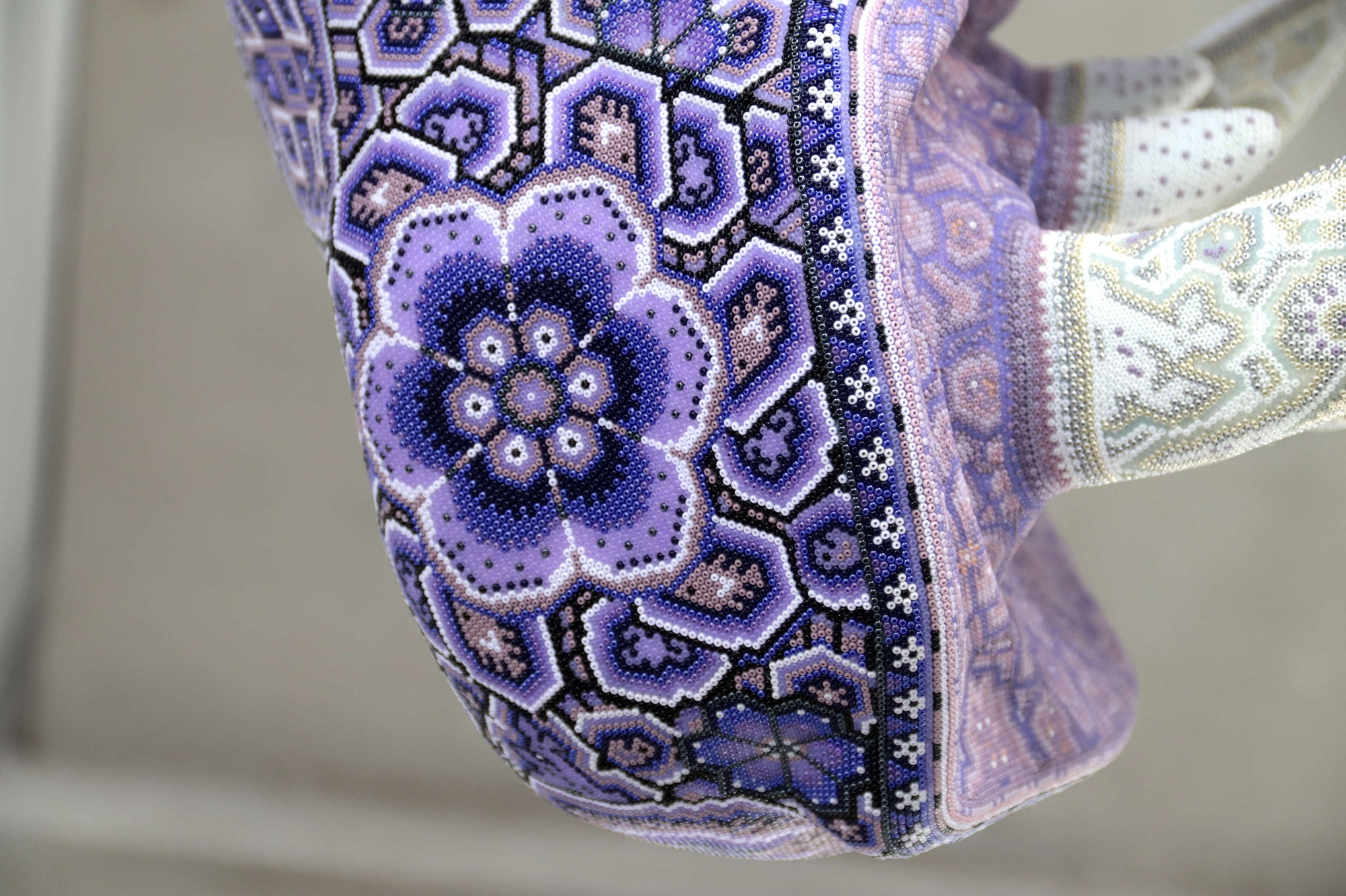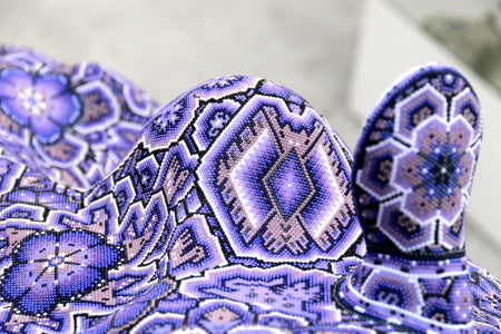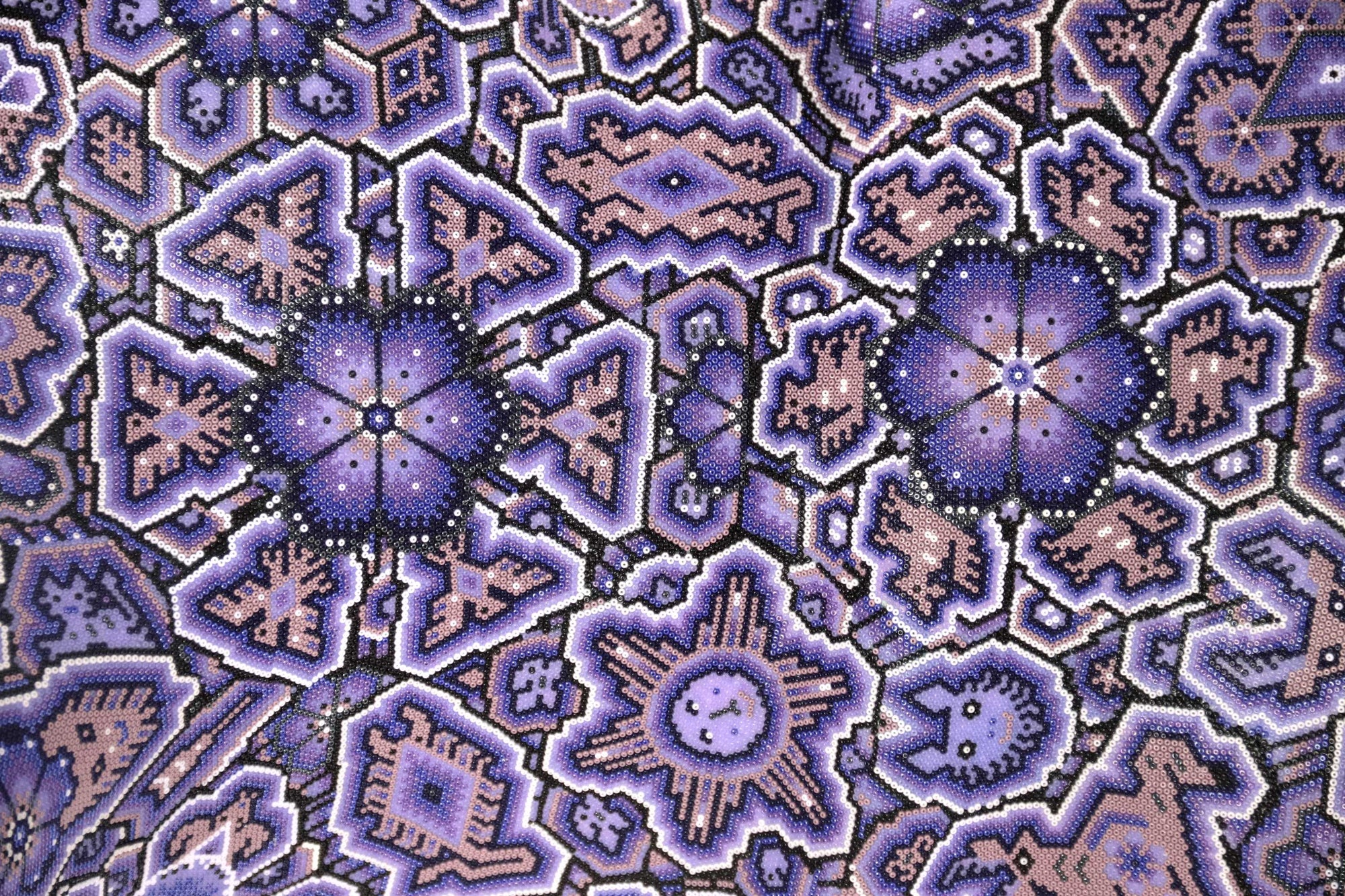 “Yurienaka niukieya” —La voz de la tierra— es una poderosa escultura huichola que representa la cabeza de un hipopótamo recubierta completamente con chaquiras aplicadas a mano. Su rugido simbólico evoca la energía primordial que conecta al ser humano con los elementos naturales. Los patrones geométricos y florales, característicos del arte wixarika, fluyen sobre la superficie en tonos violetas y lilas que aluden a la espiritualidad y al misterio del mundo interior. Esta obra es una alegoría de la fuerza contenida en la naturaleza, un recordatorio de que toda vida vibra con la misma voz ancestral de la tierra.