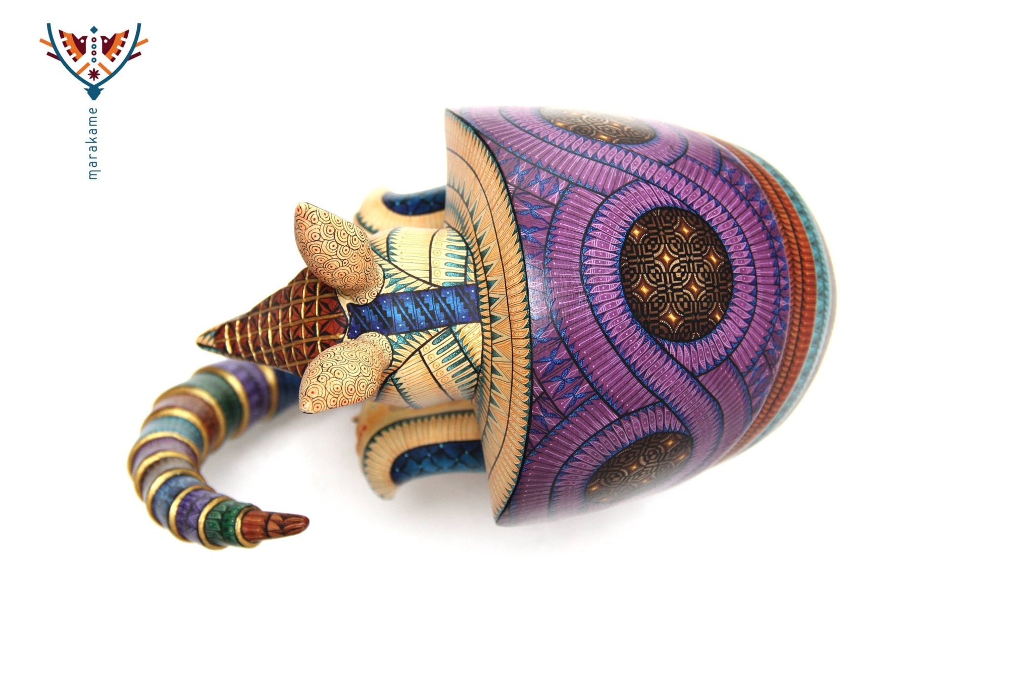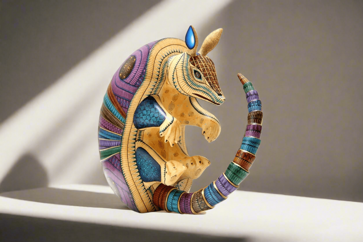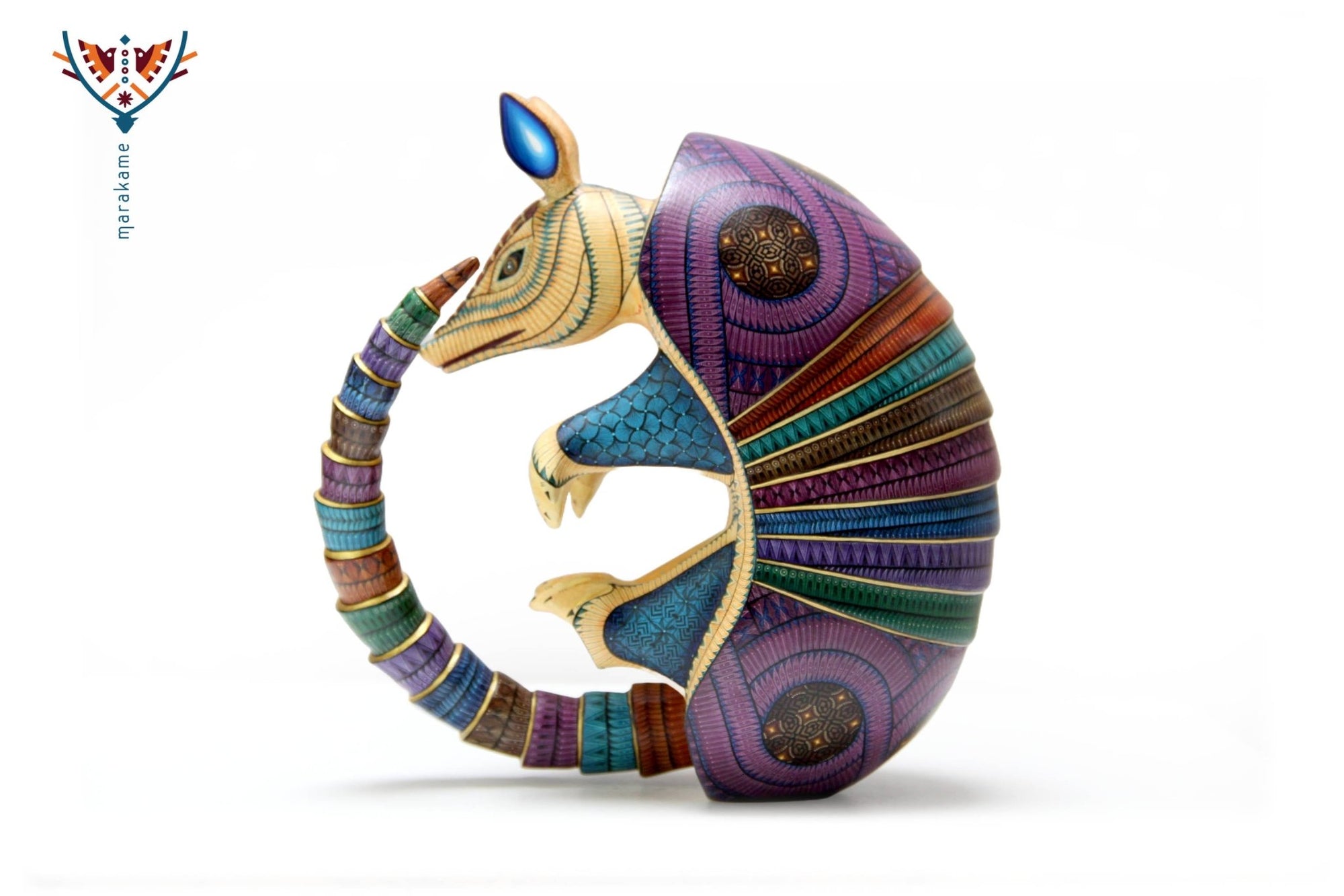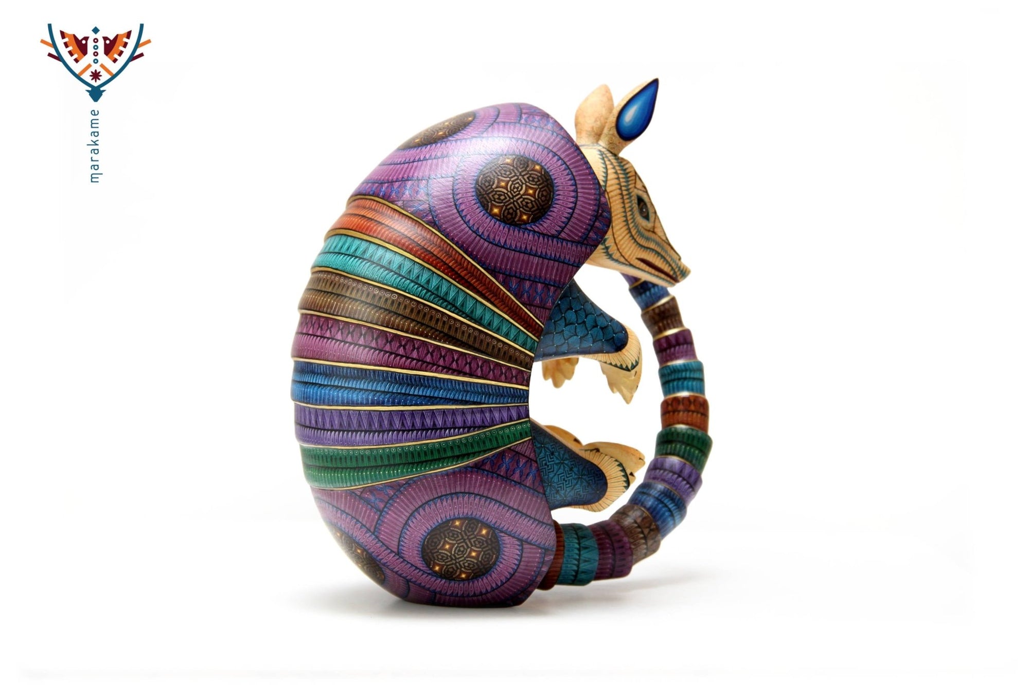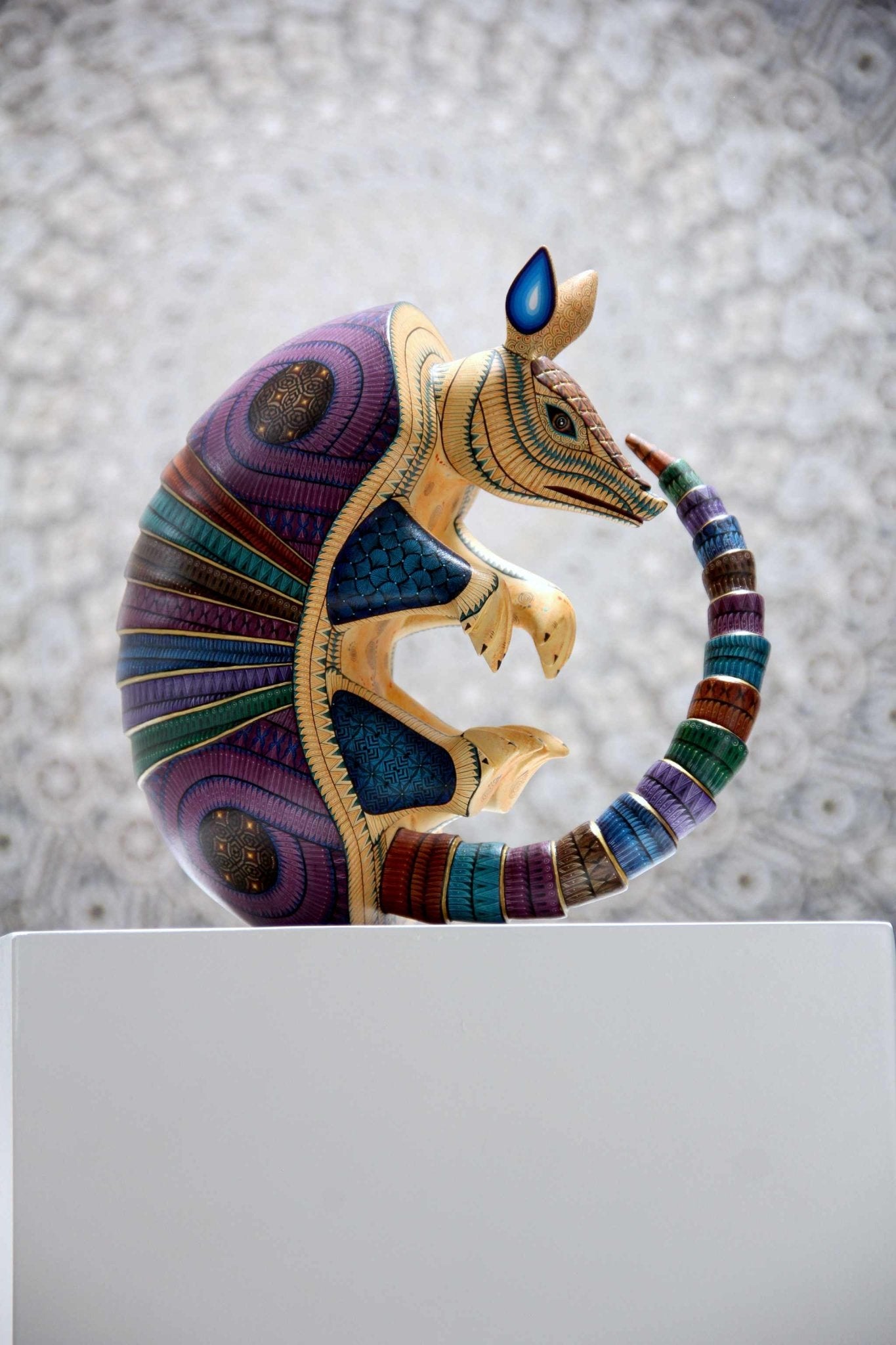 El caparazón morado es un contraste agradable con el fondo amarillo, y los colores intermedios que se distribuyen por todo el cuerpo del armadillo crean un efecto visual interesante. La cola, en particular, es una maravilla, con múltiples tonos que combinan la energía y la vitalidad. Los detalles de los símbolos zapotecos que adornan el alebrije son un testamento a la habilidad artística y la dedicación de los artesanos mexicanos que lo crearon.