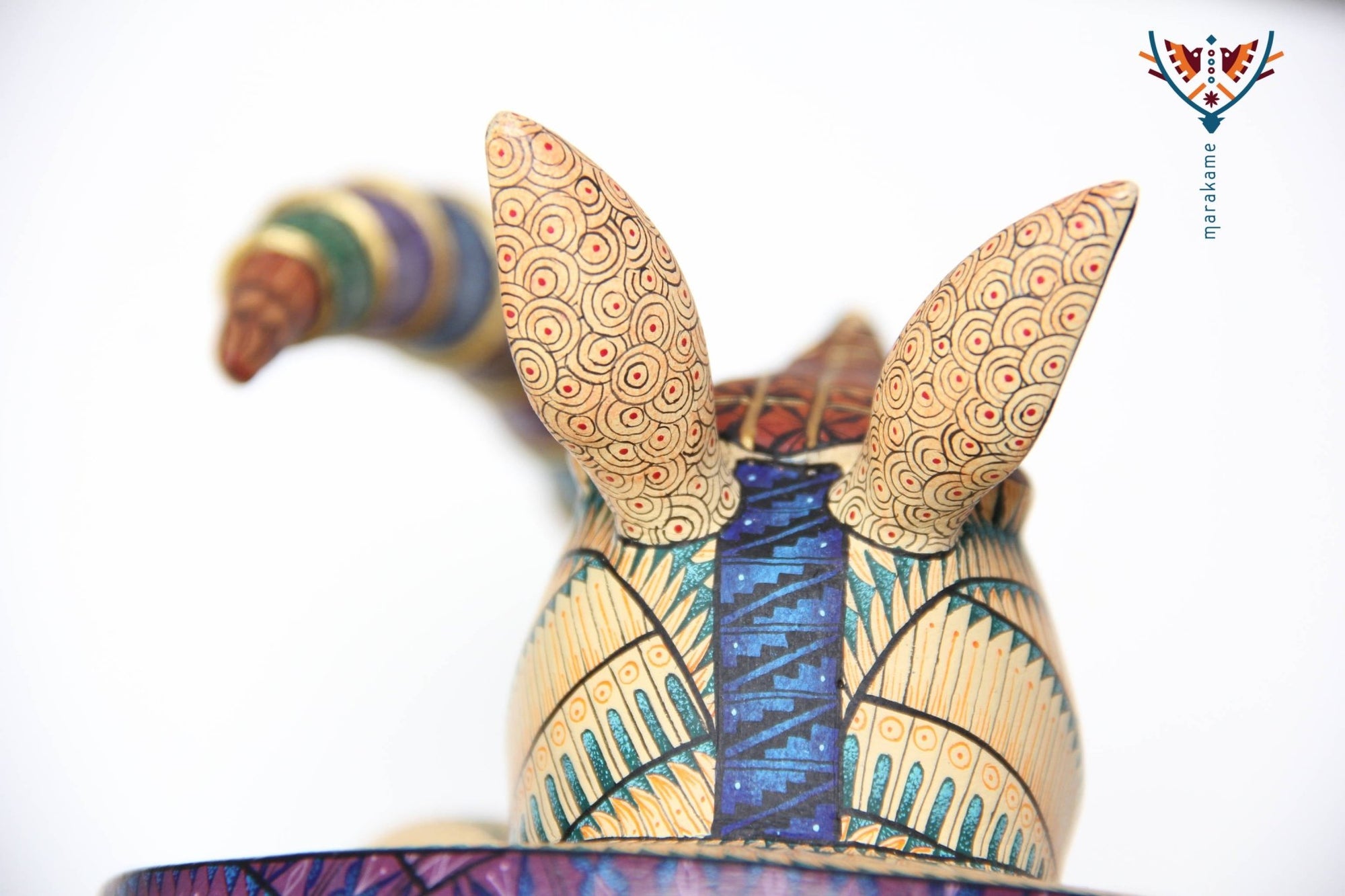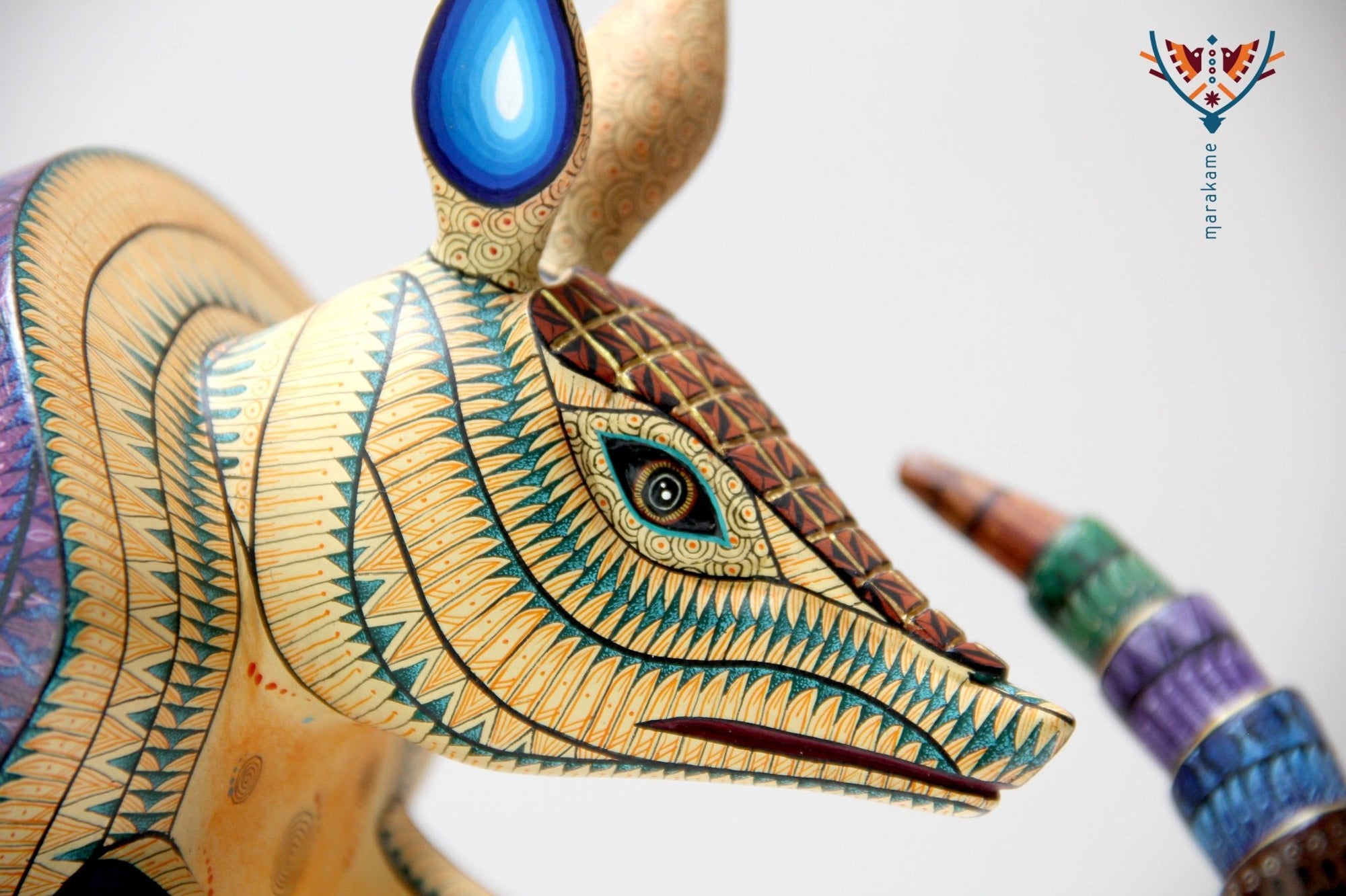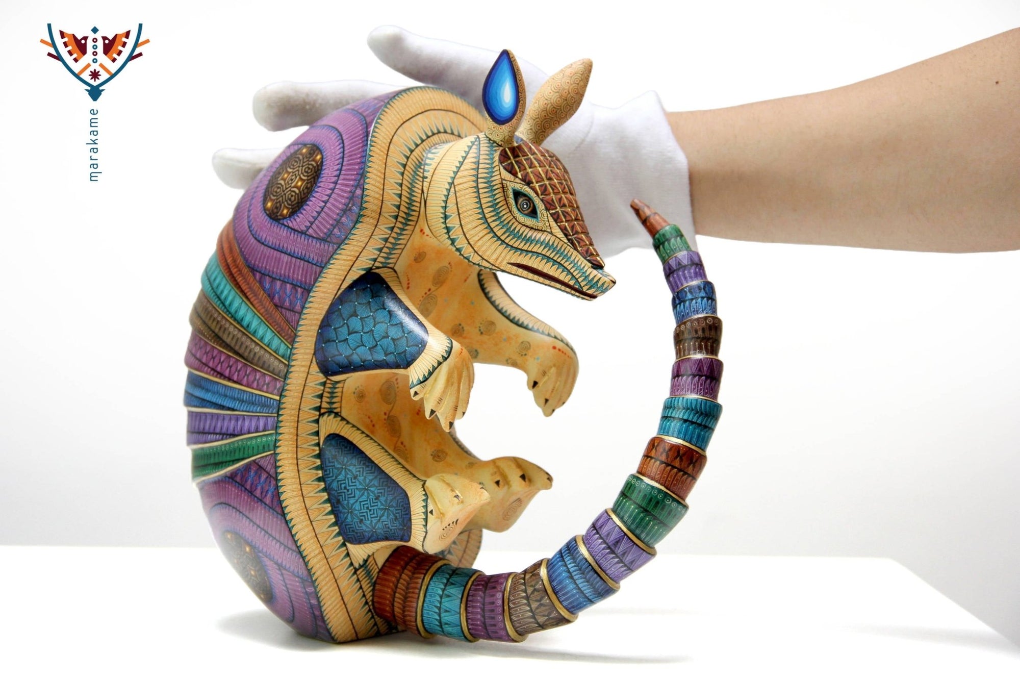 Este alebrije Armadillo es un verdadero ejemplo de belleza y creatividad. La figura del armadillo está pintada en tonos amarillos sobrios, como el color de la tierra, lo que le da un toque natural y rústico.