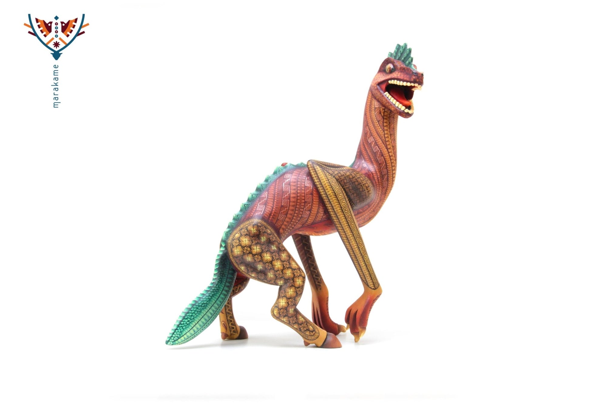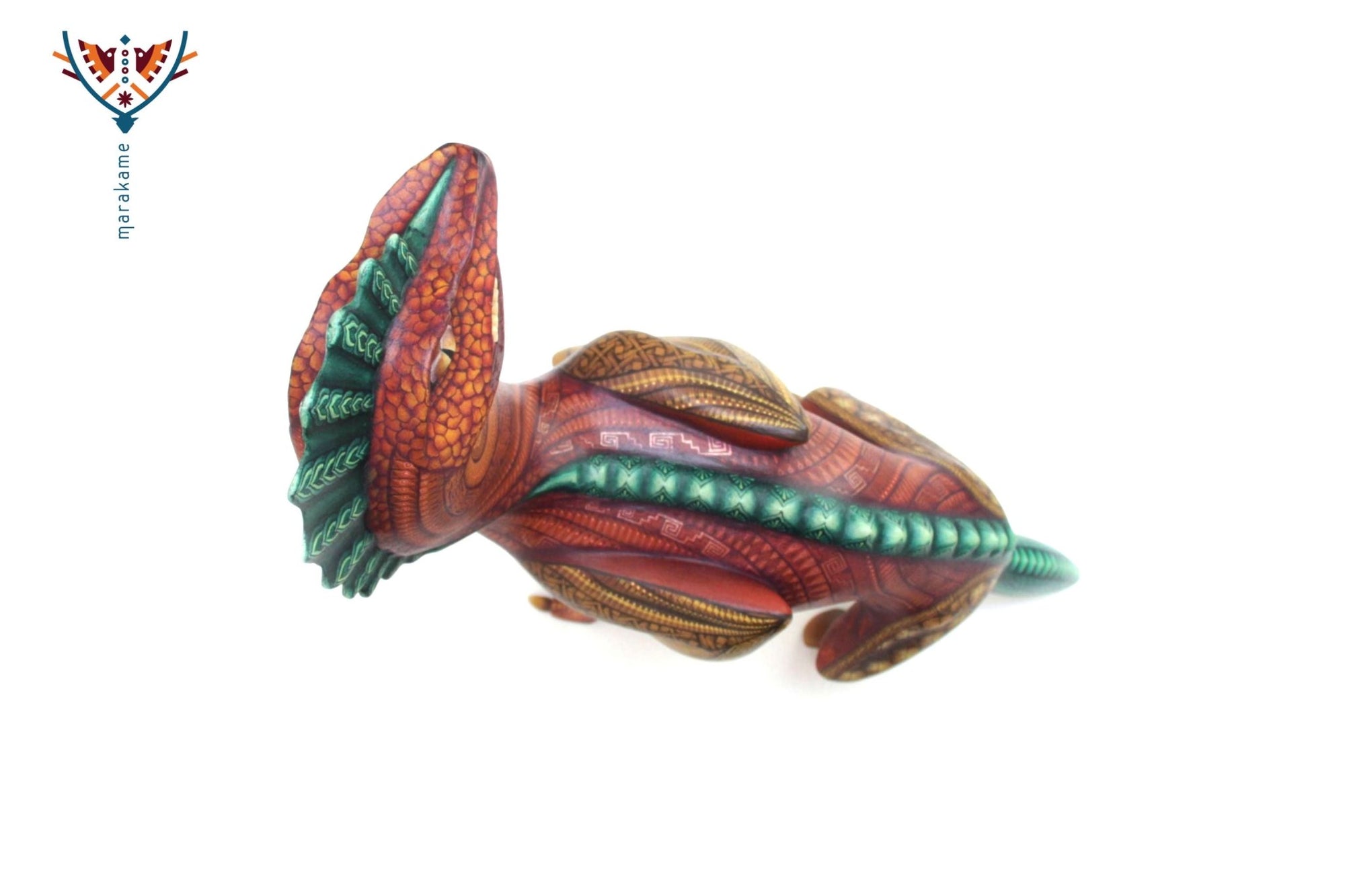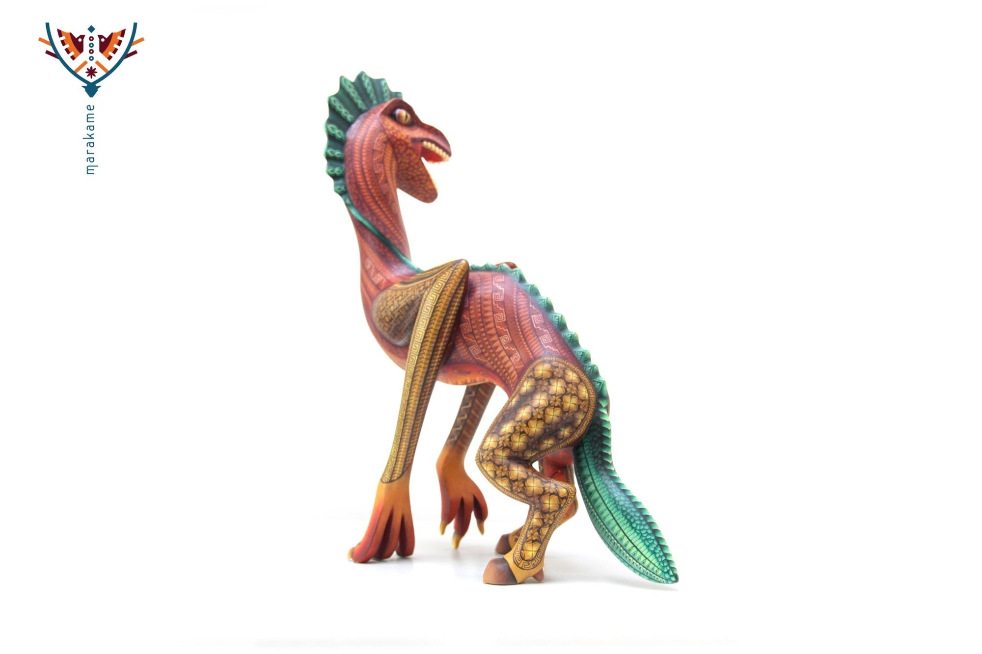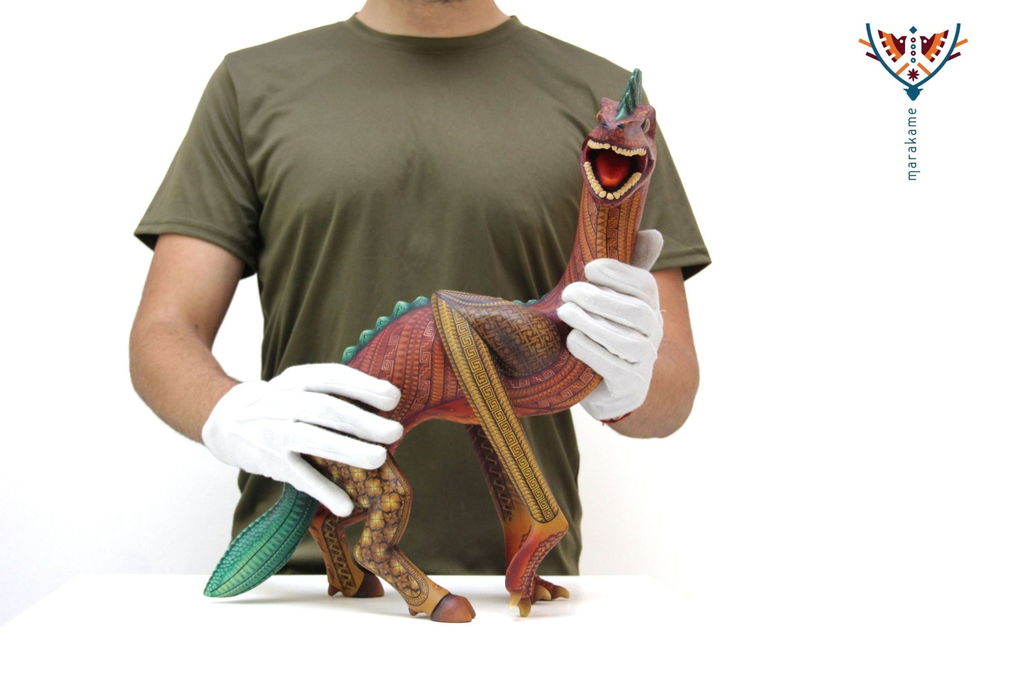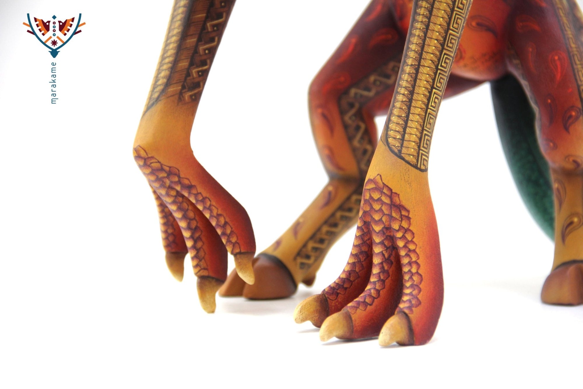 Este alebrije representa un dinosaurio que parece estar en plena acción, con expresiones agresivas y furiosas. La textura suave de la madera y la pintura a mano con técnicas tradicionales crean un efecto visual único y emotivo. El dinosaurio está adornado con colores cálidos, rojos y amarillos que le dan un toque de energía y pasión. La cresta y la cola verdes son los detalles más destacados de esta figura, y los ojos amarillos atractivos parecen brillar con una luz interior.