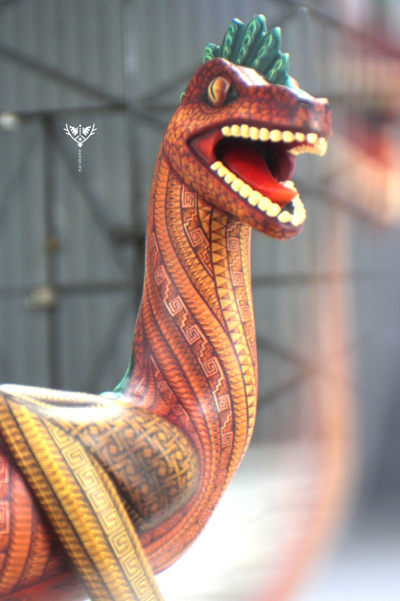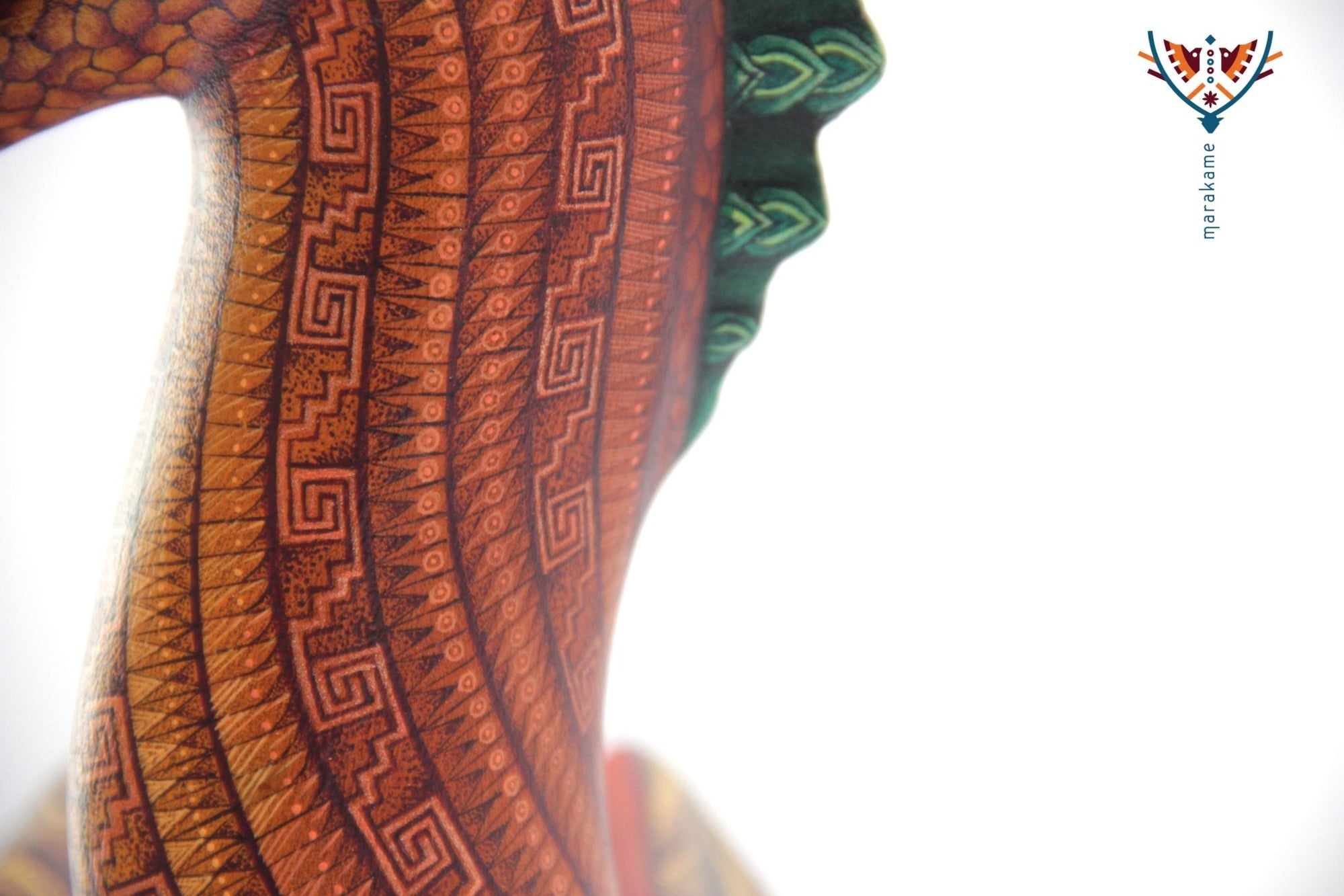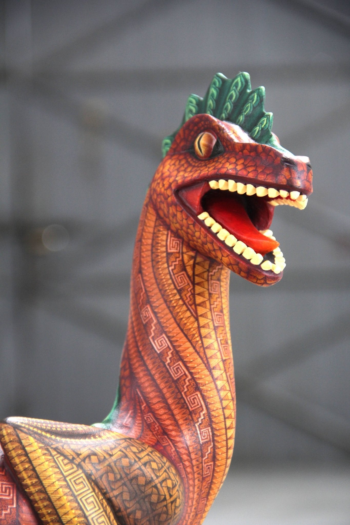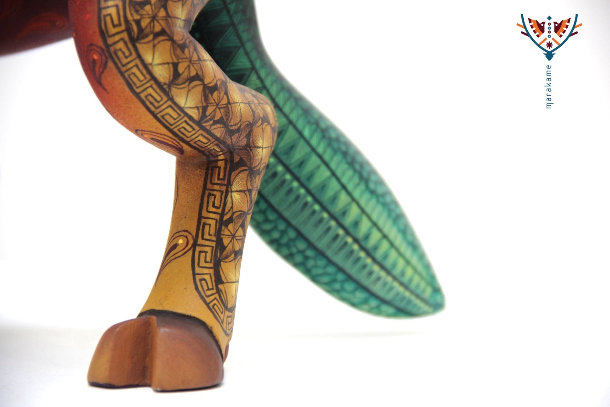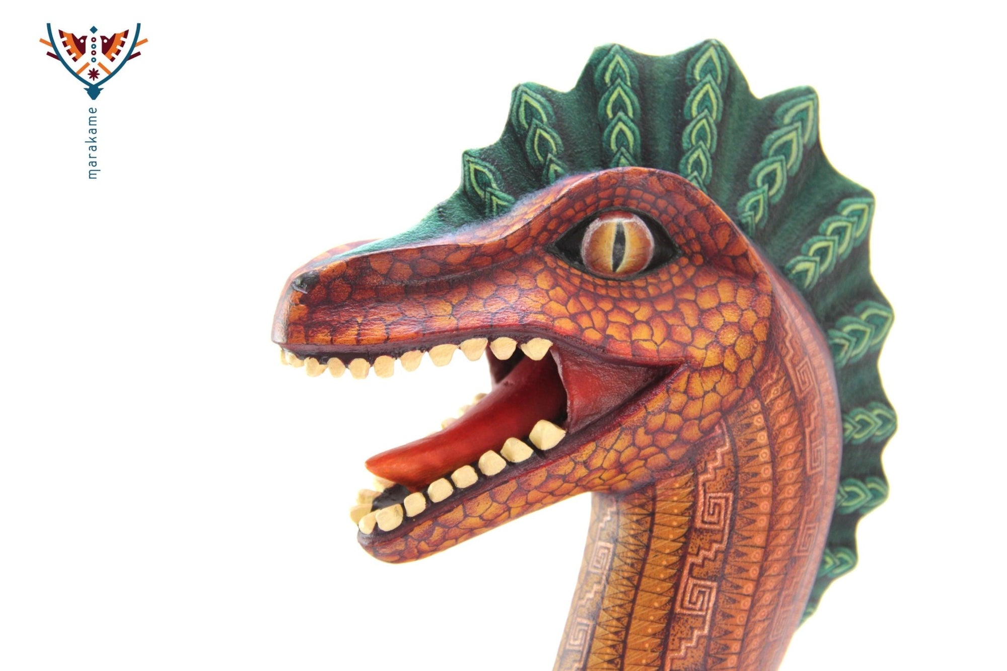 Este alebrije representa un dinosaurio que parece estar en plena acción, con expresiones agresivas y furiosas. La textura suave de la madera y la pintura a mano con técnicas tradicionales crean un efecto visual único y emotivo. El dinosaurio está adornado con colores cálidos, rojos y amarillos que le dan un toque de energía y pasión. La cresta y la cola verdes son los detalles más destacados de esta figura, y los ojos amarillos atractivos parecen brillar con una luz interior.