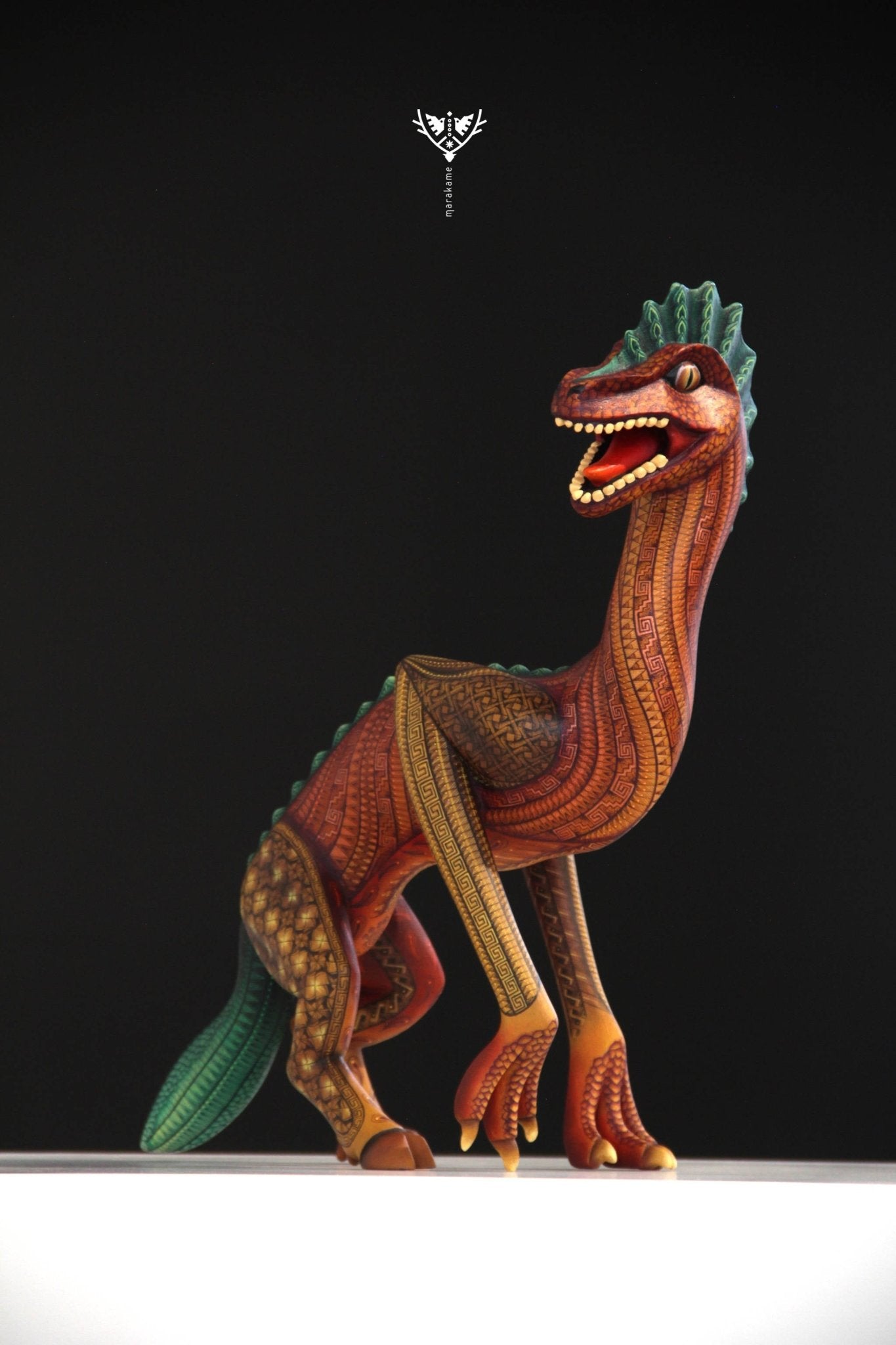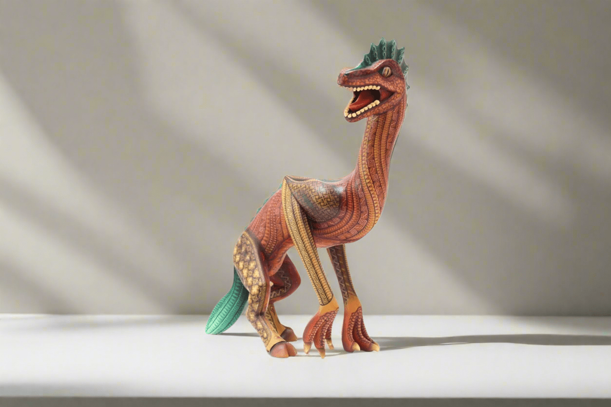 La postura agresiva y la expresión furiosa del dinosaurio invitan al espectador a sentir emoción y adrenalina. Es como si el alebrije mismo estuviera vivo, listo para atacar o defenderse en cualquier momento.