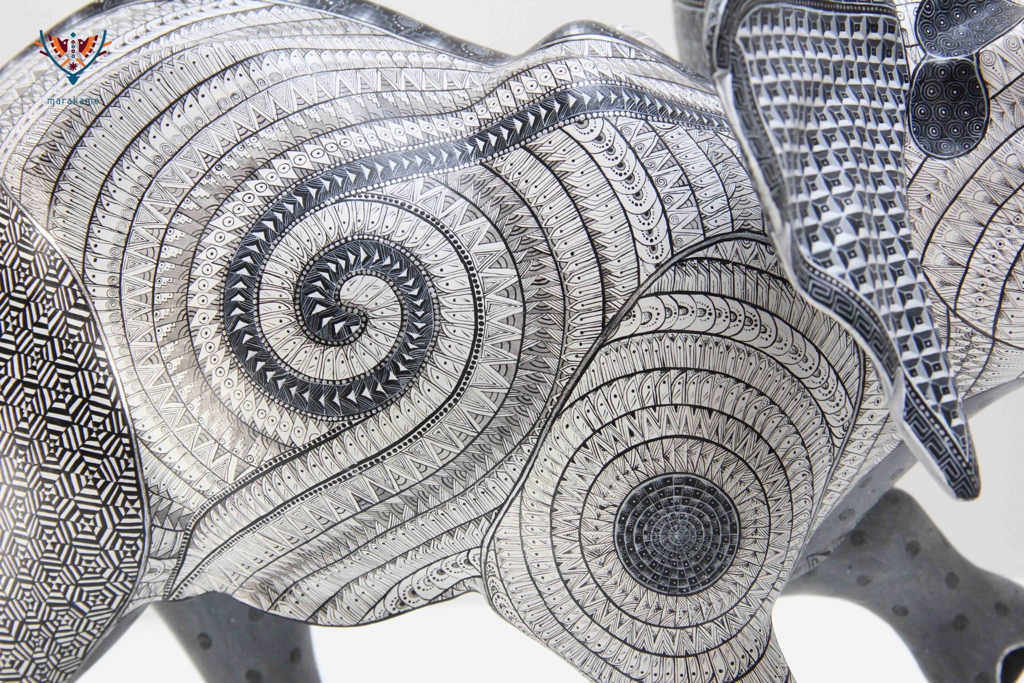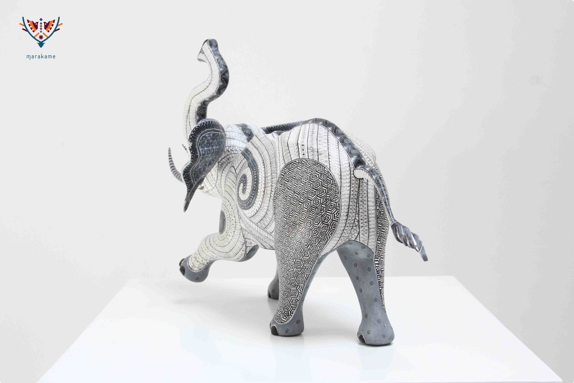 La espiral que va desde la cabeza hasta el centro del cuerpo del elefante crea un efecto visual dinámico y emocionante. Los detalles texturizados de los símbolos zapotecos en el cuerpo del alebrije añaden una capa de significado profundo y riqueza cultural. El alebrije está en pose de caminata, como si estuviera explorando el terreno y descubriendo nuevos horizontes. La forma en que la trompa del elefante hace sonido es un toque especial que agrega movimiento y vida a la pieza.