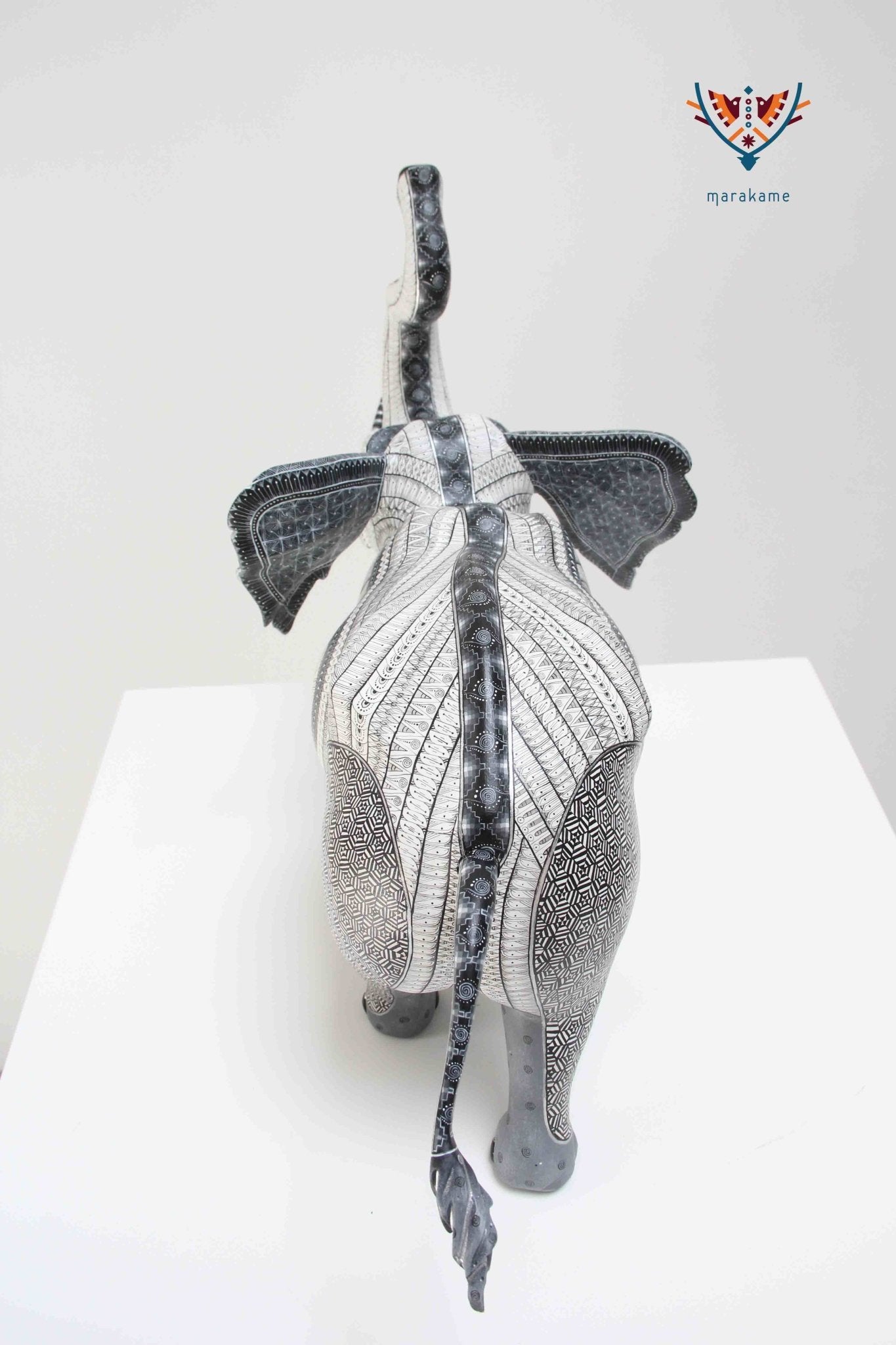 Este Alebrije Elefante Huaniisi es una pieza artística impresionante que combina la tradición de los alebrijes mexicanos con el simbolismo zapoteca. El alebrije mayormente blanco es un homenaje a la pureza y la inocencia, mientras que los detalles en negro y grises azulados añaden profundidad y complejidad.
