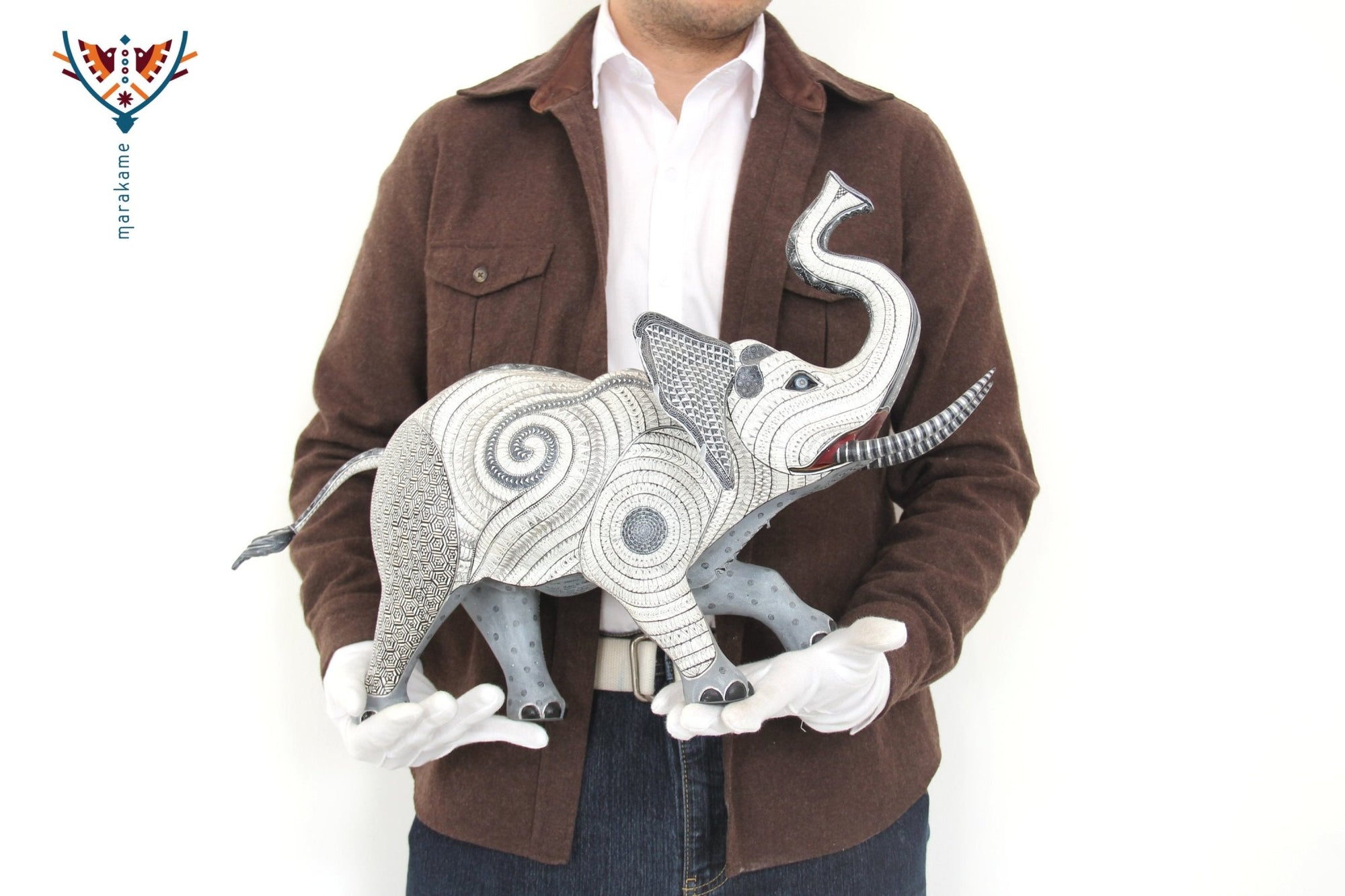 Esta selección especial de Alebrije oaxaqueño comisionada por Marakame a los mejores autores de alebrije moderno, es pintado a mano sobre talla en madera del árbol de copal (Bursera, spp), el cual crece a los alrededores de las comunidades de San Martín Tilcajete y San Antonio Arrazola, localidades de la región Zapoteca del Estado de Oaxaca, en el Sur de México. También se utiliza de forma común la talla en madera de cedro por las características de esta madera.