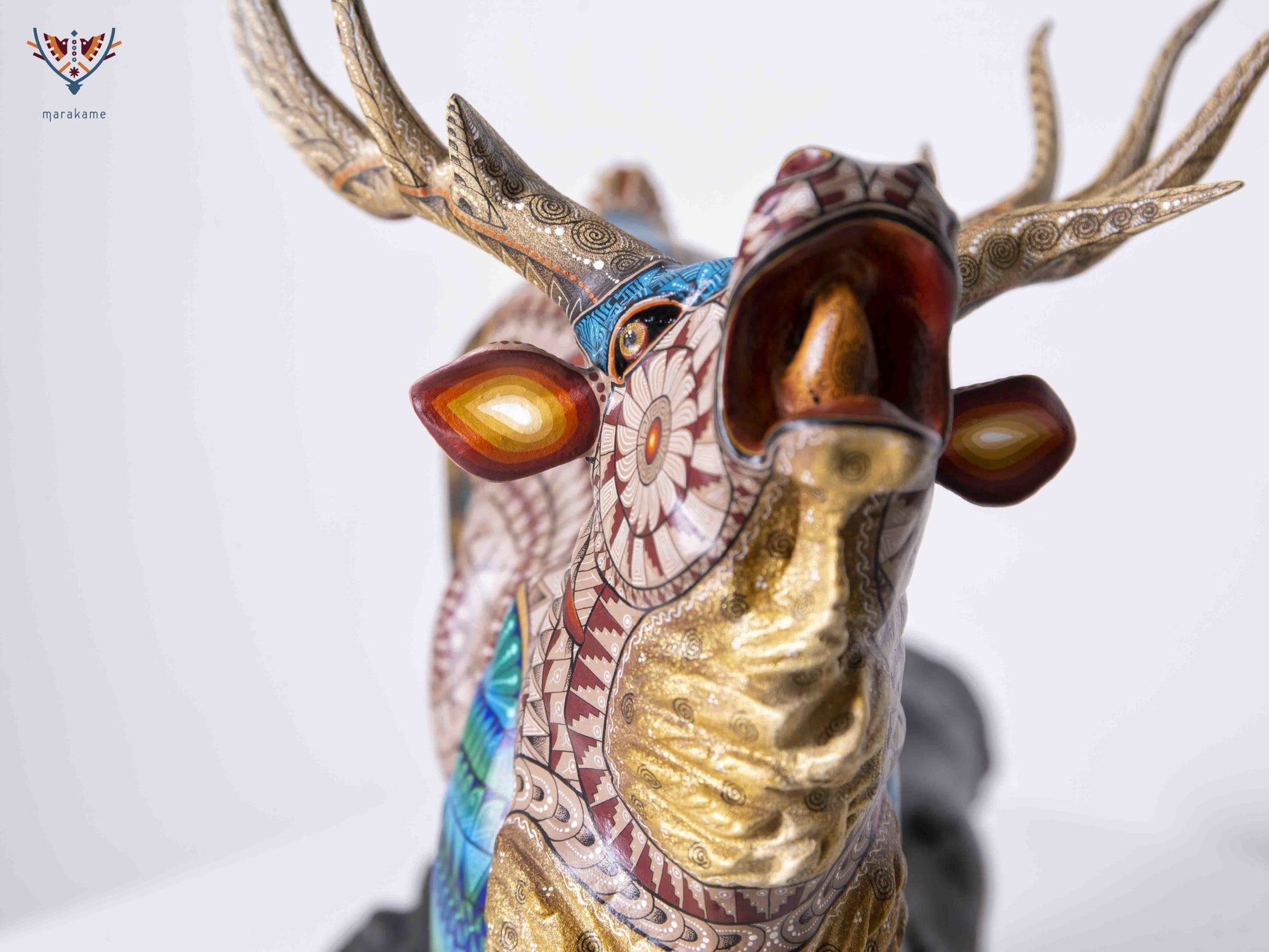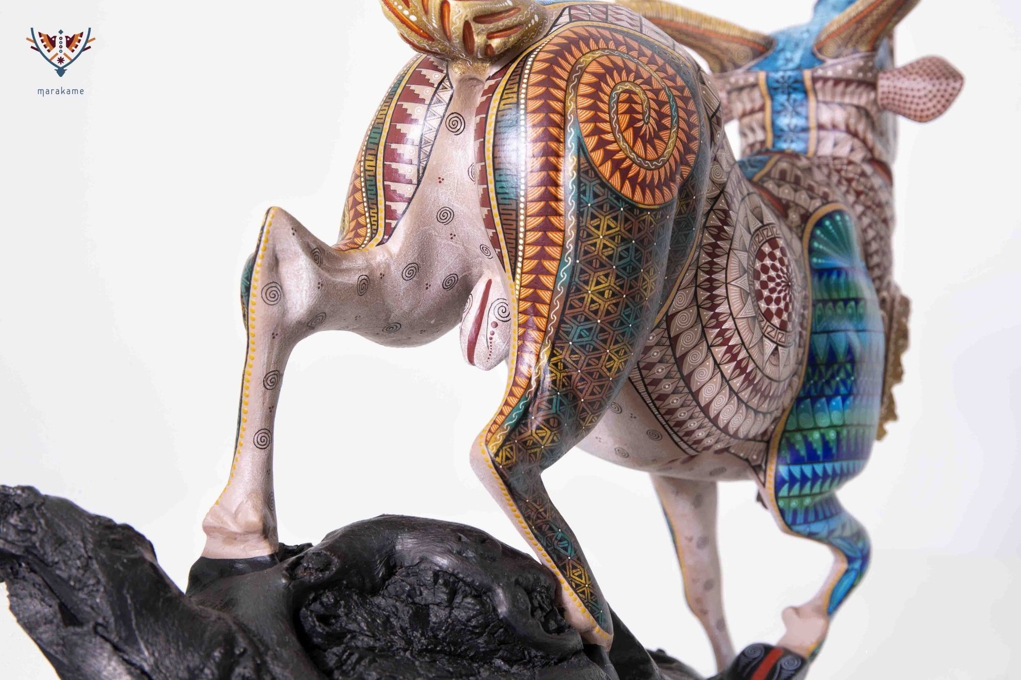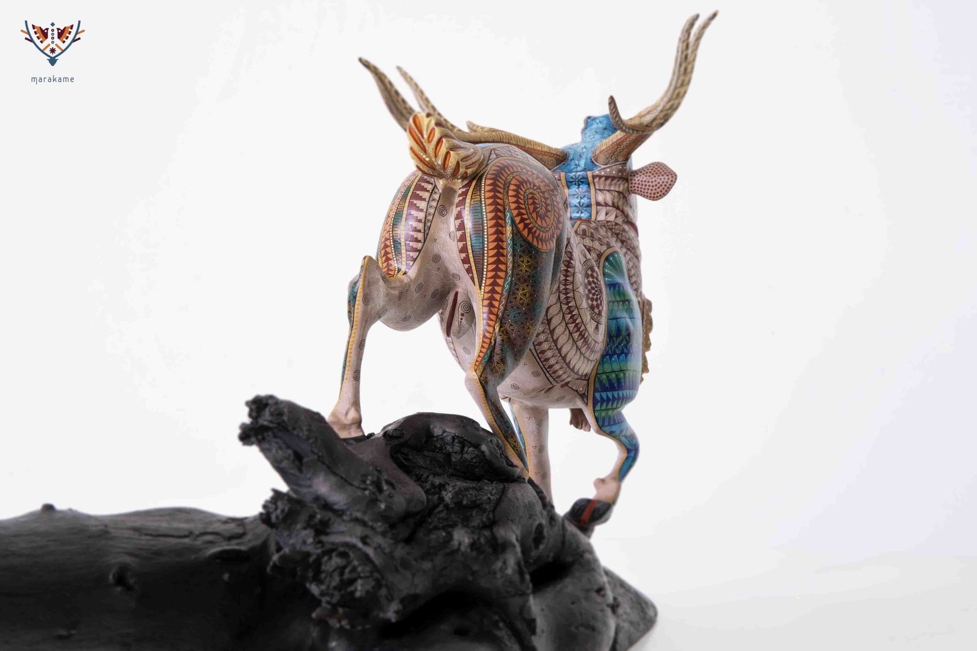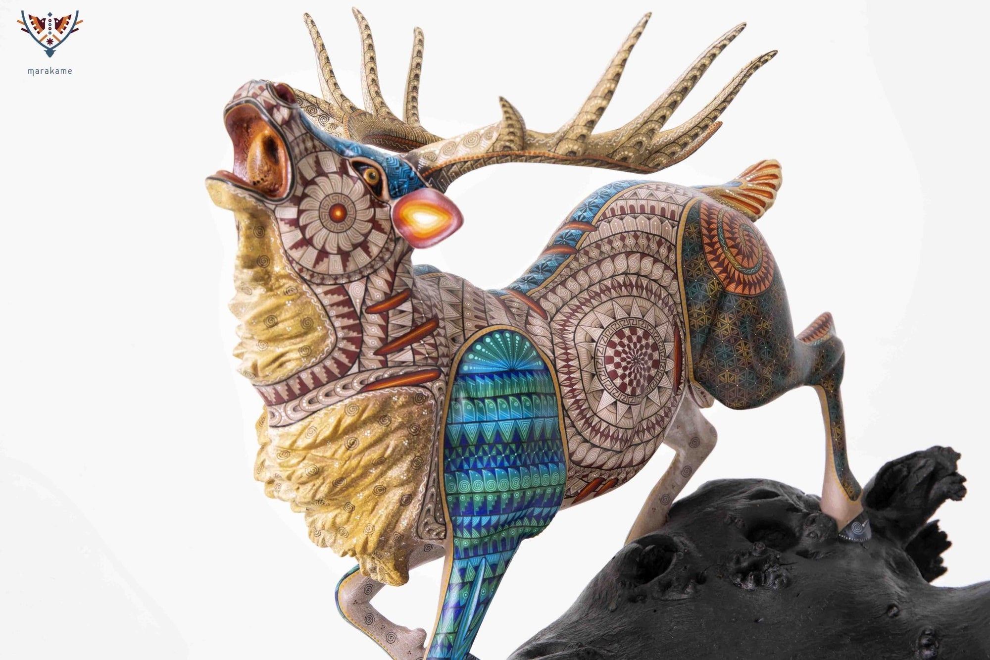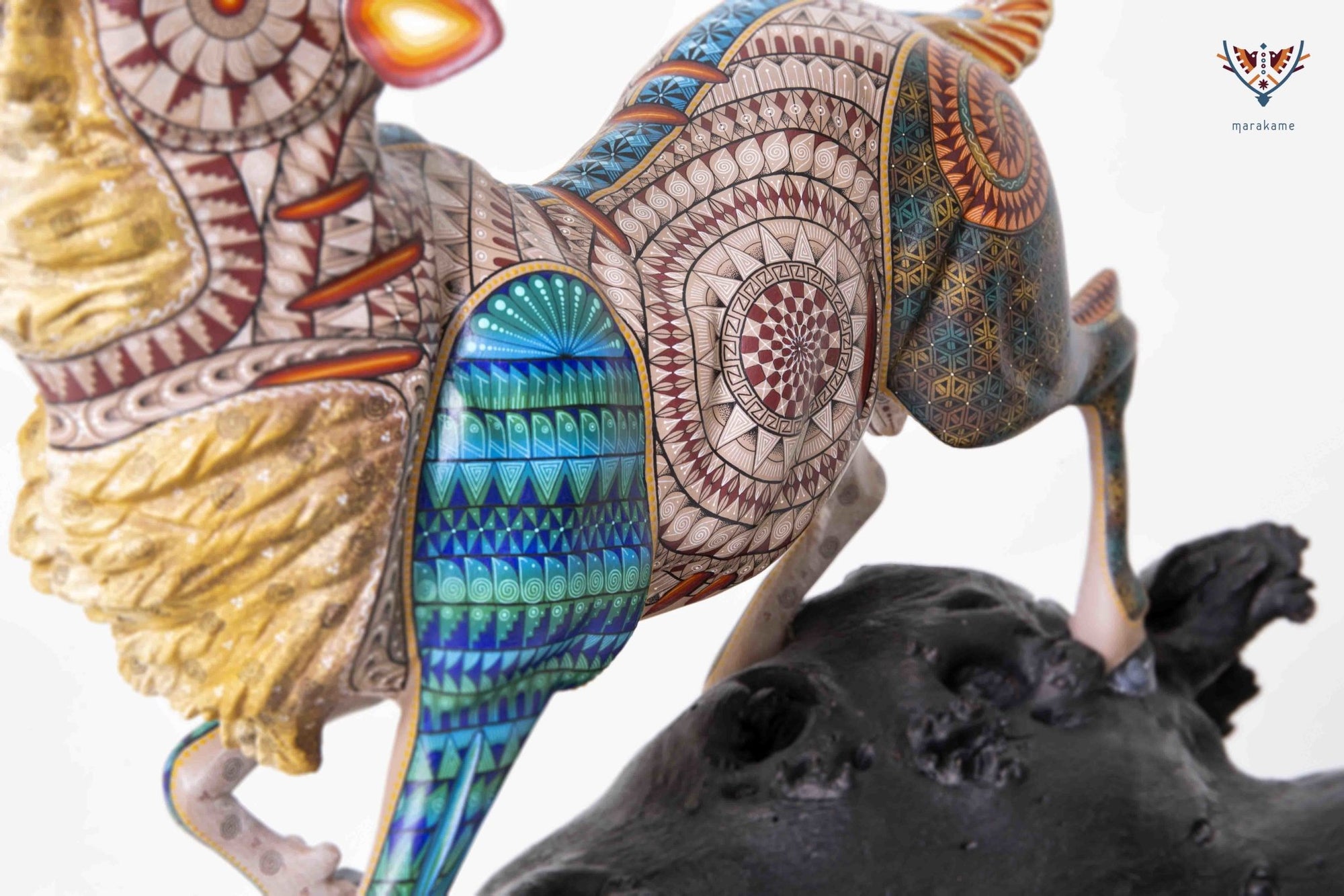 Esta selección especial de Alebrije oaxaqueño comisionada por Marakame a los mejores autores de alebrije moderno, es pintado a mano sobre talla en madera del árbol de copal (Bursera, spp), el cual crece a los alrededores de las comunidades de San Martín Tilcajete y San Antonio Arrazola, localidades de la región Zapoteca del Estado de Oaxaca, en el Sur de México.