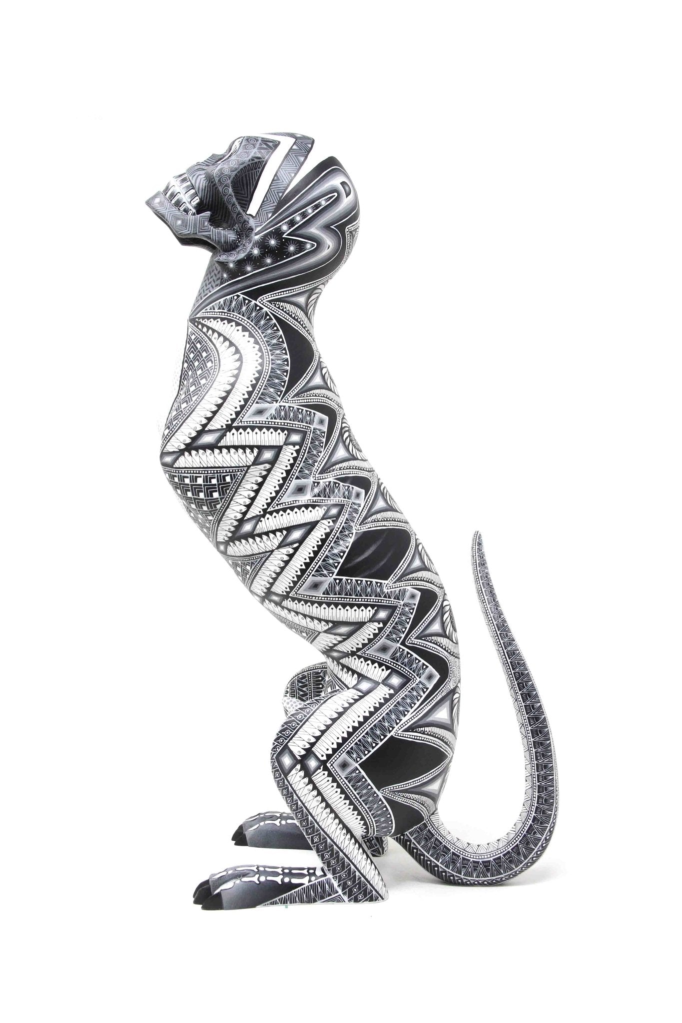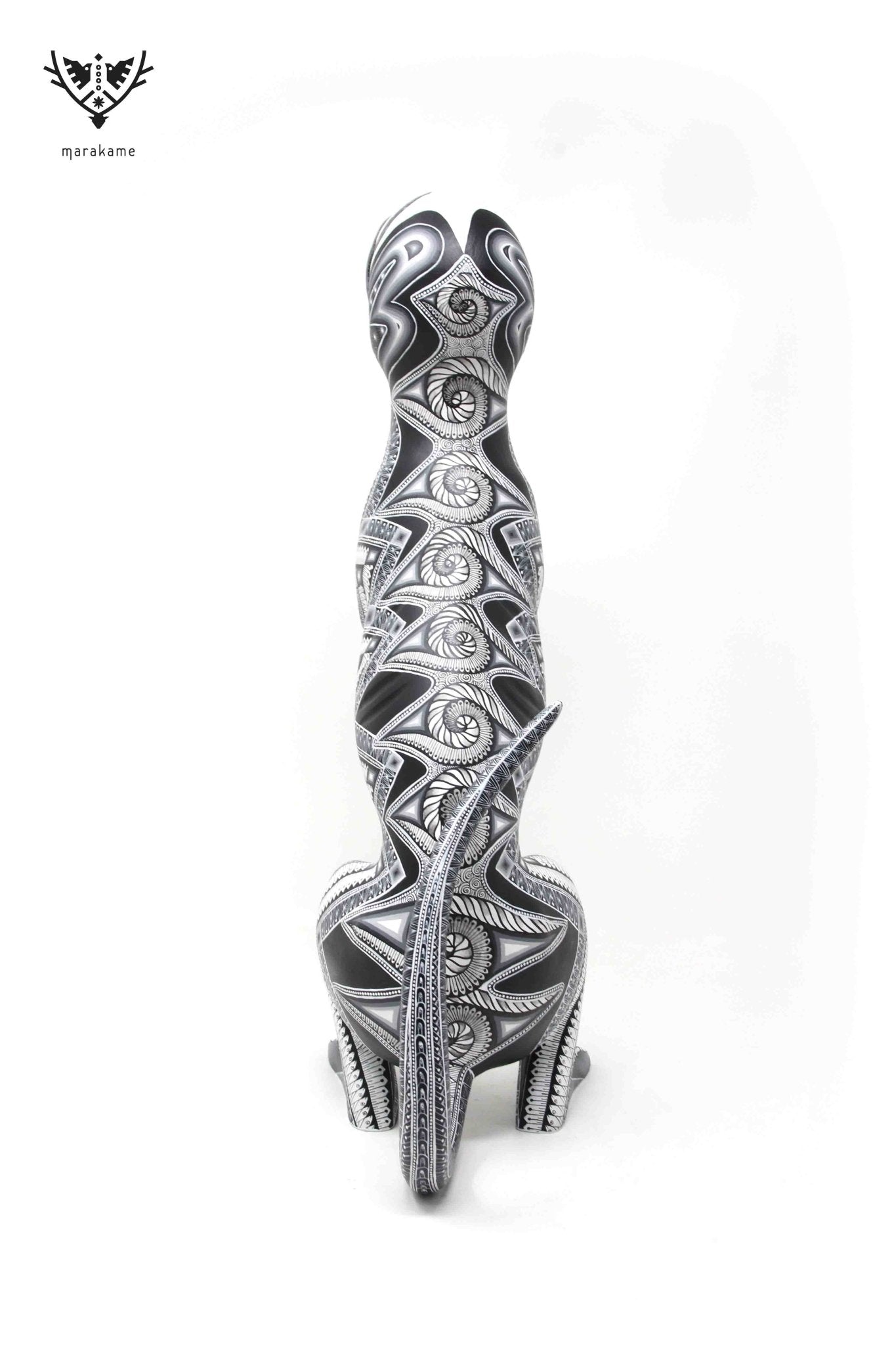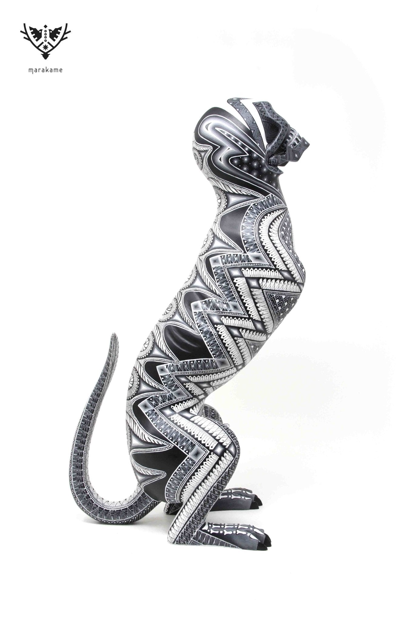 "Este año tuvimos la oportunidad de crear una nueva propuesta llamada “Eterno reposo”, es en honor al día de muertos y a los altares. Este año se lo dedicamos a orejas una perra Xoloitzcuintle que nos ayudó durante muchos años a dar felicidad a la familia. Este año murió y en honor a ese perro tan hermoso que es el número 10 del calendario zapoteca, que significa buen amigo, buena esperanza, buena ayuda, es un nombre de carácter fuerte y enemigo de las injusticias. Hicimos estos 3 en sus diferentes formas de hacer los xoloitzuintles. Por ejemplo hicimos el de cráneo humano con cuerpo de xoloitzcuintle porque pensamos que es el animal que te ayuda espiritualmente a descansar en el inframundo. En la religión piensan que es el que cruza el río Jordán y para los zapotecos es en el día de muertos."