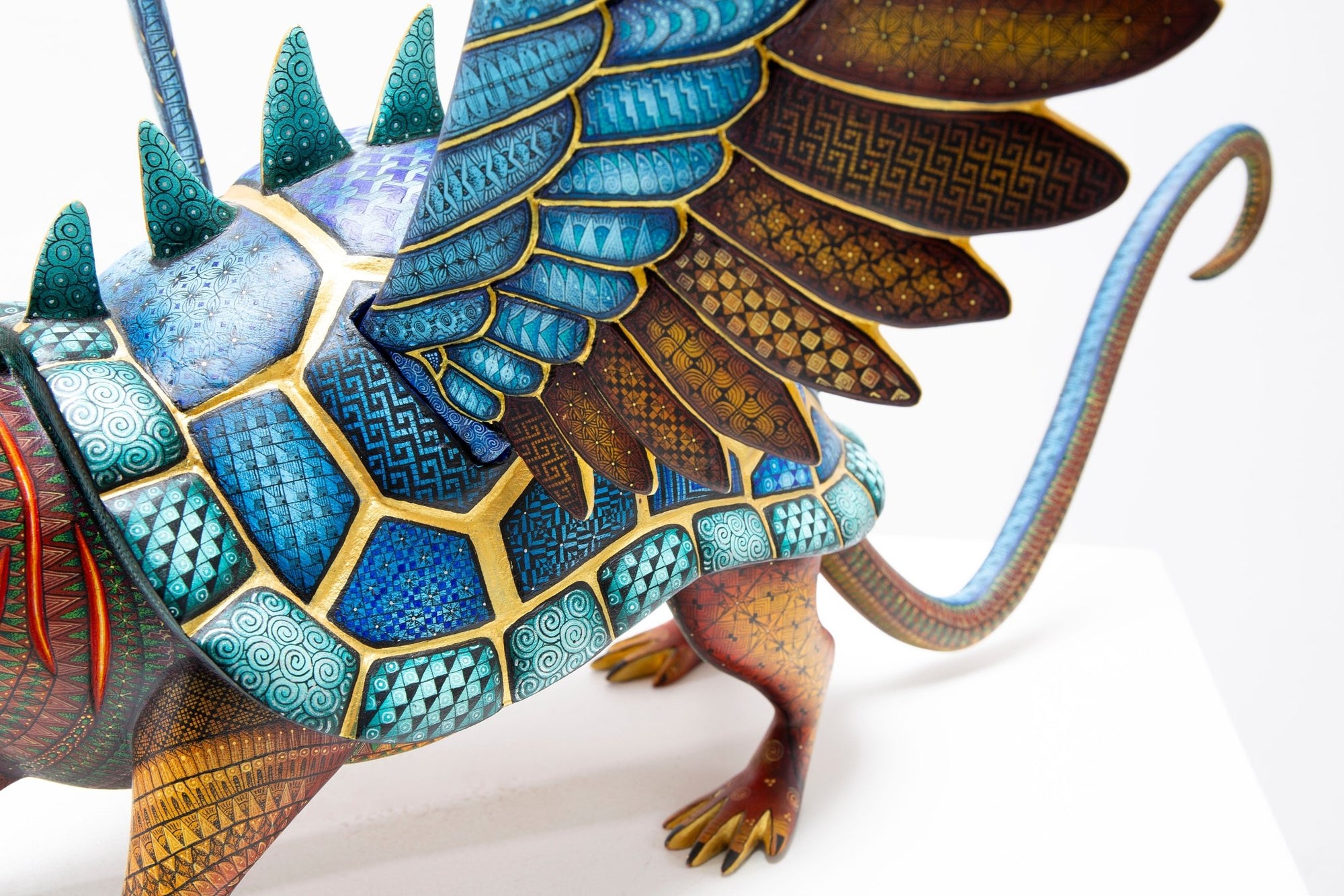 El Alebrije Fusión Tortuga Iguana Águila Chango es una obra de arte tallada en madera de copal y pintada a mano. La iguana es el centro de atención, con alas azules y amarillas que se fusionan en un diseño vibrante. El caparazón mayormente azul está adornado con espinas turquesas que reflejan la rica cultura indígena zapoteca. Los detalles pintados incluyen símbolos tradicionales zapotecos que adicionan profundidad y significado a esta pieza única. La pintura a mano con técnicas tradicionales ha sido utilizada para crear un trabajo de arte que combina texturas suaves y vivos colores.