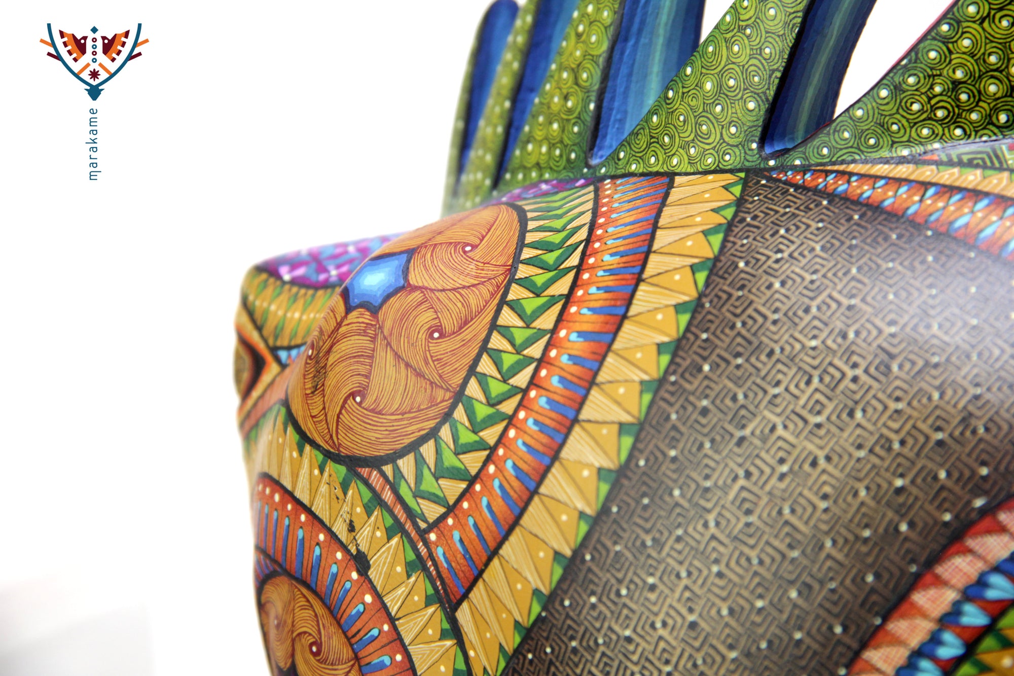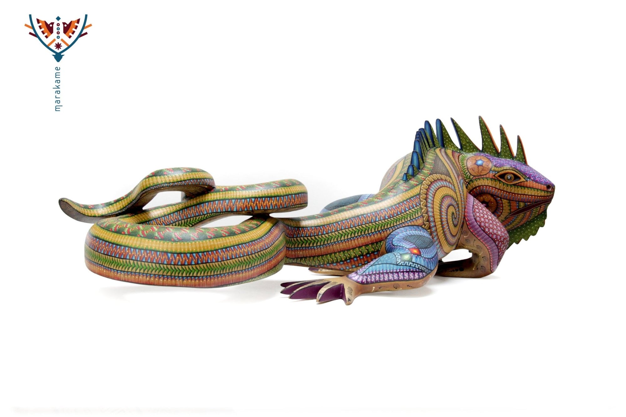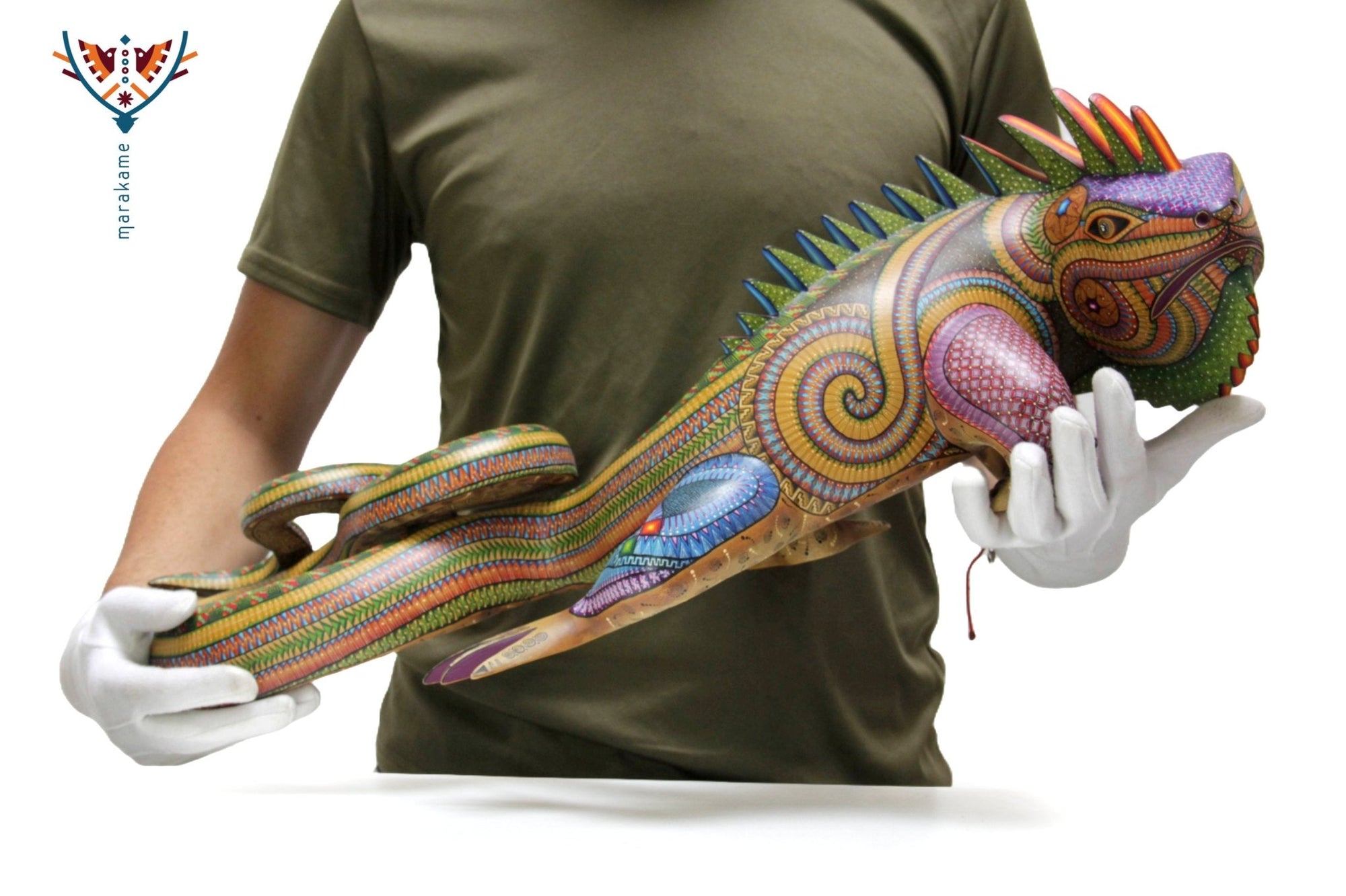Esta selección especial de Alebrije oaxaqueño comisionada por Marakame a los mejores autores de alebrije moderno, es pintado a mano sobre talla en madera del árbol de copal (Bursera, spp), el cual crece a los alrededores de las comunidades de San Martín Tilcajete y San Antonio Arrazola, localidades de la región Zapoteca del Estado de Oaxaca, en el Sur de México. También se utiliza de forma común la talla en madera de cedro por las características de esta madera.