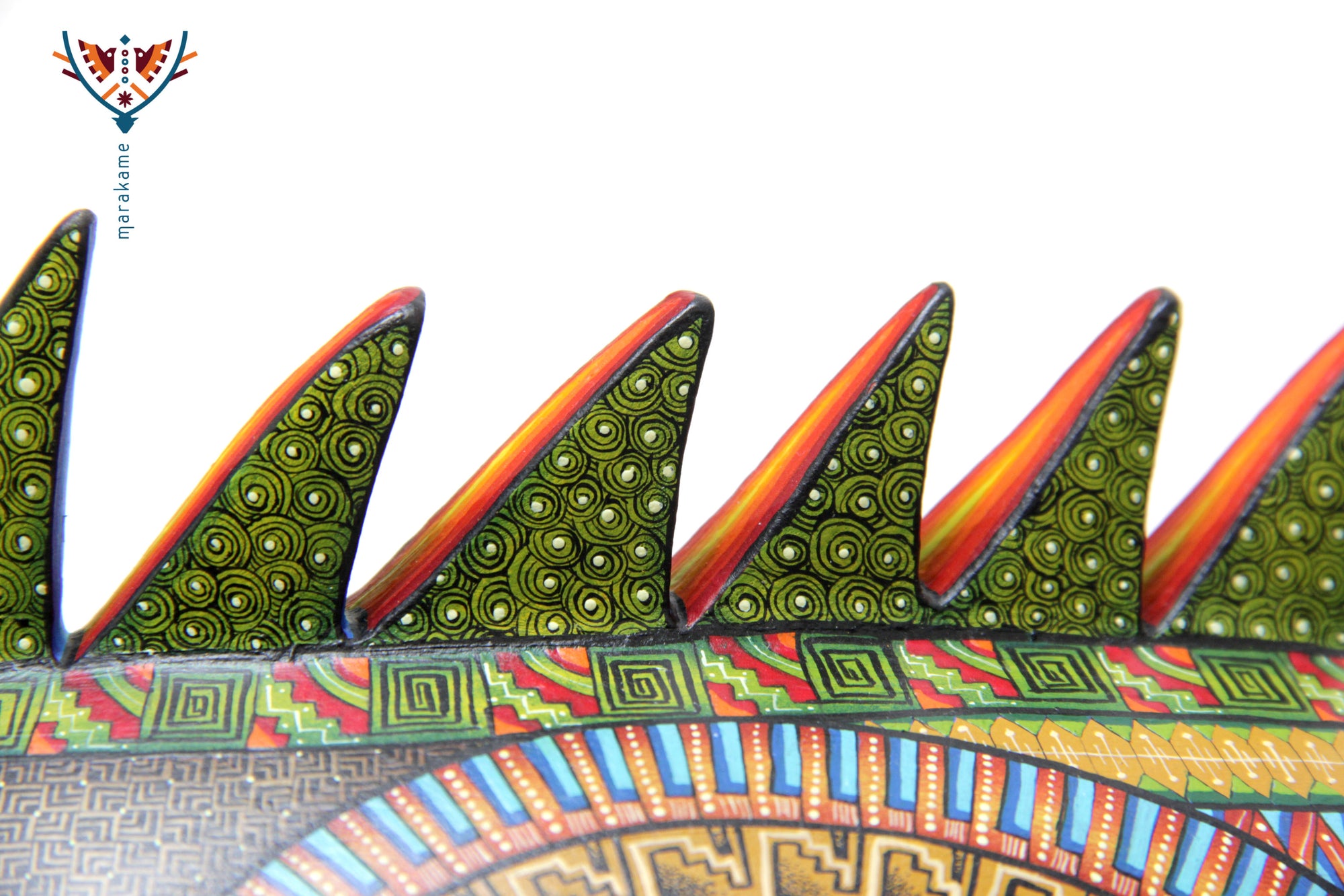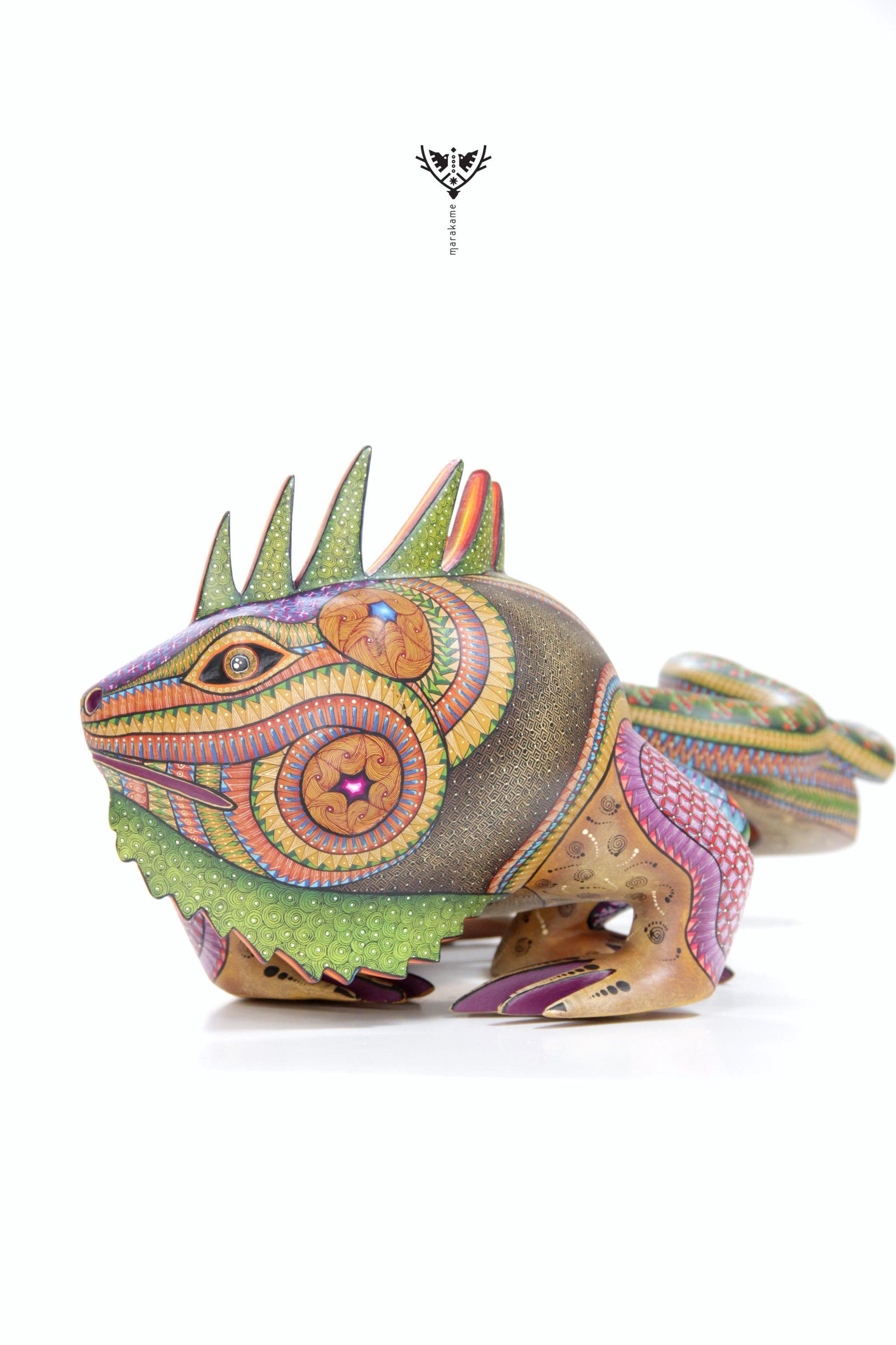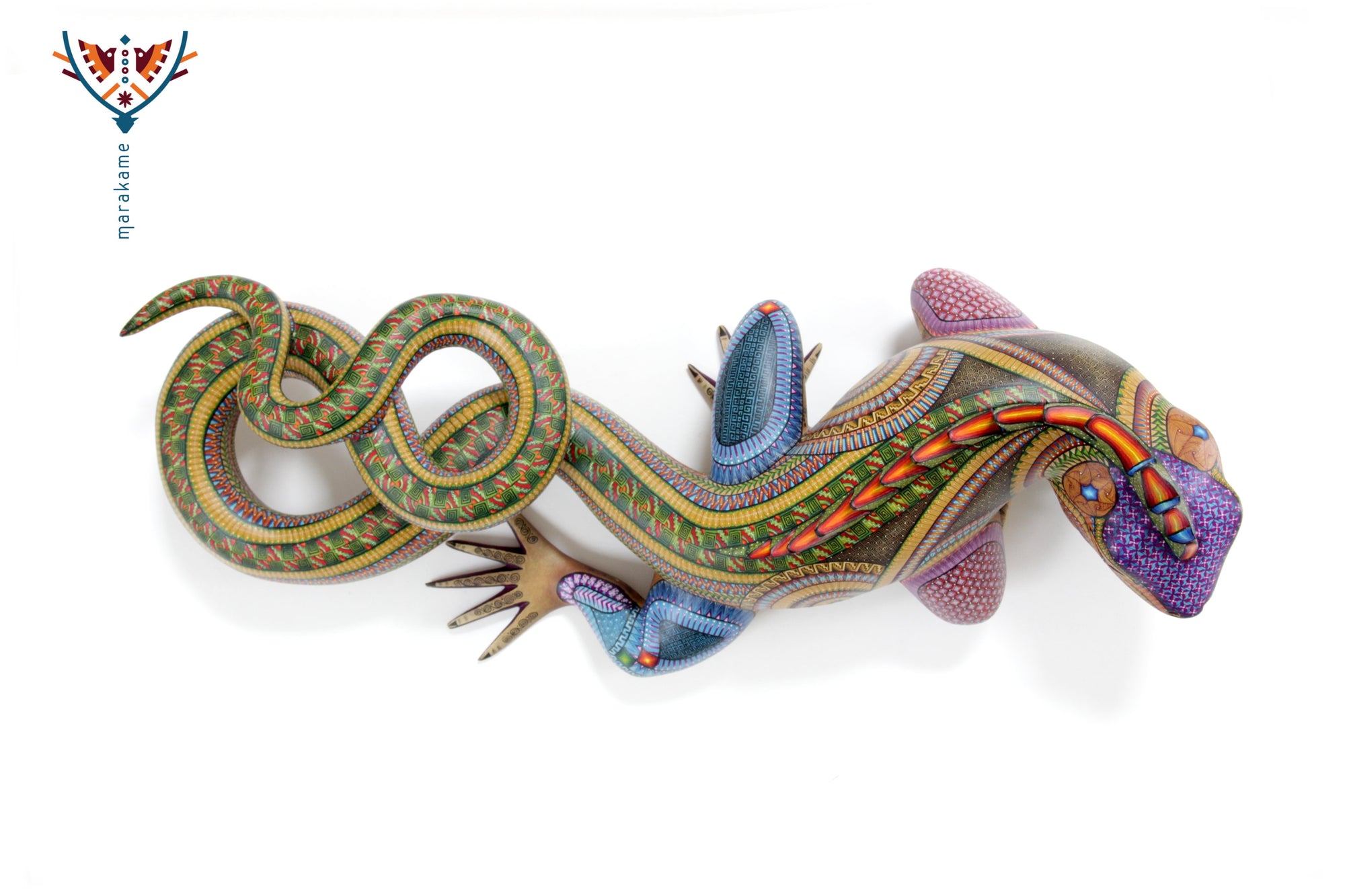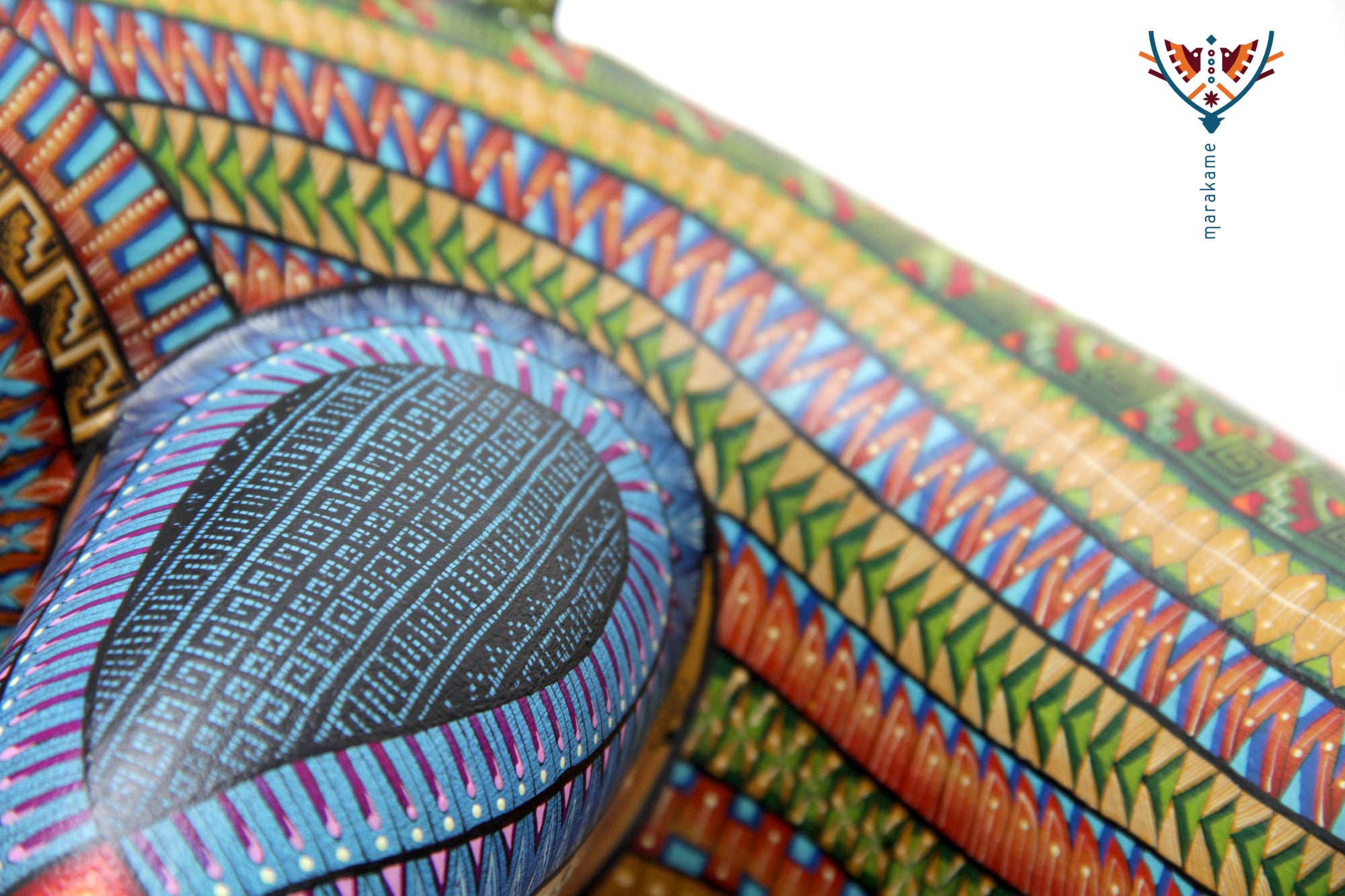 Esta selección especial de Alebrije oaxaqueño comisionada por Marakame a los mejores autores de alebrije moderno, es pintado a mano sobre talla en madera del árbol de copal (Bursera, spp), el cual crece a los alrededores de las comunidades de San Martín Tilcajete y San Antonio Arrazola, localidades de la región Zapoteca del Estado de Oaxaca, en el Sur de México. También se utiliza de forma común la talla en madera de cedro por las características de esta madera.