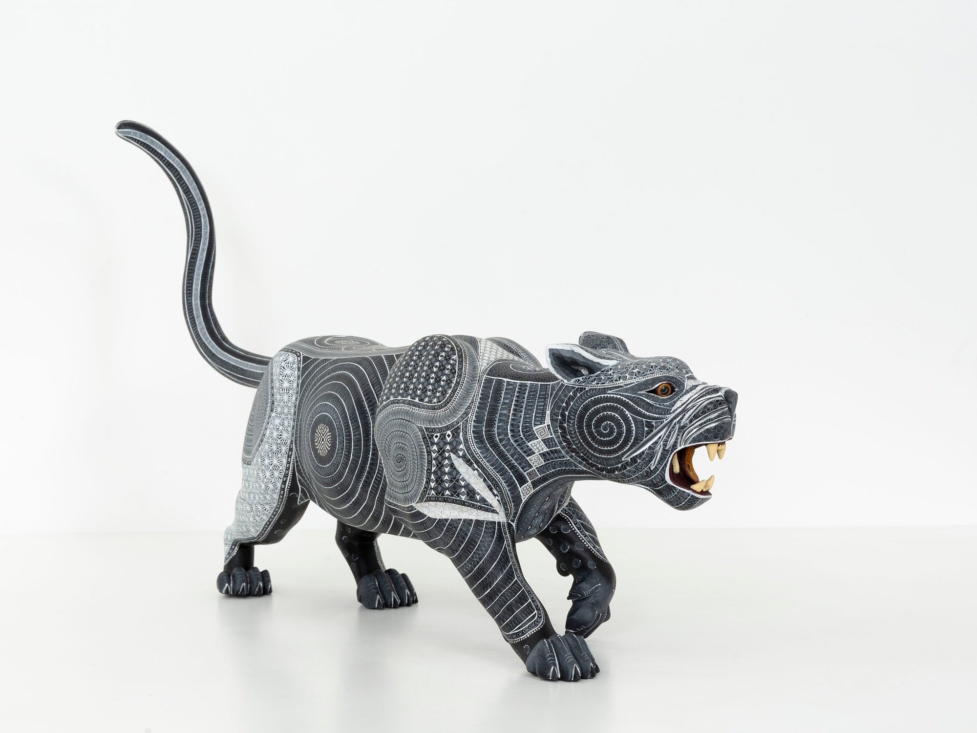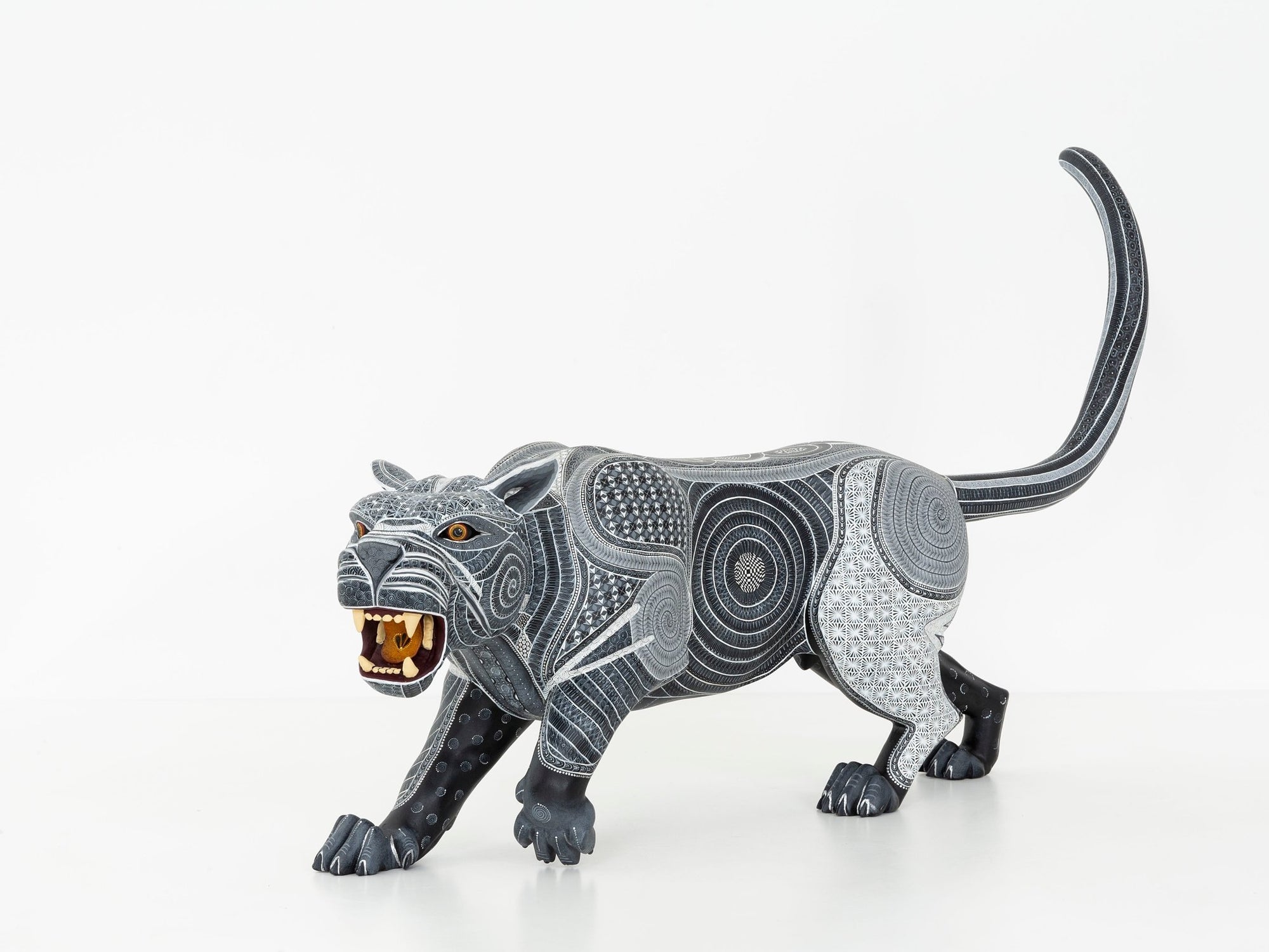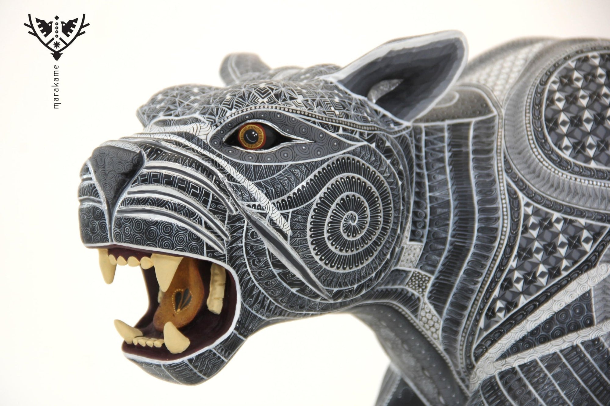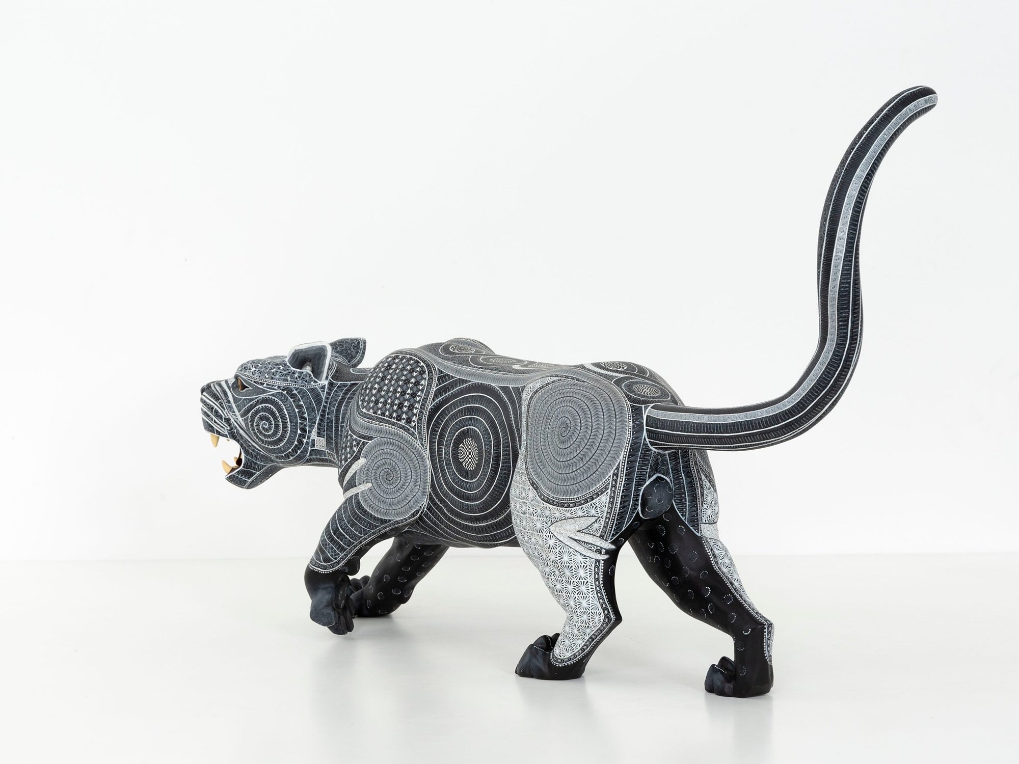 Dos jaguares rugen enérgicamente, uno frente a otro. Muestran sus dientes y la severidad de sus fauces. Pero la expresión no arroja señales de ataque: si bien la cola sugiere una actitud de alerta, las patas, el cuerpo poco agazapado, su equilibrio, nos hace imaginar un avance delicado y cauteloso. La energía no se opone ni compite, sino que se complementa; es un asunto de dos, la suma de sus ricos patrones y colores. Un rugido ritual, una danza felina a punto de empezar.