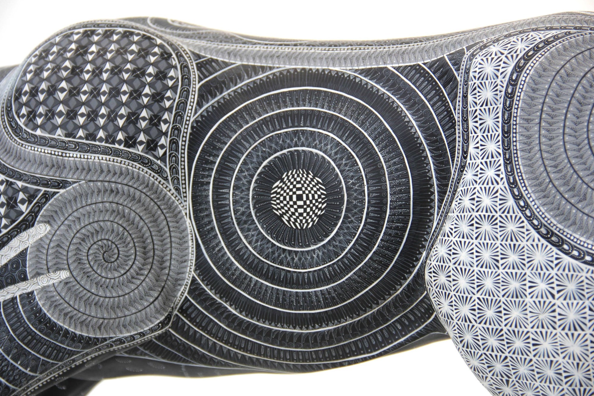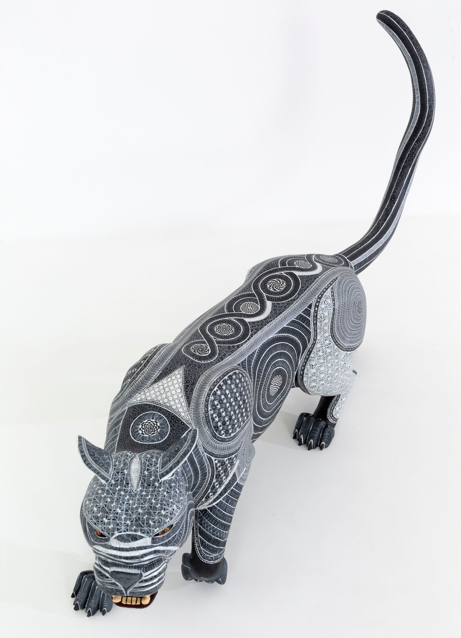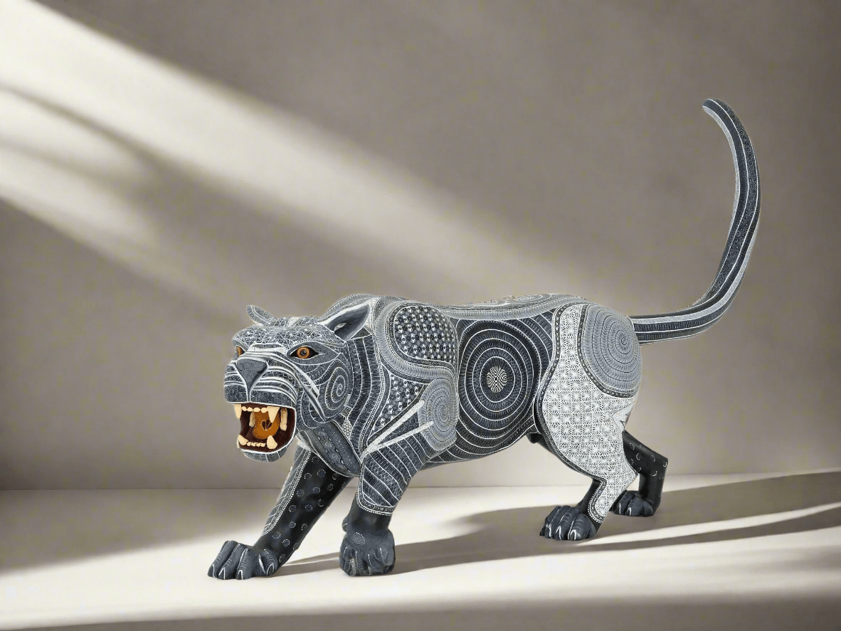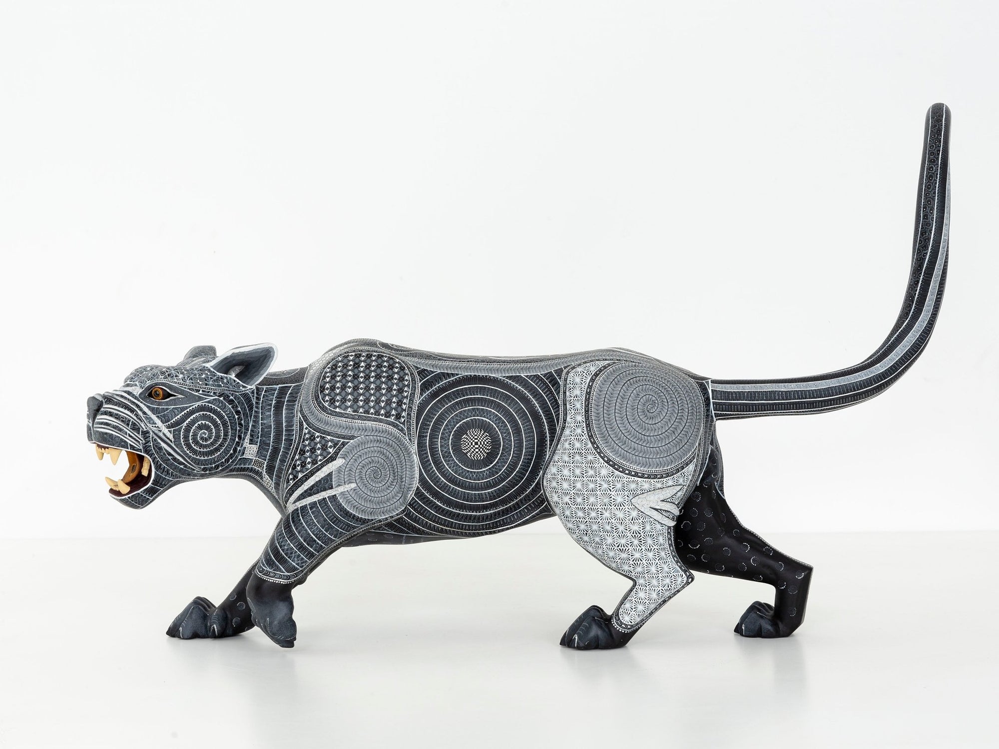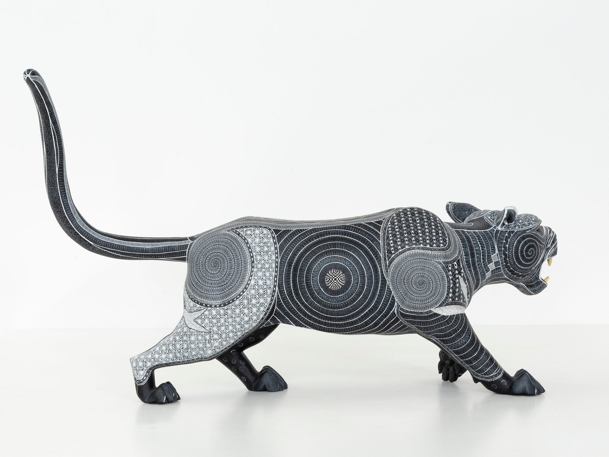 Dos jaguares rugen enérgicamente, uno frente a otro. Muestran sus dientes y la severidad de sus fauces. Pero la expresión no arroja señales de ataque: si bien la cola sugiere una actitud de alerta, las patas, el cuerpo poco agazapado, su equilibrio, nos hace imaginar un avance delicado y cauteloso. La energía no se opone ni compite, sino que se complementa; es un asunto de dos, la suma de sus ricos patrones y colores. Un rugido ritual, una danza felina a punto de empezar.