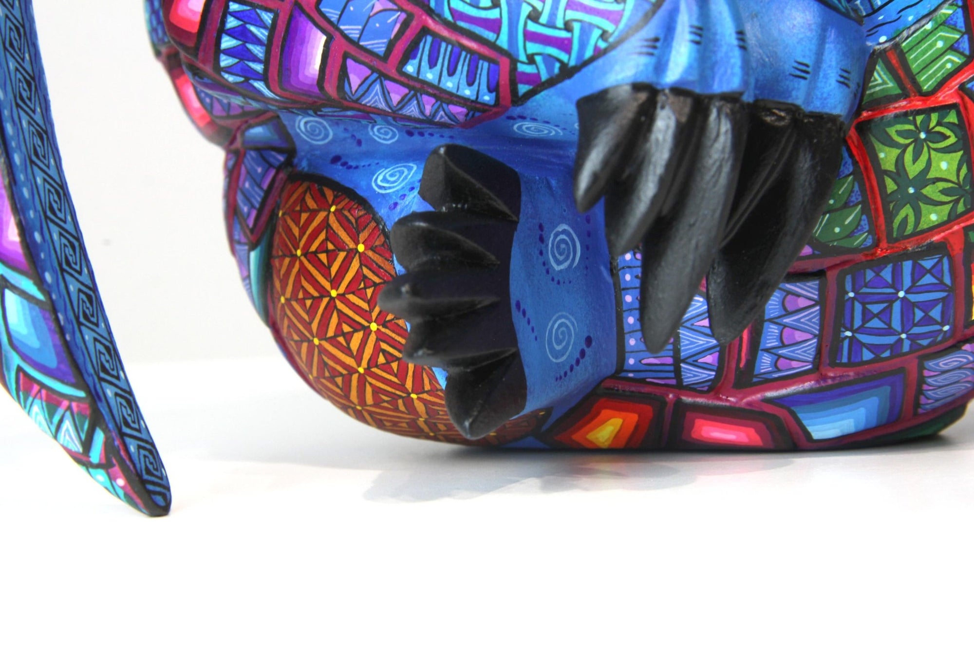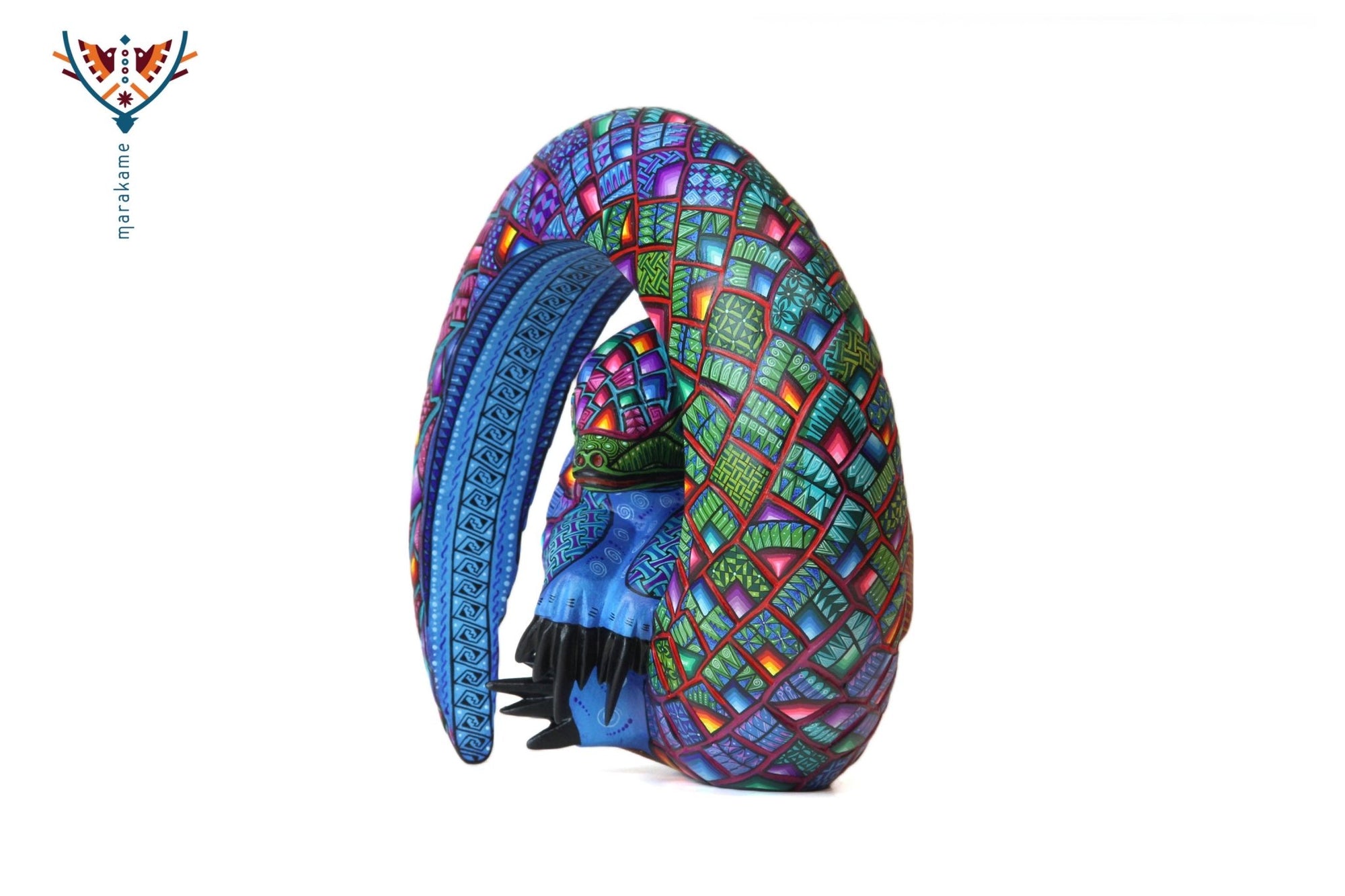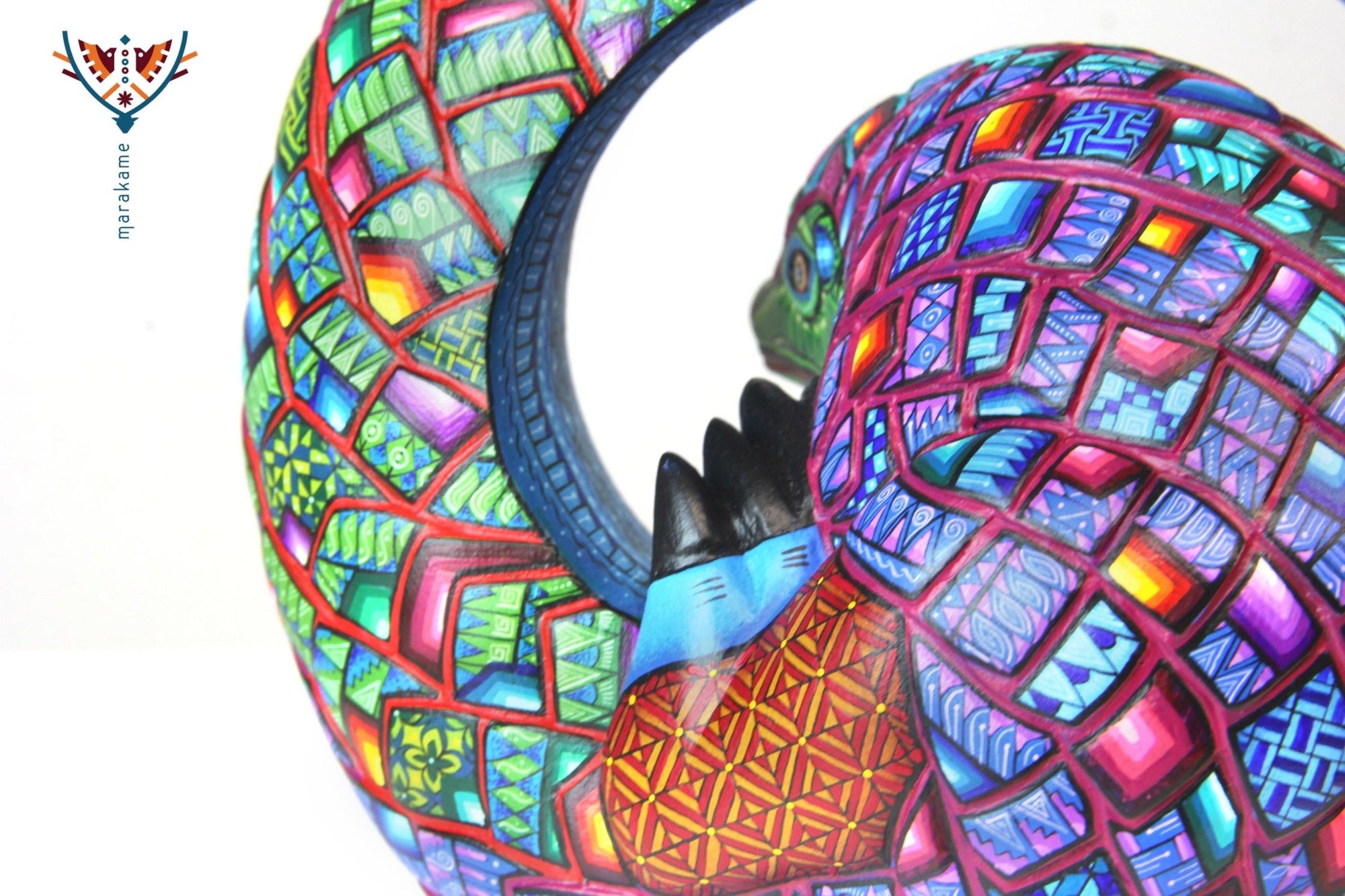 Esta selección especial de Alebrije oaxaqueño comisionada por Marakame a los mejores autores de alebrije moderno, es pintado a mano sobre talla en madera del árbol de copal (Bursera, spp), el cual crece a los alrededores de las comunidades de San Martín Tilcajete y San Antonio Arrazola, localidades de la región Zapoteca del Estado de Oaxaca, en el Sur de México.