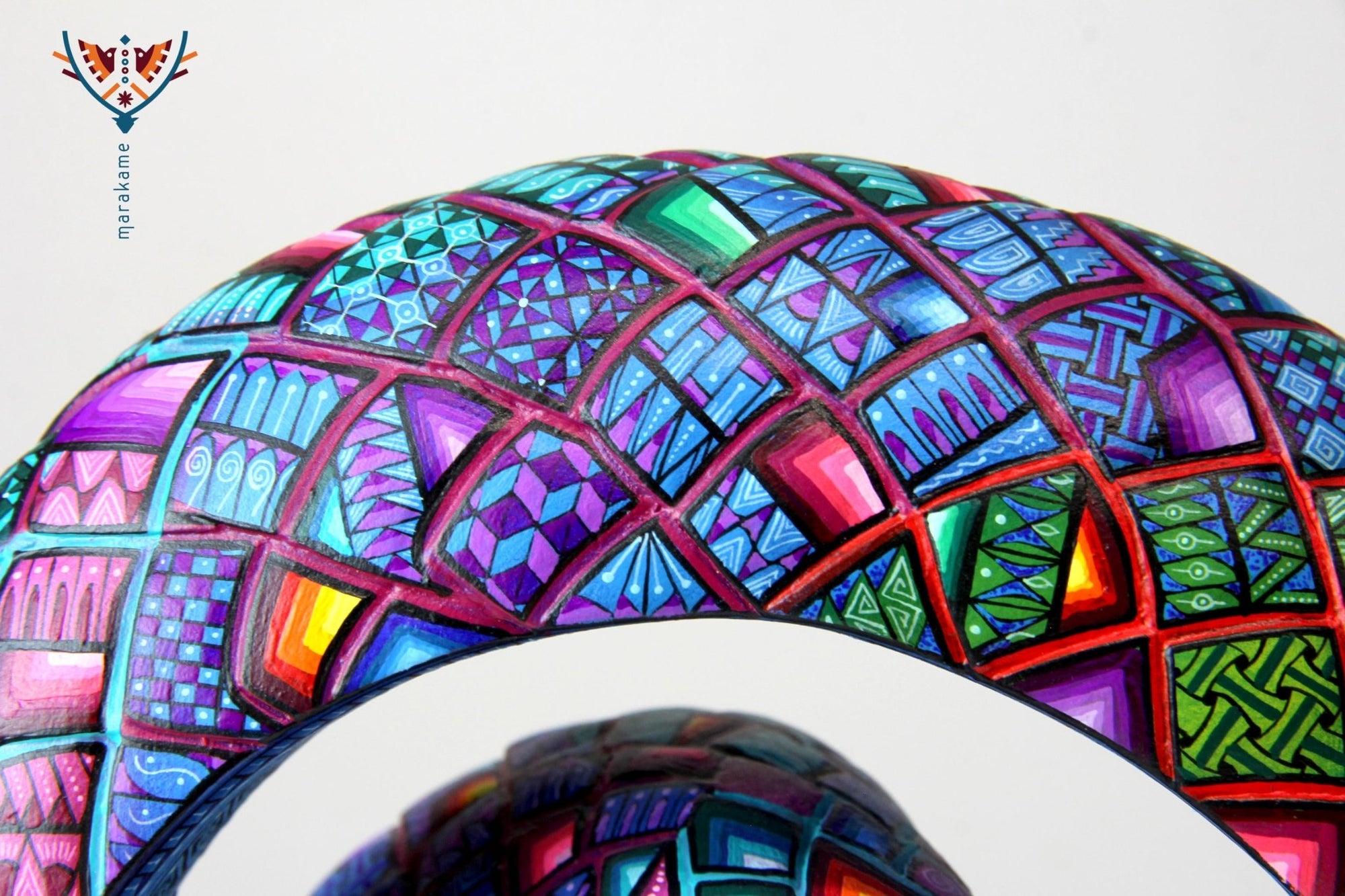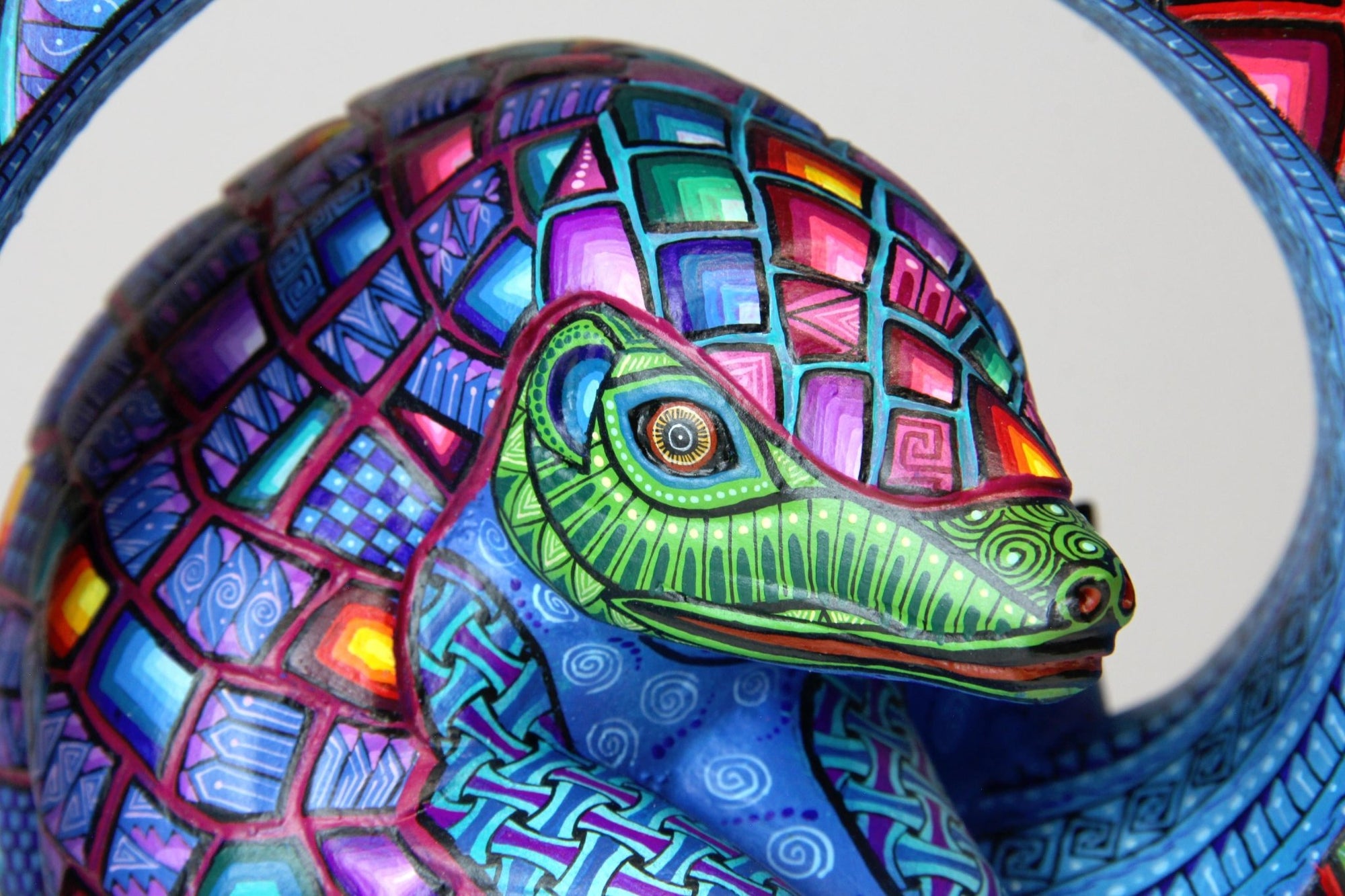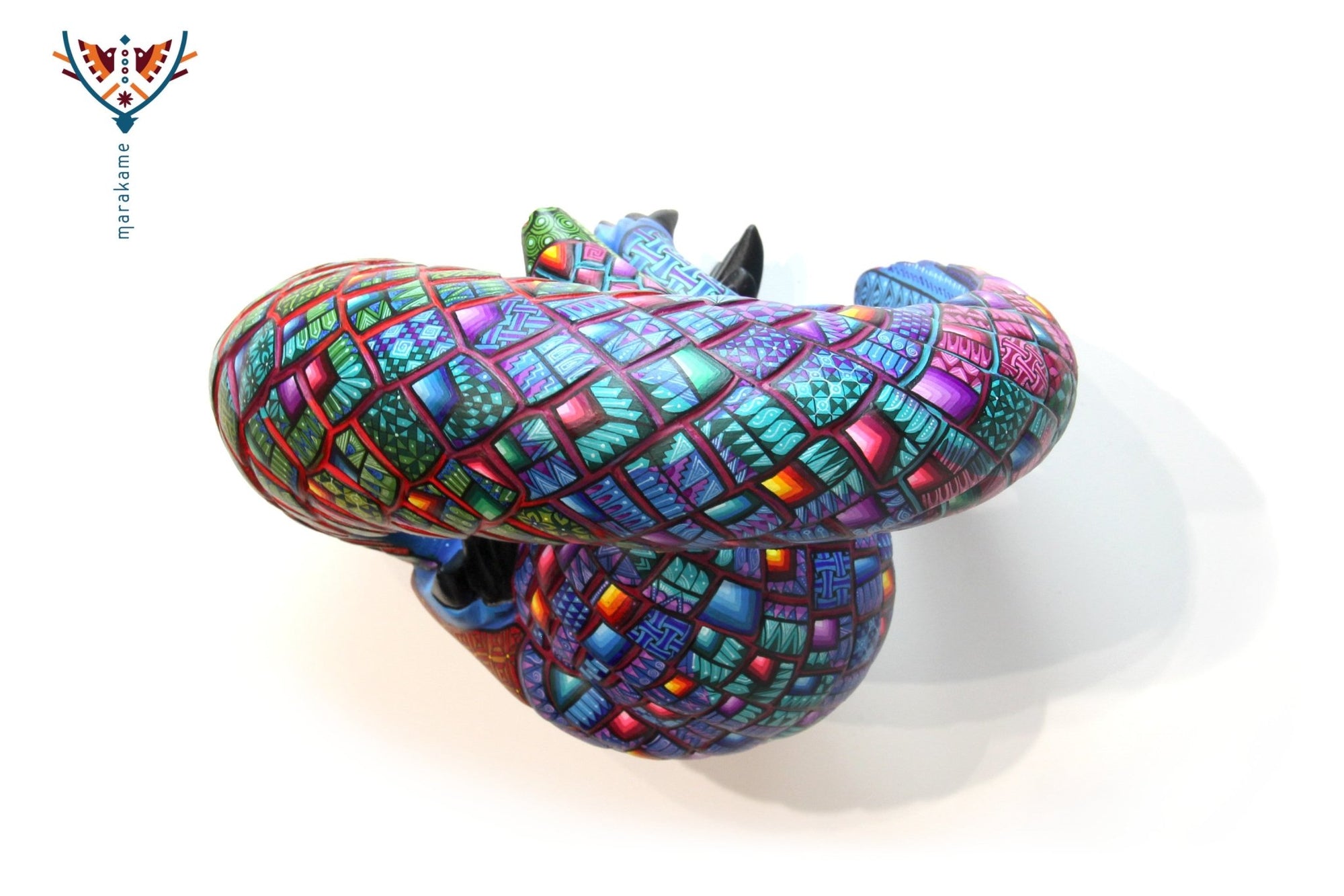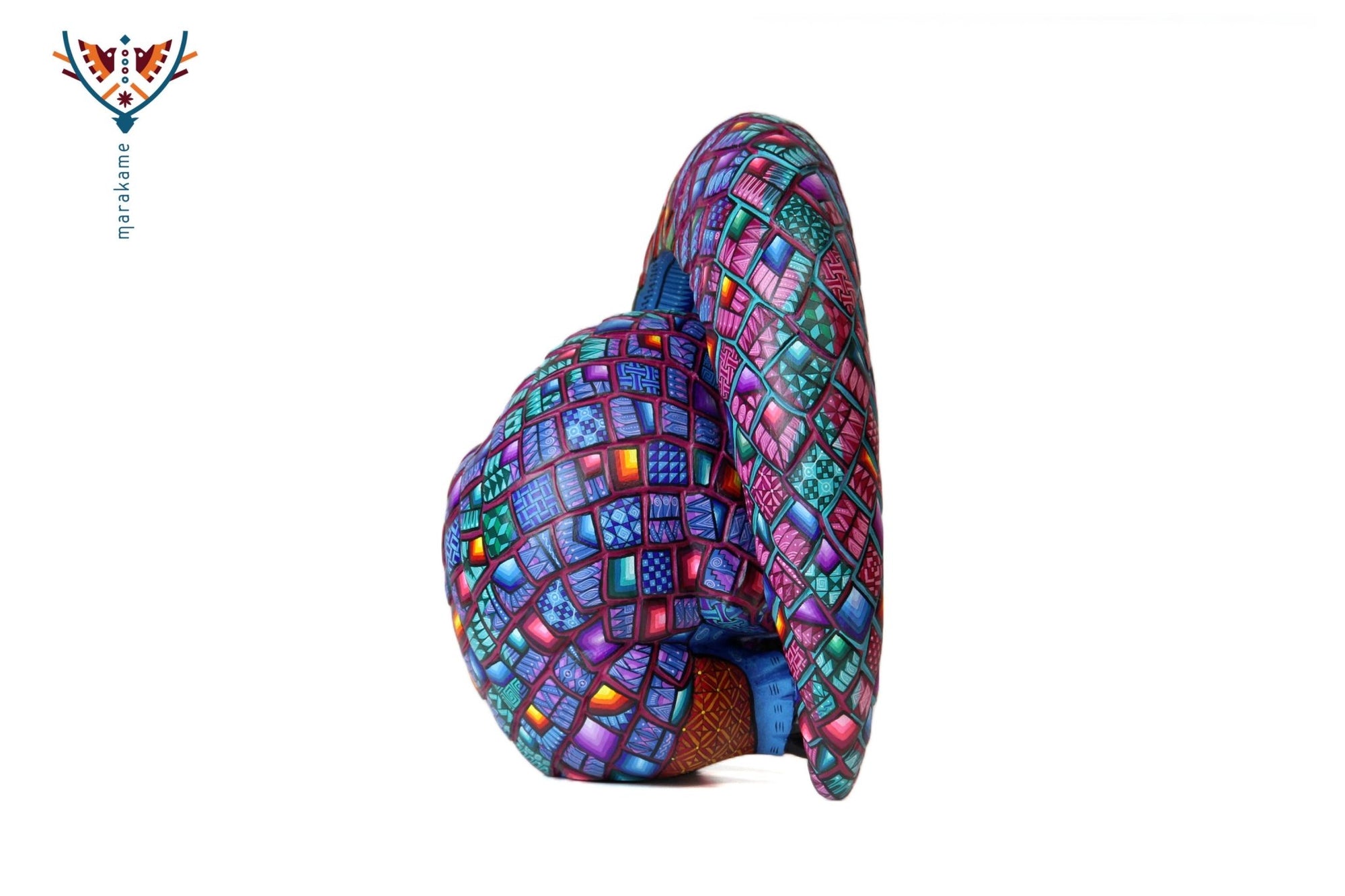 Esta selección especial de Alebrije oaxaqueño comisionada por Marakame a los mejores autores de alebrije moderno, es pintado a mano sobre talla en madera del árbol de copal (Bursera, spp), el cual crece a los alrededores de las comunidades de San Martín Tilcajete y San Antonio Arrazola, localidades de la región Zapoteca del Estado de Oaxaca, en el Sur de México.