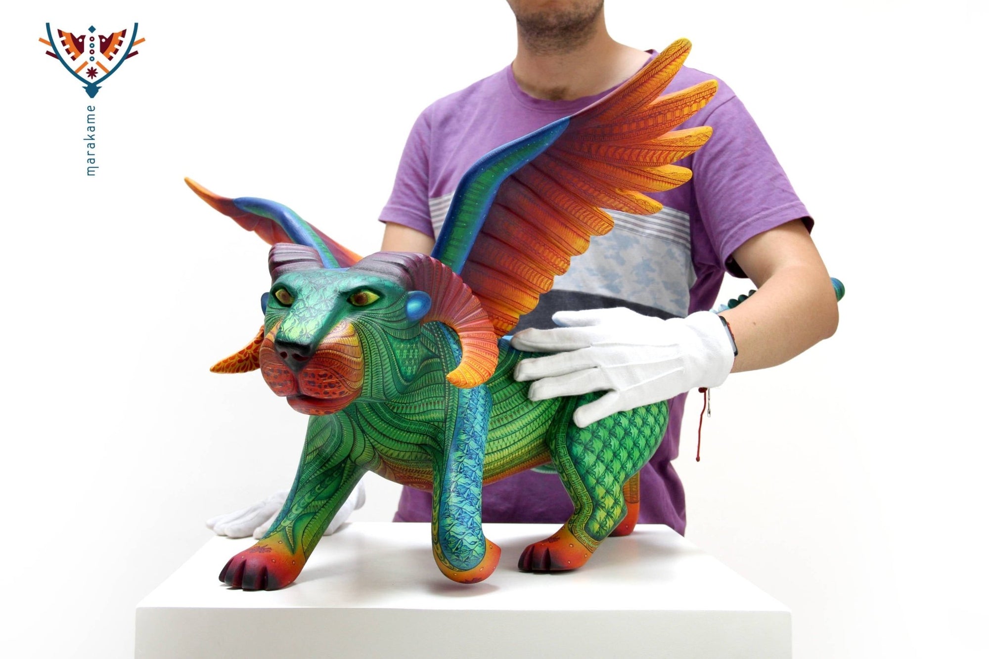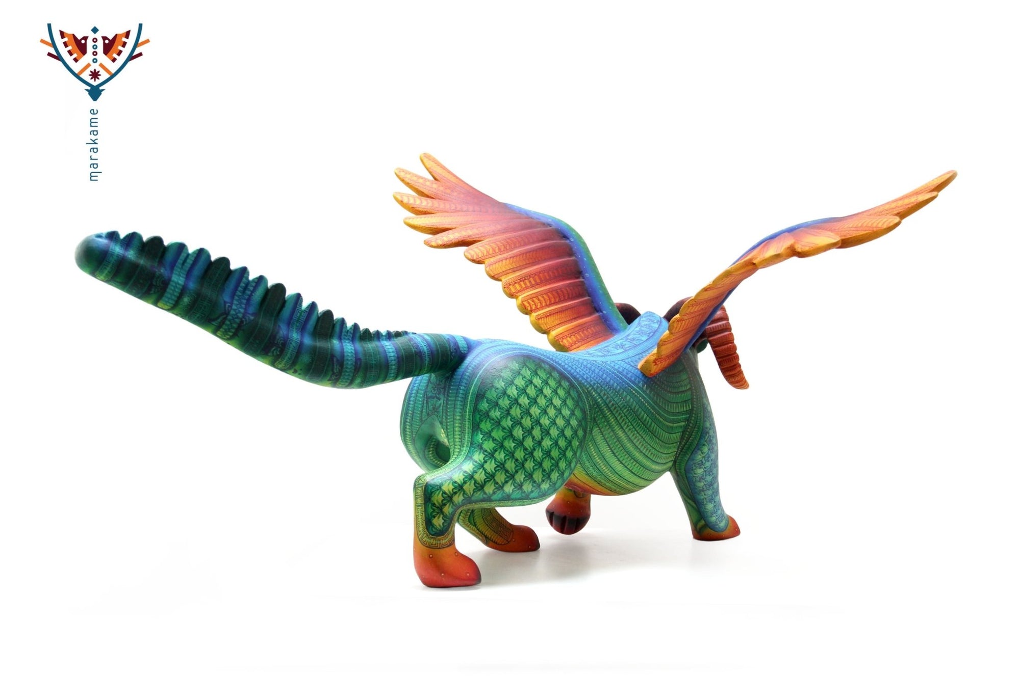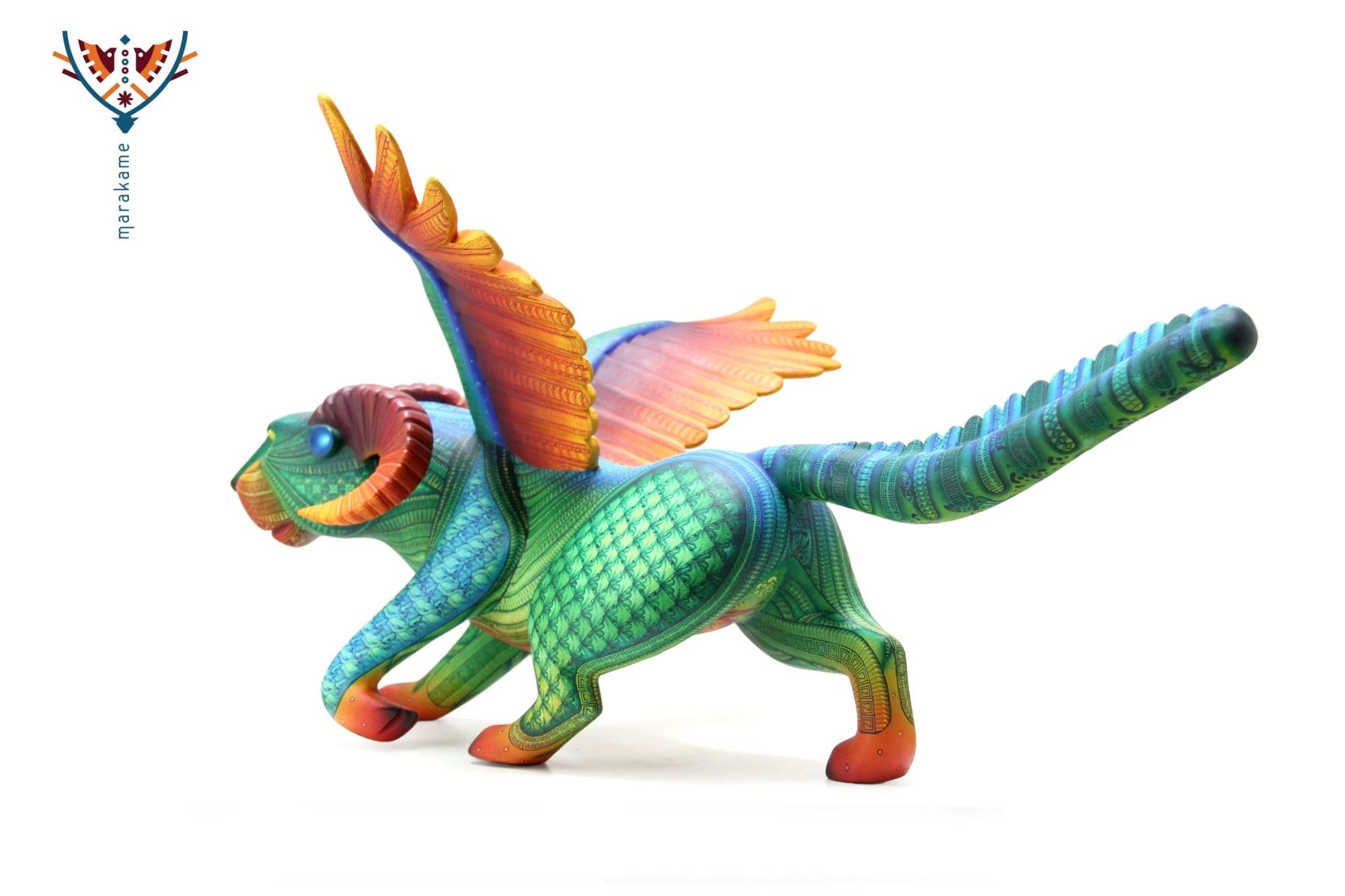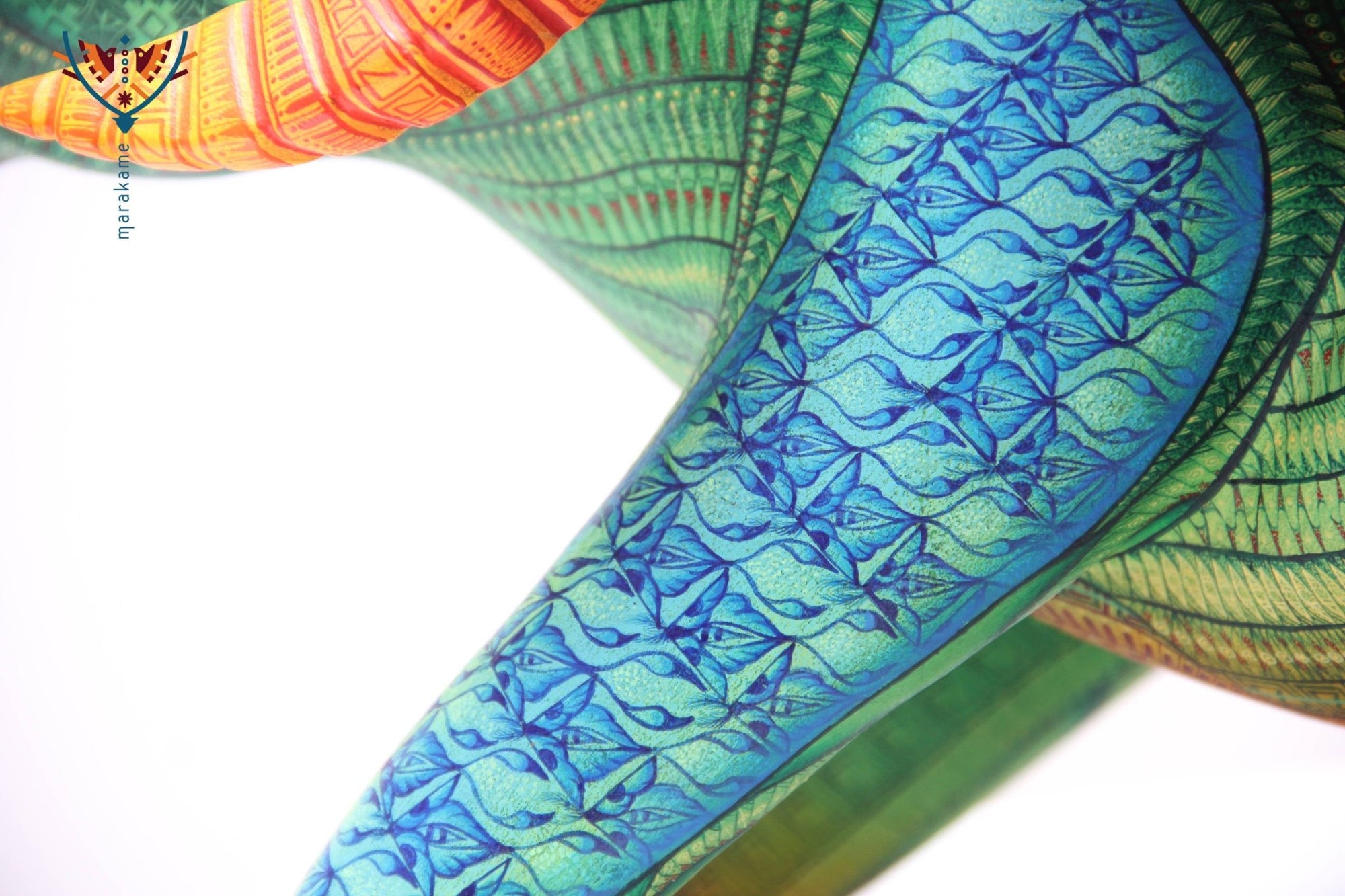 Esta selección especial de Alebrije oaxaqueño comisionada por Marakame a los mejores autores de alebrije moderno, es pintado a mano sobre talla en madera del árbol de copal (Bursera, spp), el cual crece a los alrededores de las comunidades de San Martín Tilcajete y San Antonio Arrazola, localidades de la región Zapoteca del Estado de Oaxaca, en el Sur de México.
