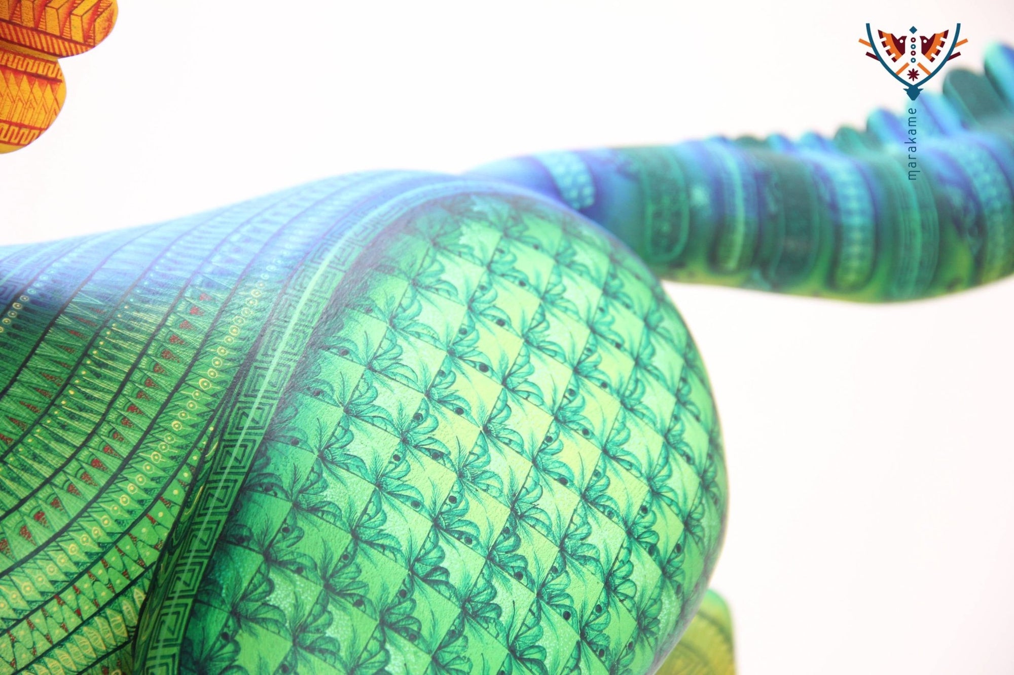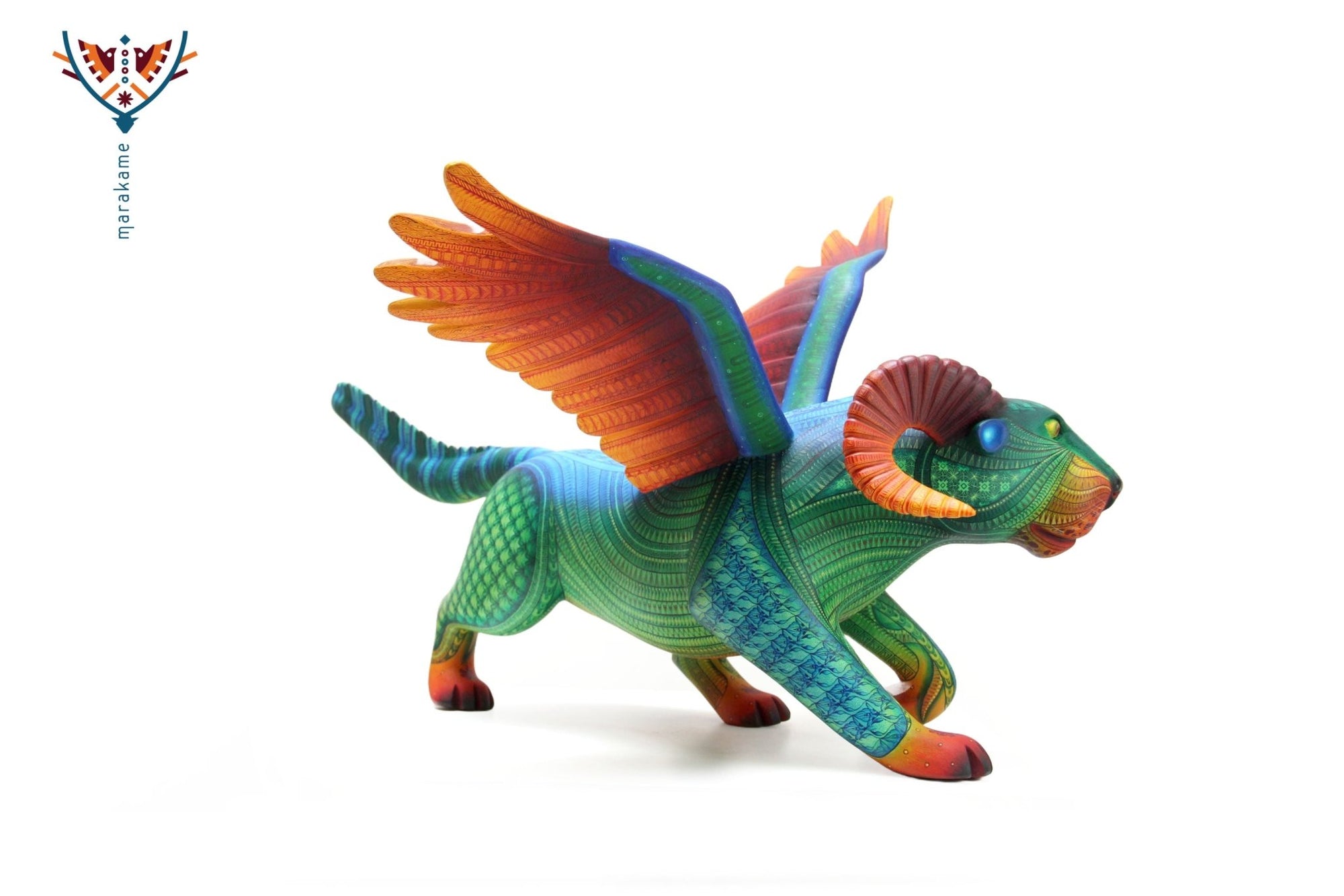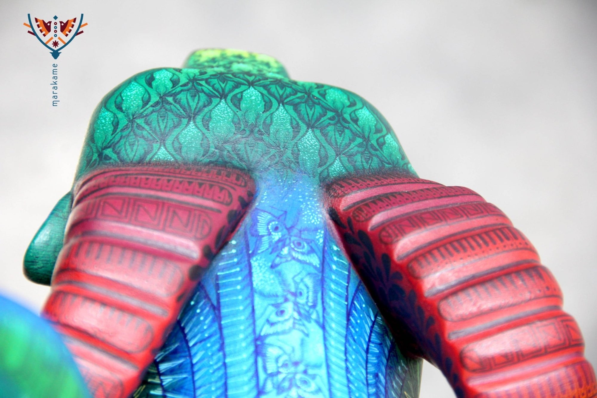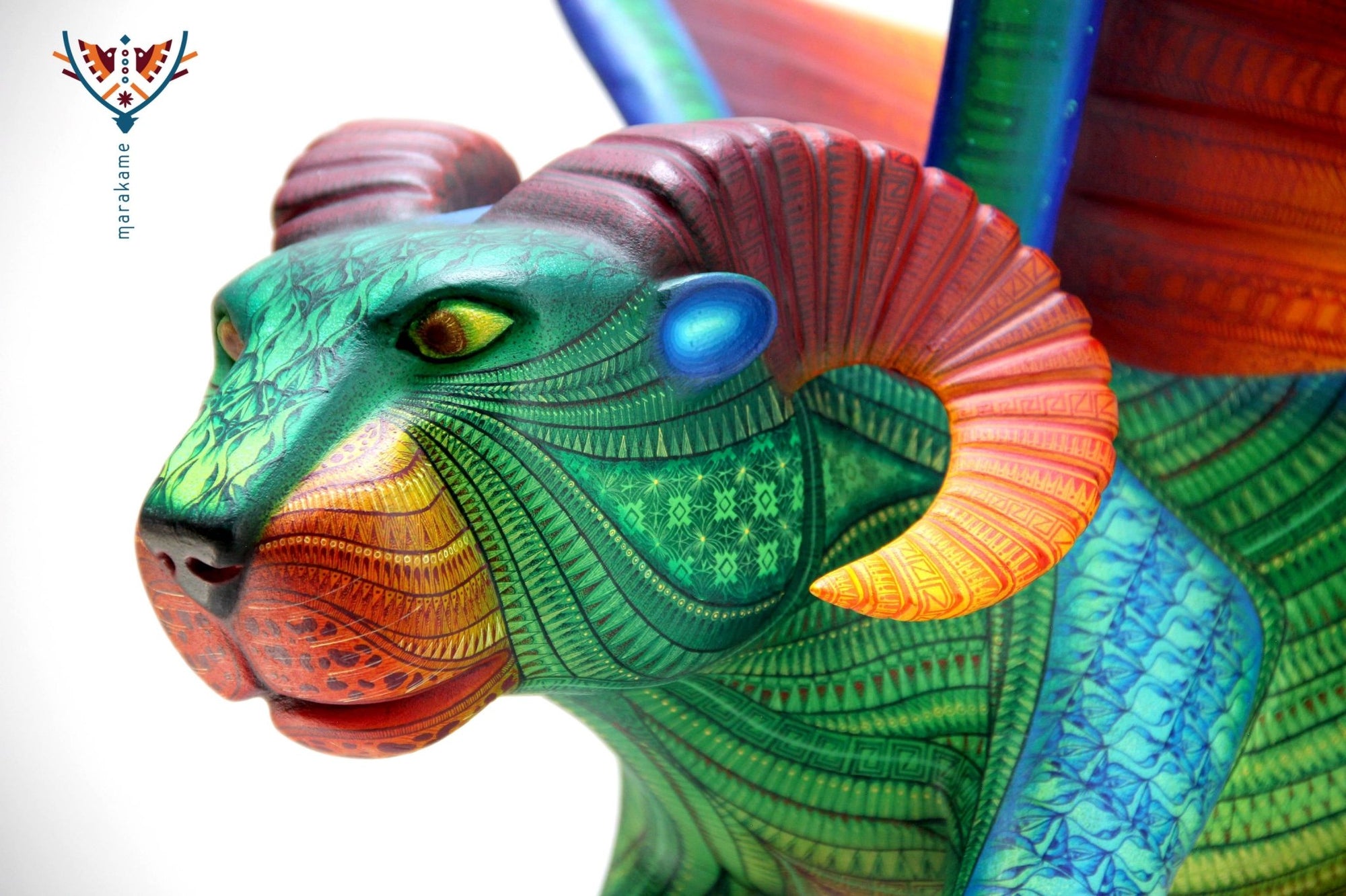 Esta selección especial de Alebrije oaxaqueño comisionada por Marakame a los mejores autores de alebrije moderno, es pintado a mano sobre talla en madera del árbol de copal (Bursera, spp), el cual crece a los alrededores de las comunidades de San Martín Tilcajete y San Antonio Arrazola, localidades de la región Zapoteca del Estado de Oaxaca, en el Sur de México.