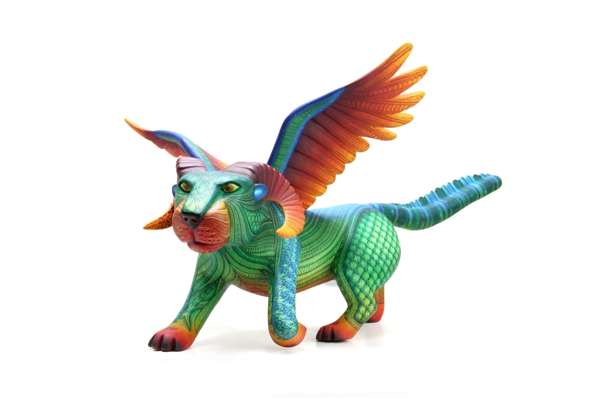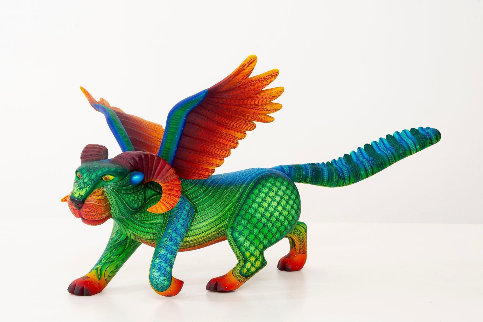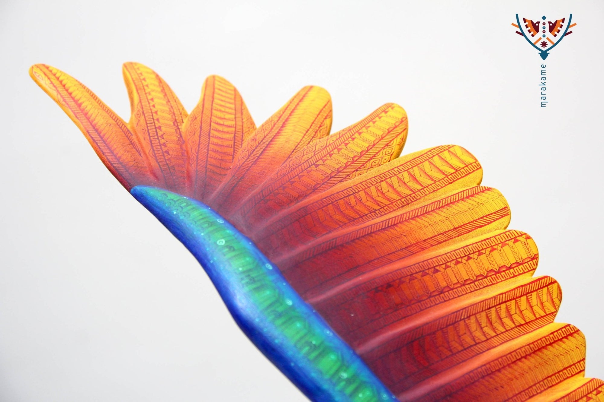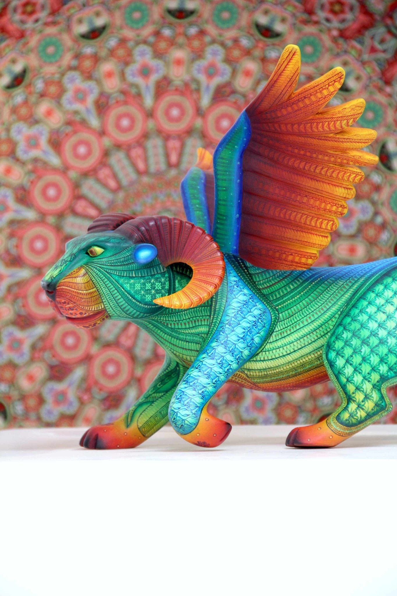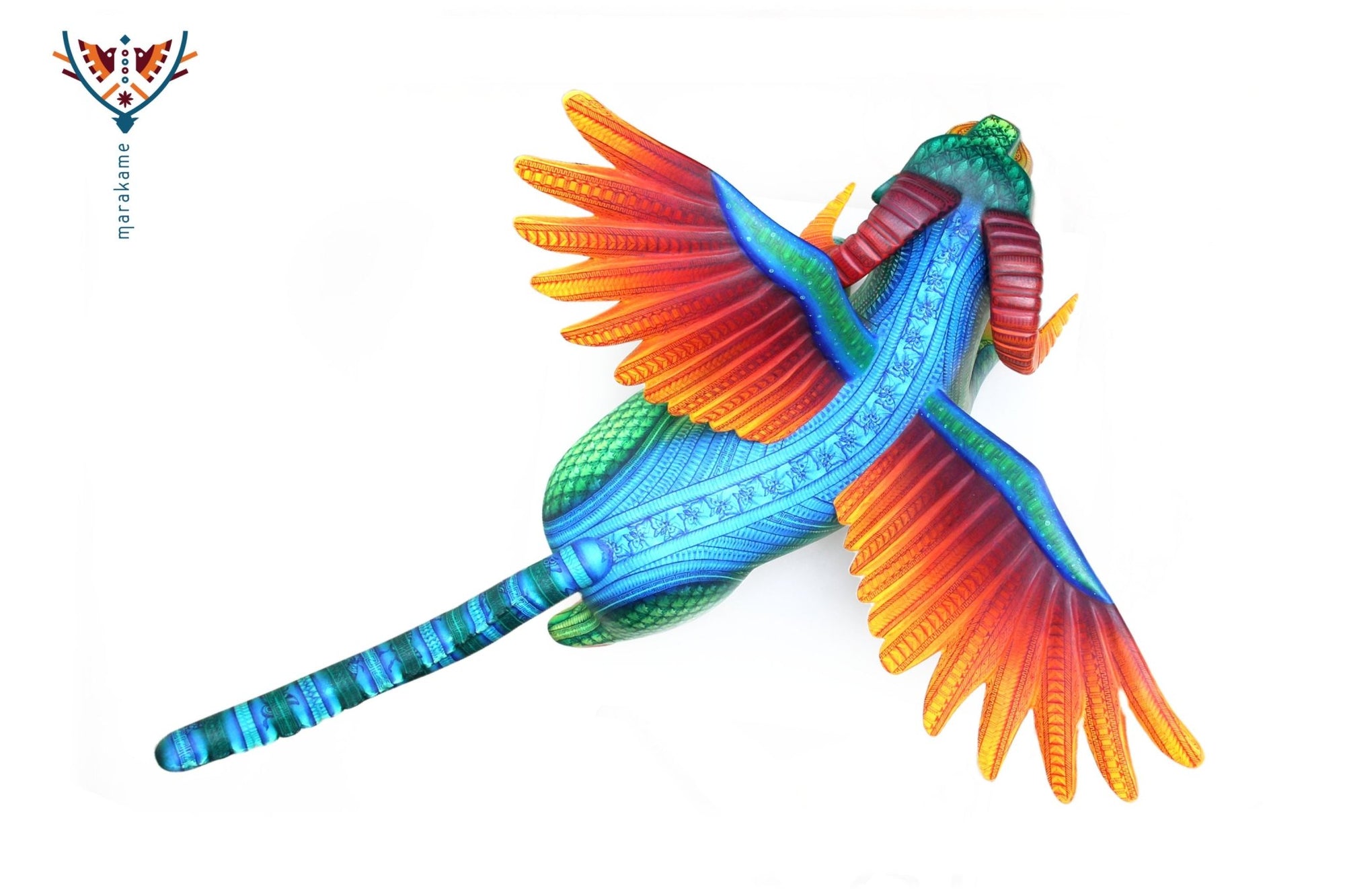 Esta selección especial de Alebrije oaxaqueño comisionada por Marakame a los mejores autores de alebrije moderno, es pintado a mano sobre talla en madera del árbol de copal (Bursera, spp), el cual crece a los alrededores de las comunidades de San Martín Tilcajete y San Antonio Arrazola, localidades de la región Zapoteca del Estado de Oaxaca, en el Sur de México.