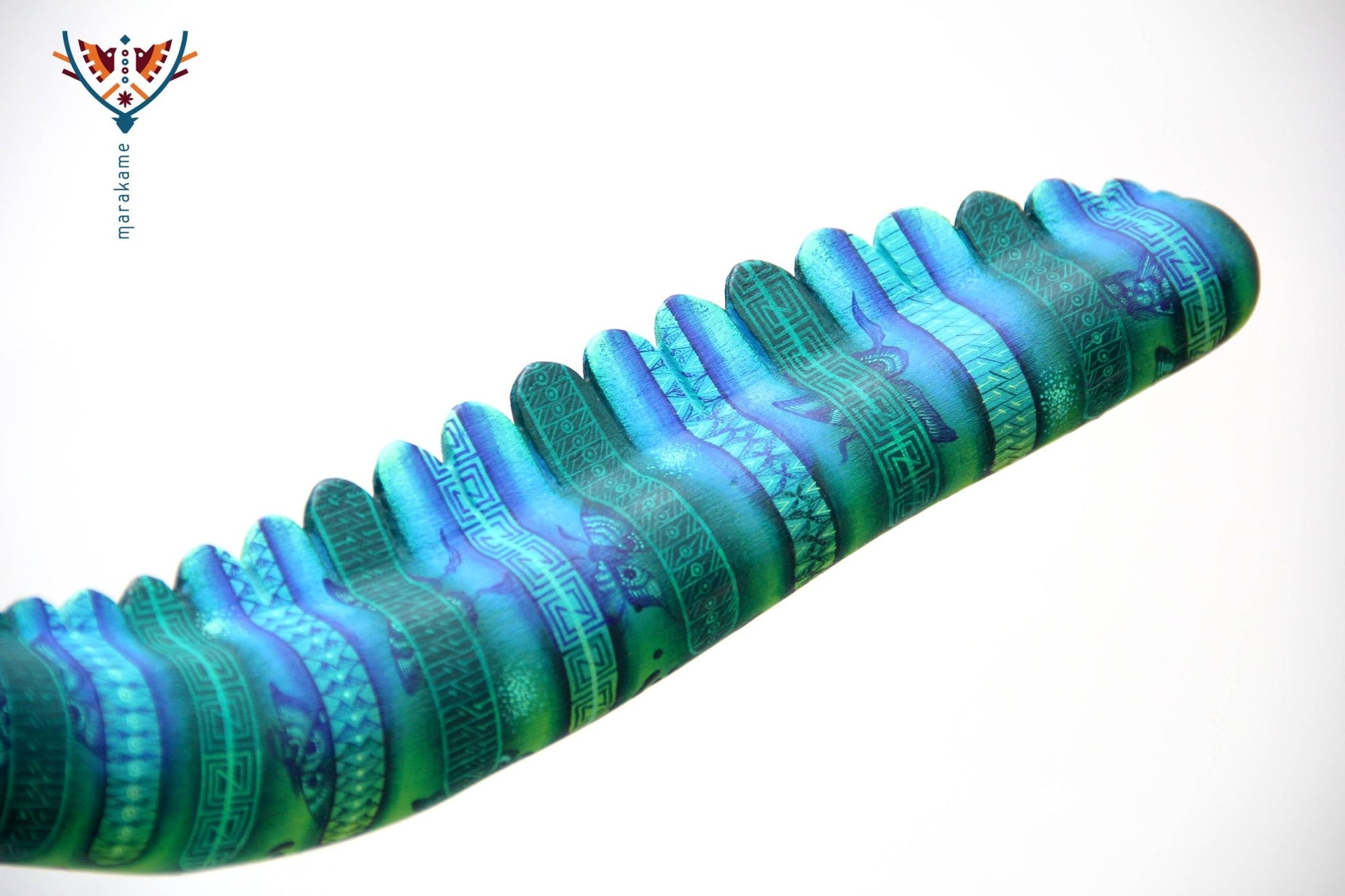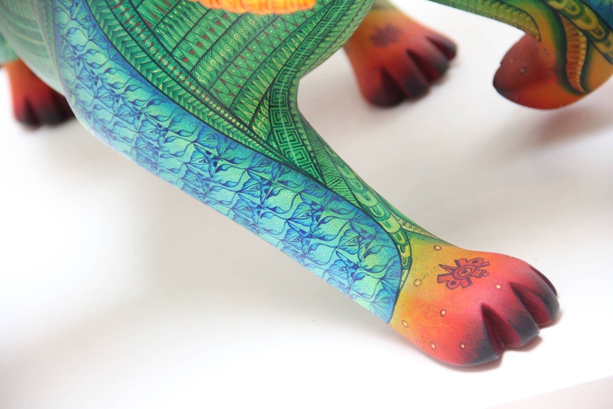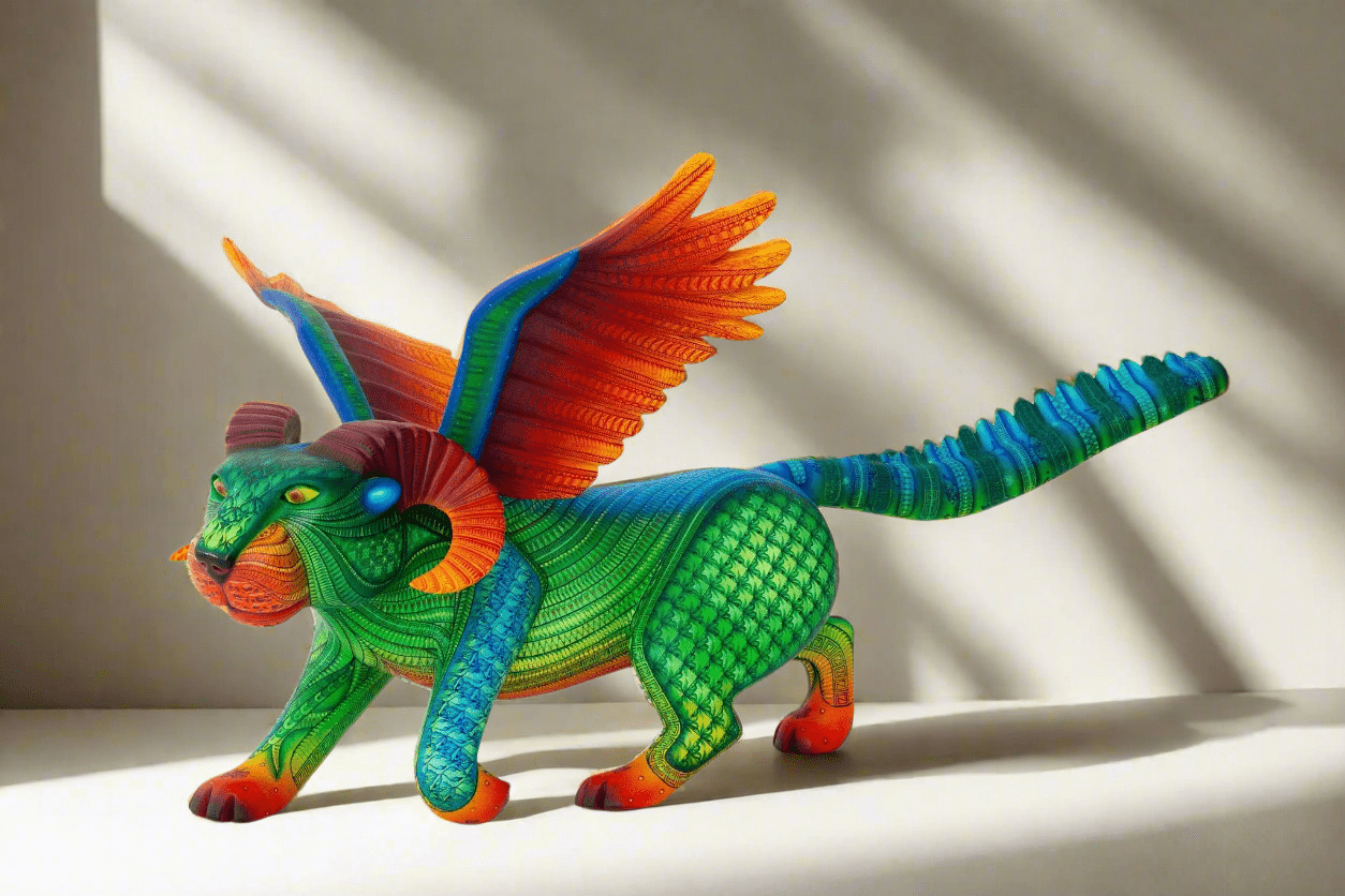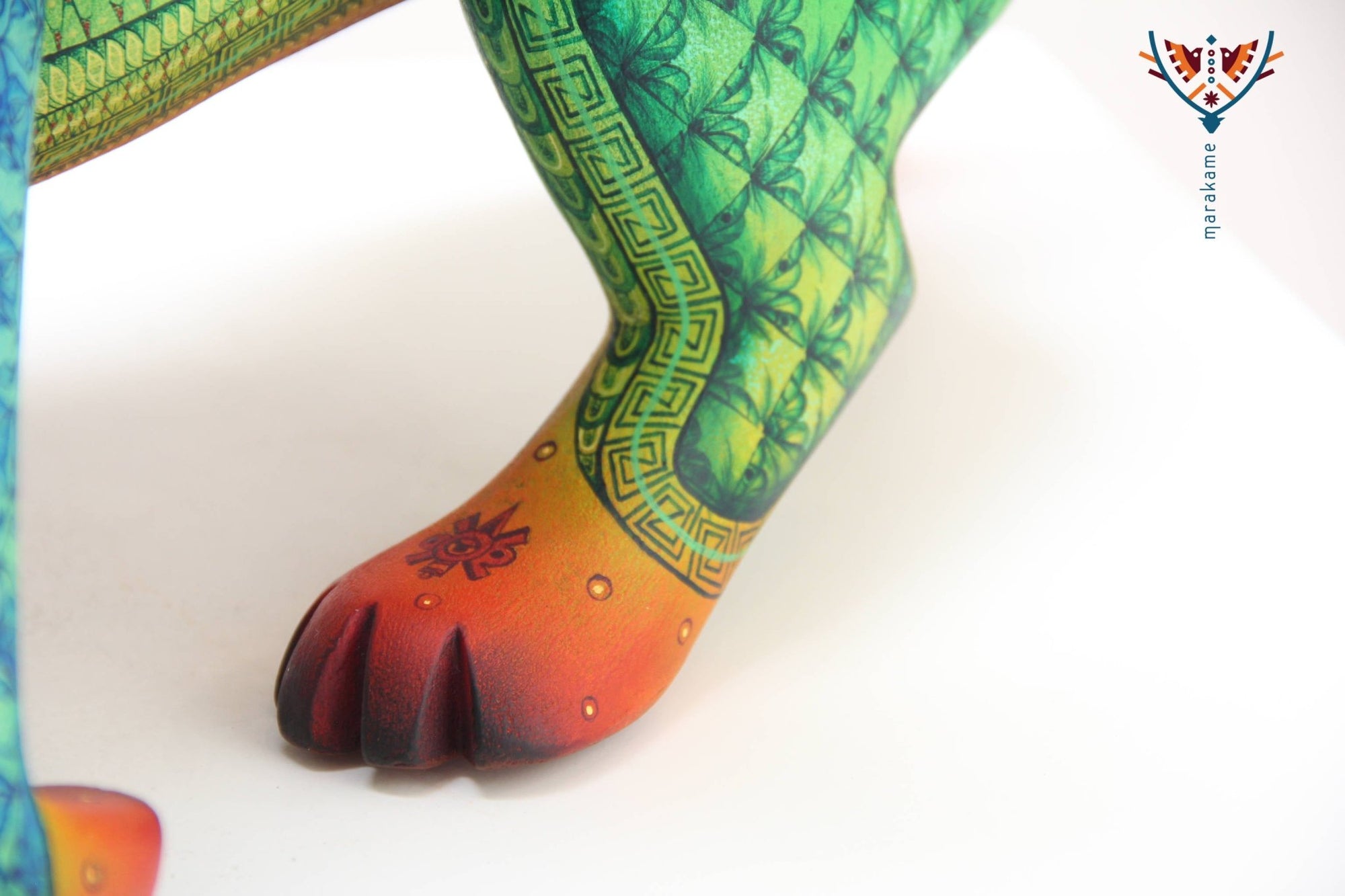 Esta selección especial de Alebrije oaxaqueño comisionada por Marakame a los mejores autores de alebrije moderno, es pintado a mano sobre talla en madera del árbol de copal (Bursera, spp), el cual crece a los alrededores de las comunidades de San Martín Tilcajete y San Antonio Arrazola, localidades de la región Zapoteca del Estado de Oaxaca, en el Sur de México.