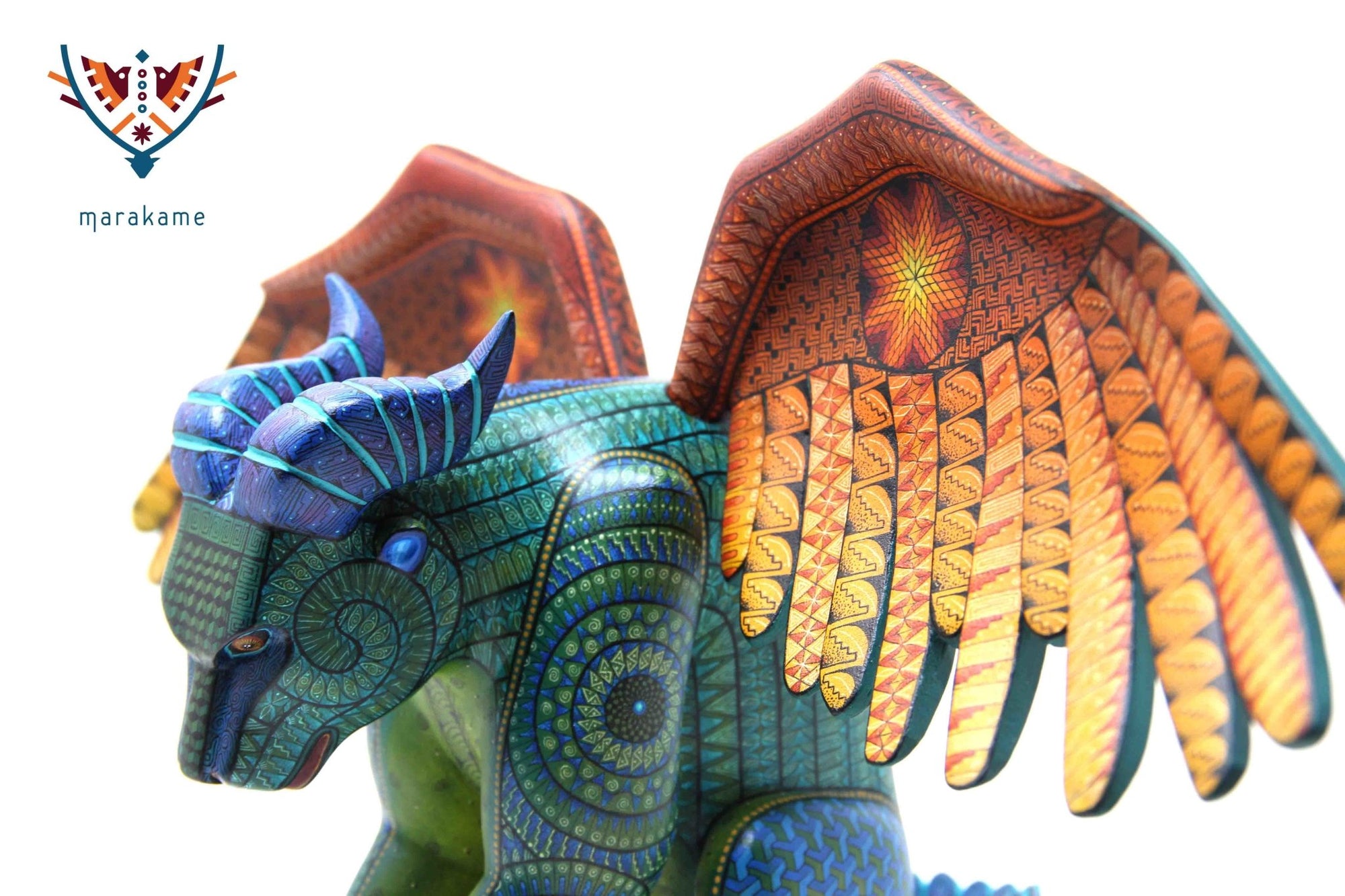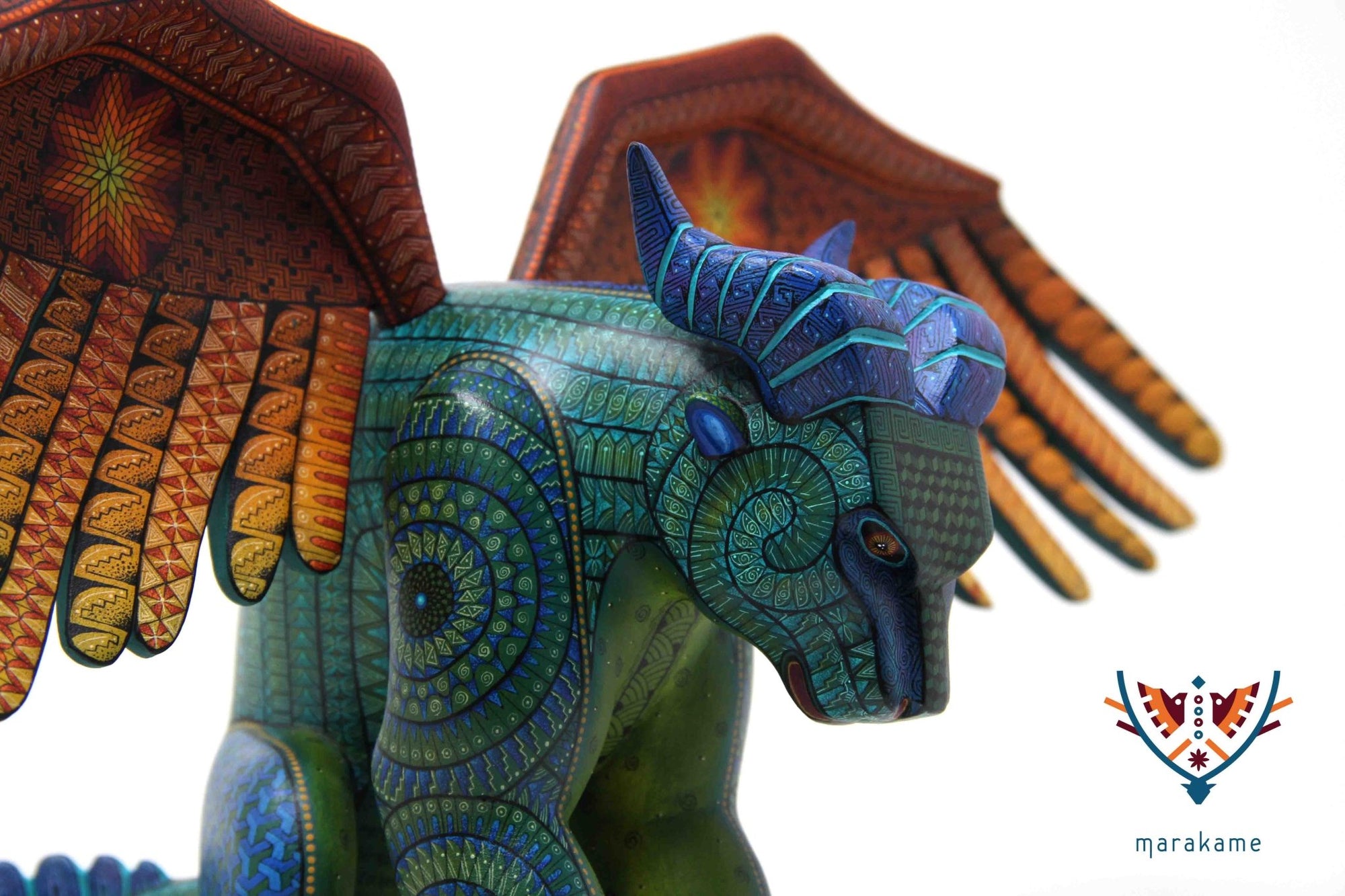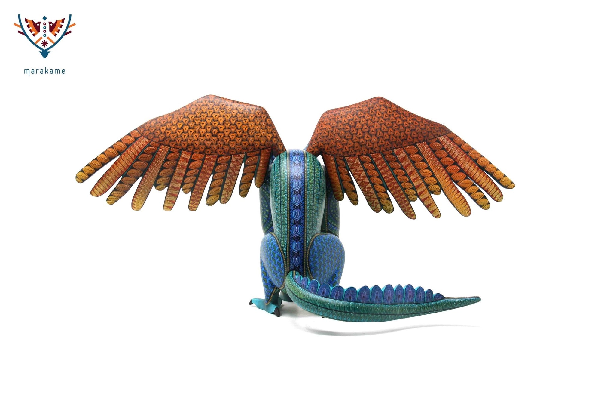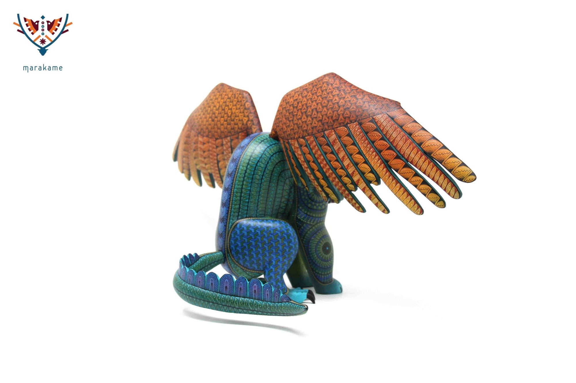 Esta selección especial de Alebrije oaxaqueño comisionada por Marakame a los mejores autores de alebrije moderno, es pintado a mano sobre talla en madera del árbol de copal (Bursera, spp), el cual crece a los alrededores de las comunidades de San Martín Tilcajete y San Antonio Arrazola, localidades de la región Zapoteca del Estado de Oaxaca, en el Sur de México.