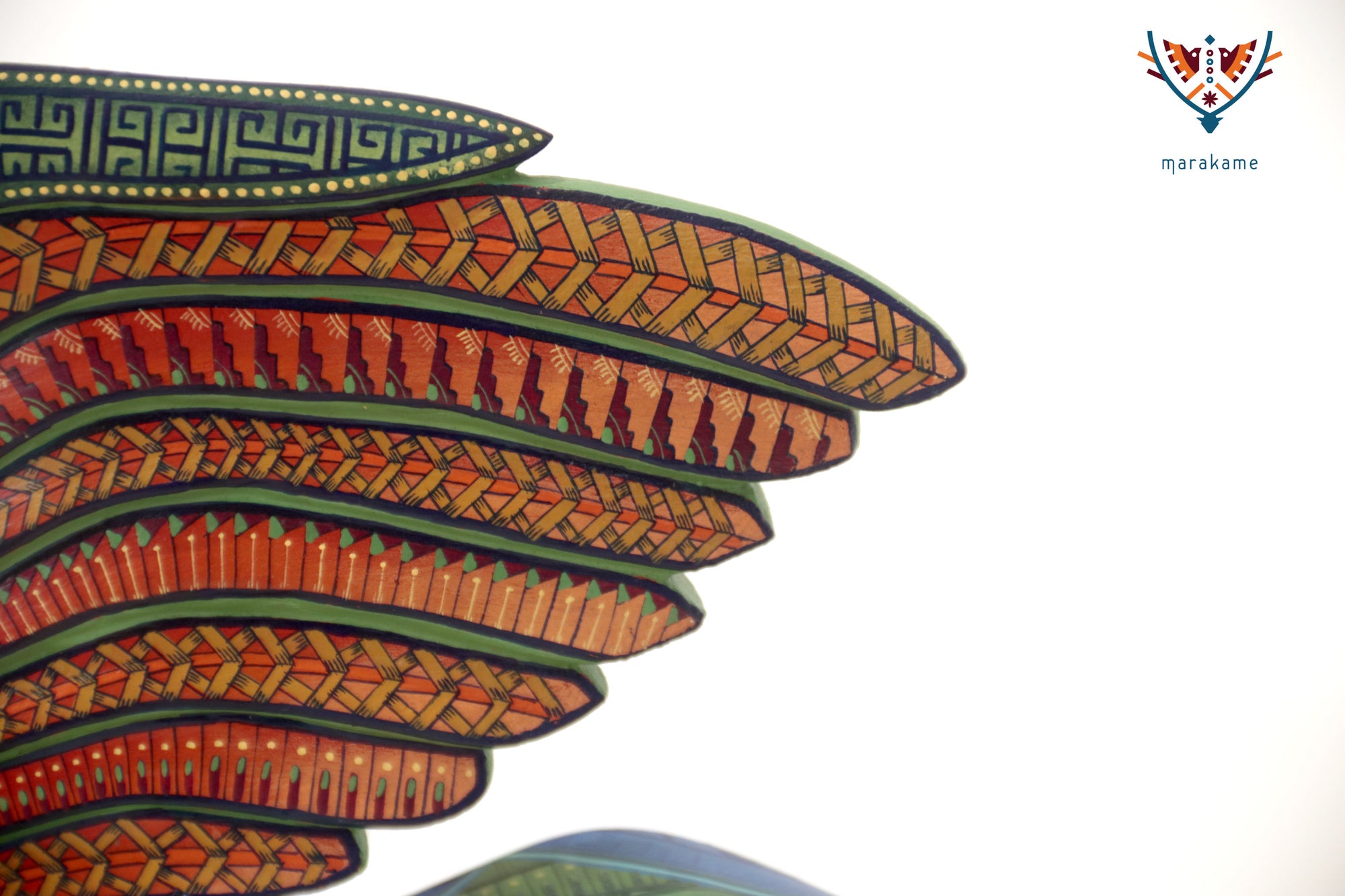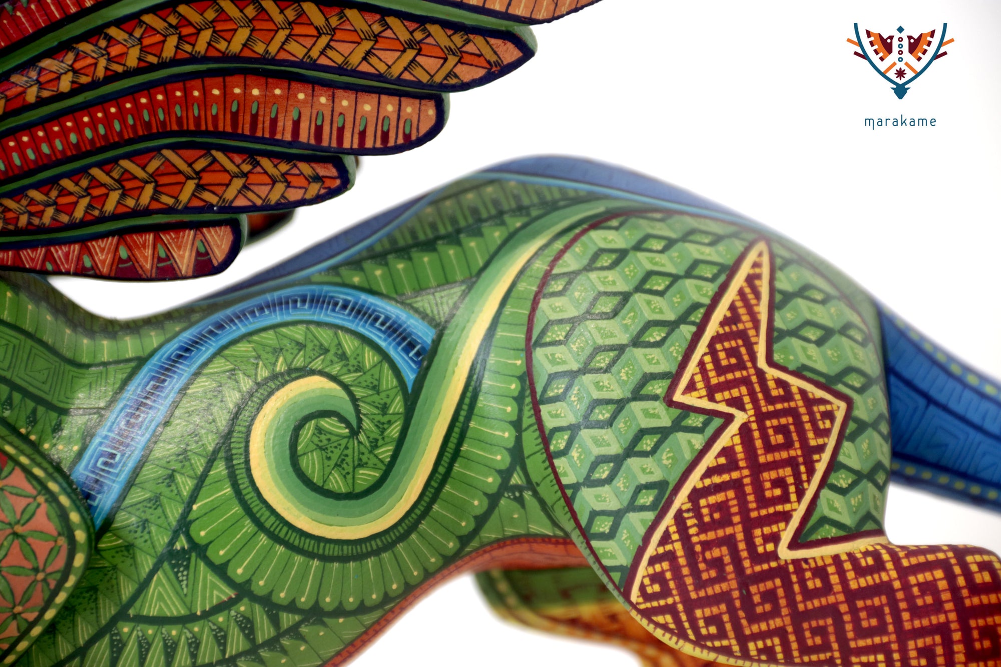 Cada sección del alebrije está decorada con patrones geométricos tradicionales, colores vibrantes y detalles perfectos que revelan el virtuosismo técnico del artesano. El movimiento fluye desde la cabeza hacia la cola ondulante, pasando por un diseño que equilibra energía, elegancia y fuerza mitológica.