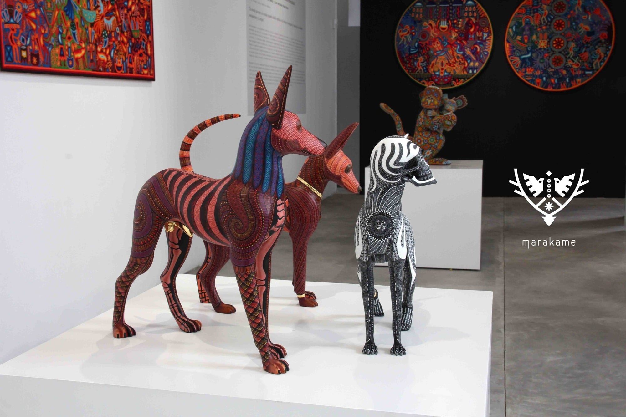 Amos afables de Xoloitzcuintles, Jacobo y María Angeles que parten de una tradición antigua y del vínculo con estos seres superlativos, comparten un conjunto de esculturas que dotan de lomos, trompas y orejas bien definidas, contemplando la subjetividad del arte en cada línea y trazo en blanco y negro, al final de color parduzco, no siendo casualidad atar su cuello en kilates y perfilar imponentes posturas del ser antiguo – ser imperial – Eterno Reposo confín remoto a la ofrenda a estos seres de inteligencia y personalidad magnífica que comparten el camino continuo para salvar tu alma en el mundo espiritual, terrenal y en el inframundo.