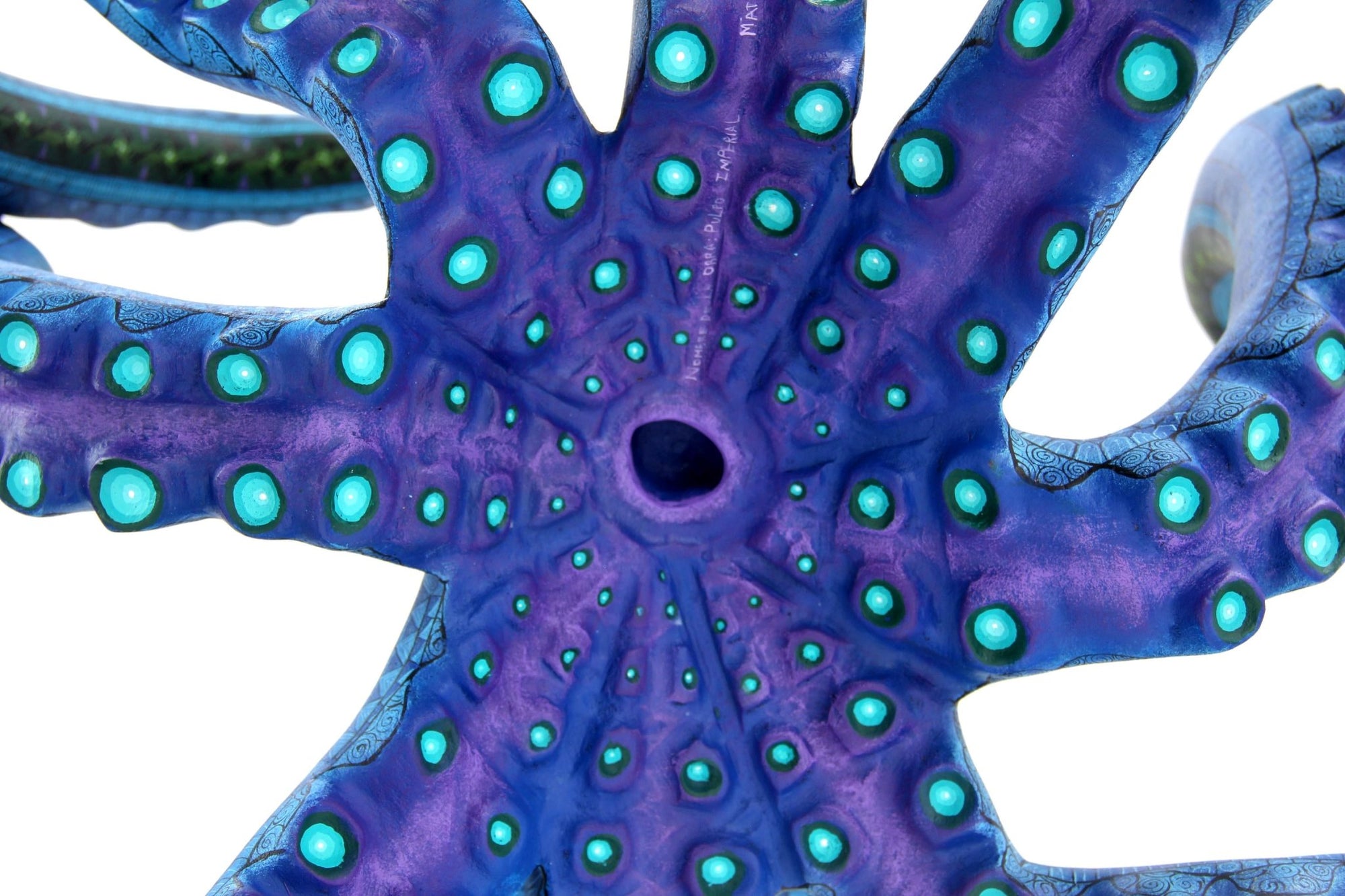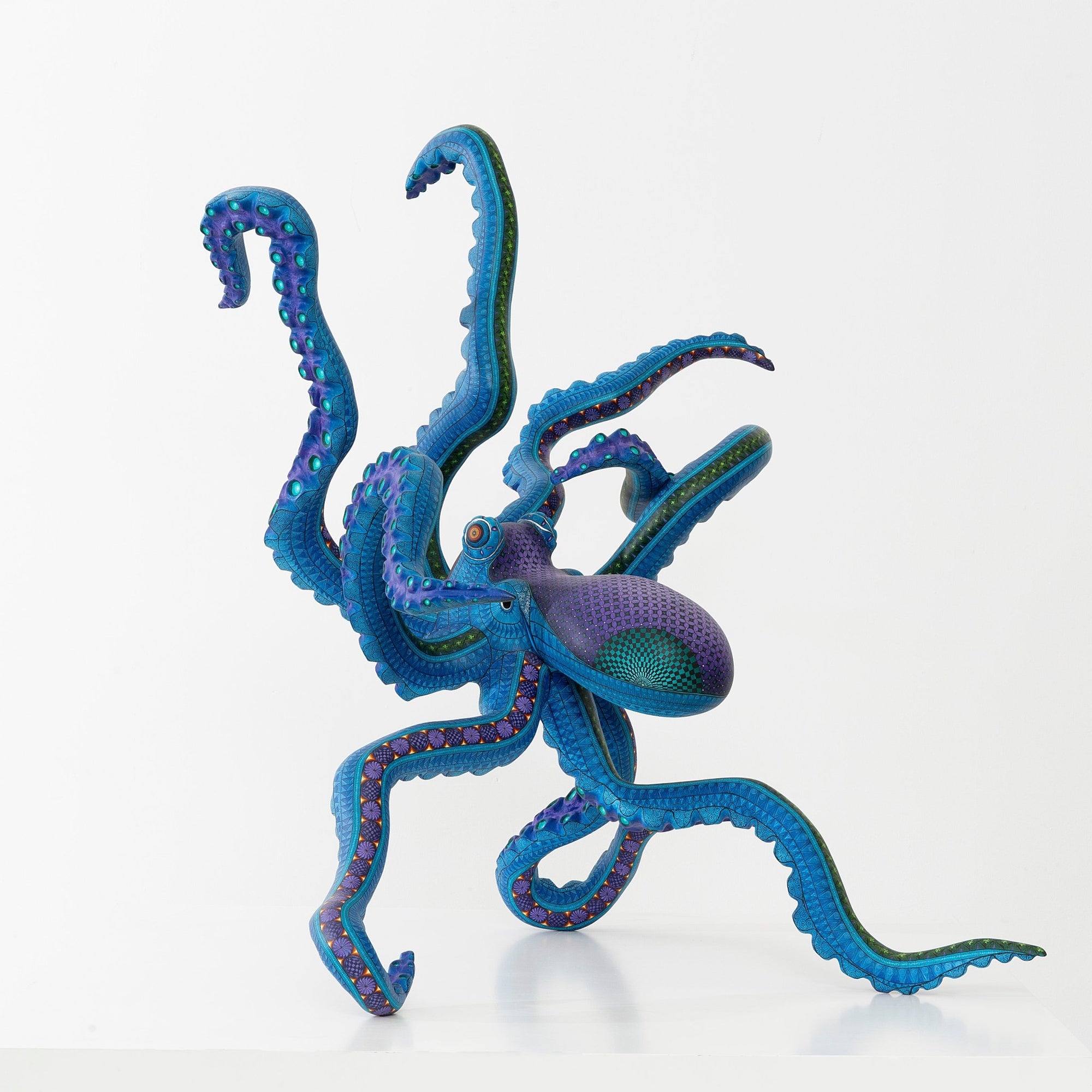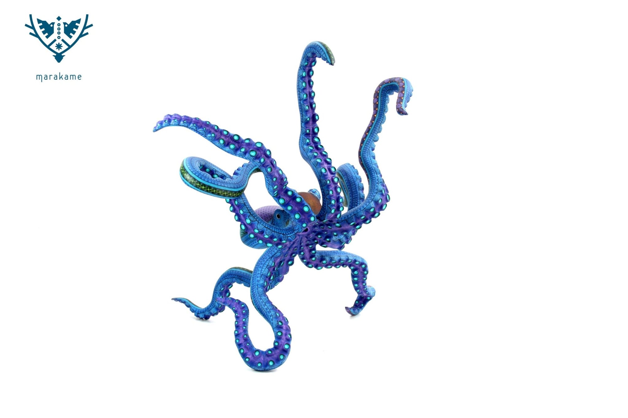 Procedentes del corazón del alebrije oaxaqueño contemporáneo, estos pulpos tiñen su piel del color profundo del mar donde habitan y realizan maravillas. En cada brazo habita una inteligencia y la simbología que les hermana con los astros y la cosmovisión zapoteca. Son una grata compañía para celebrar la creatividad de nuestros pueblos y la vida de los mares.