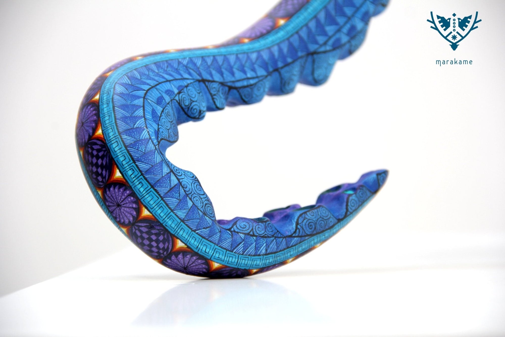 Esta selección especial de Alebrije oaxaqueño comisionada por Marakame a los mejores autores de alebrije moderno, es pintado a mano sobre talla en madera del árbol de copal (Bursera, spp), el cual crece a los alrededores de las comunidades de San Martín Tilcajete y San Antonio Arrazola, localidades de la región Zapoteca del Estado de Oaxaca, en el Sur de México. También se utiliza de forma común la talla en madera de cedro por las características de esta madera.