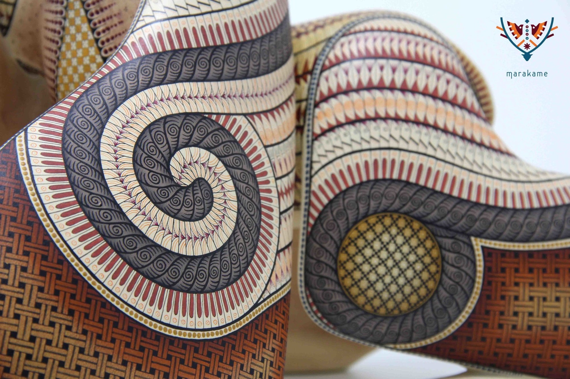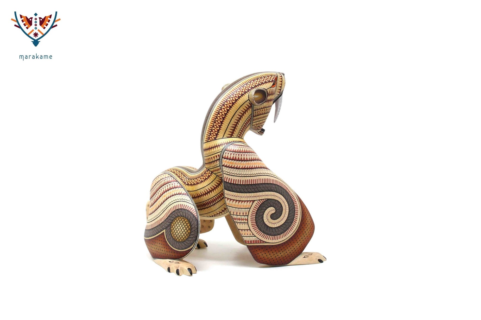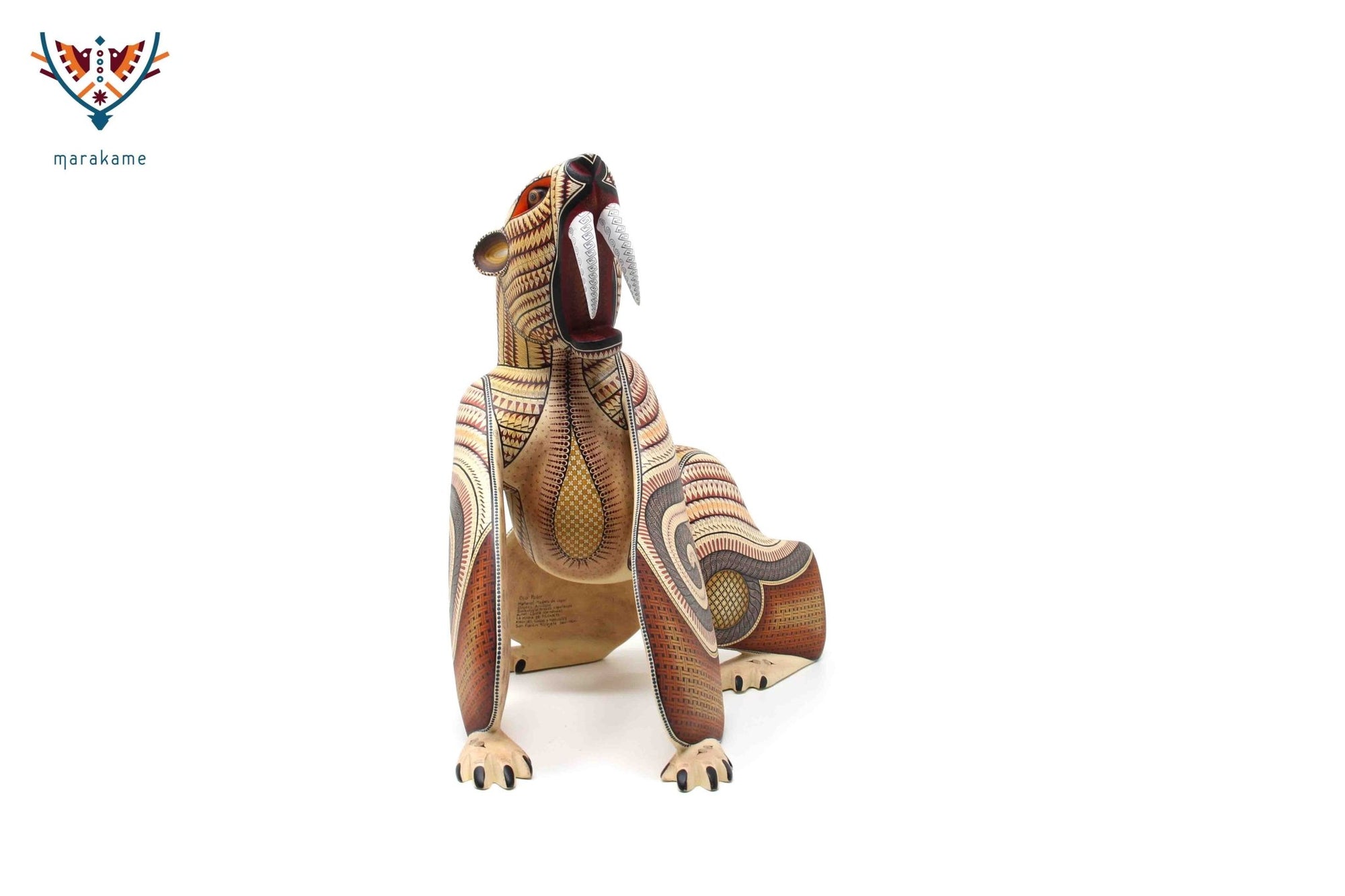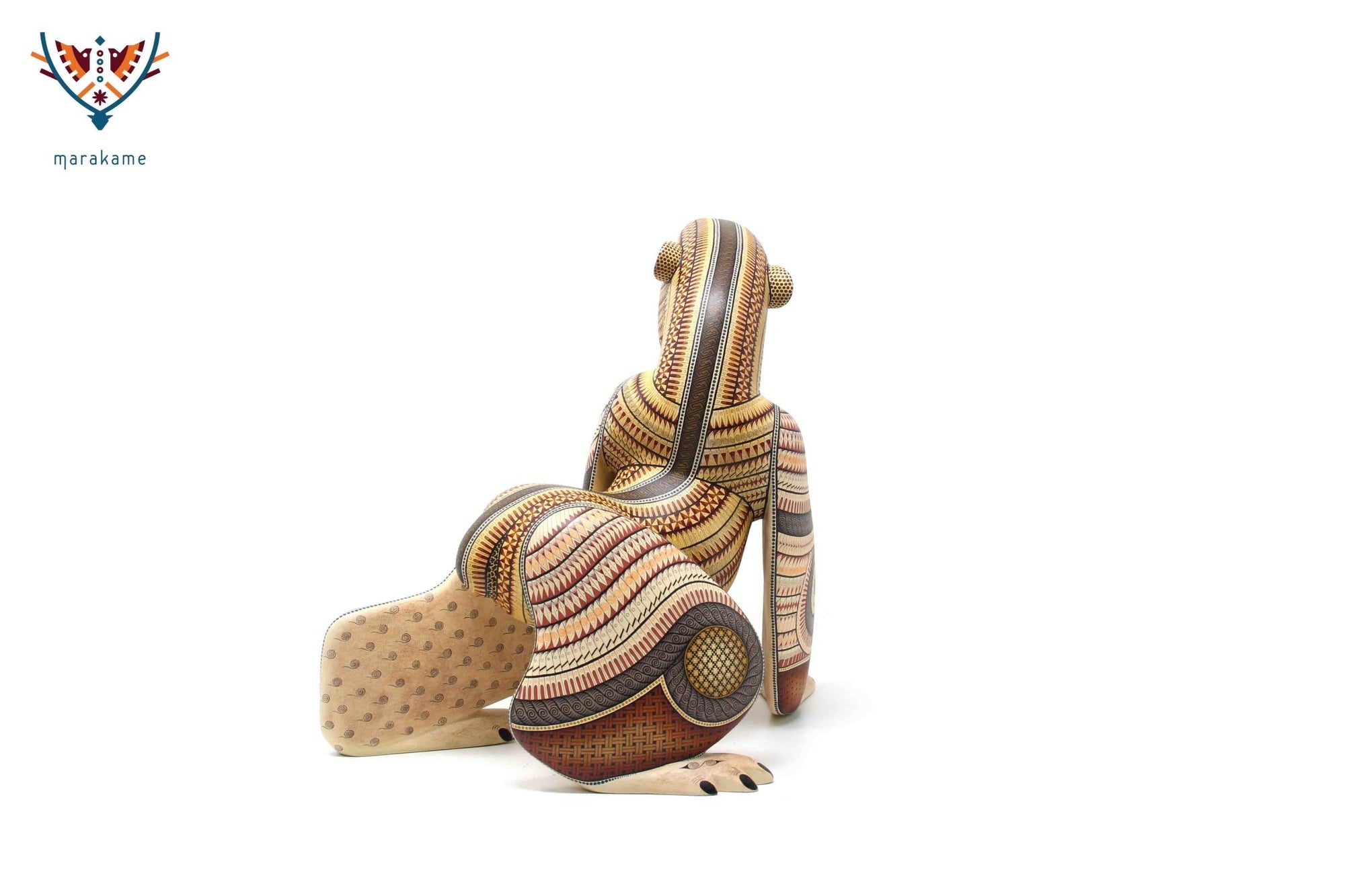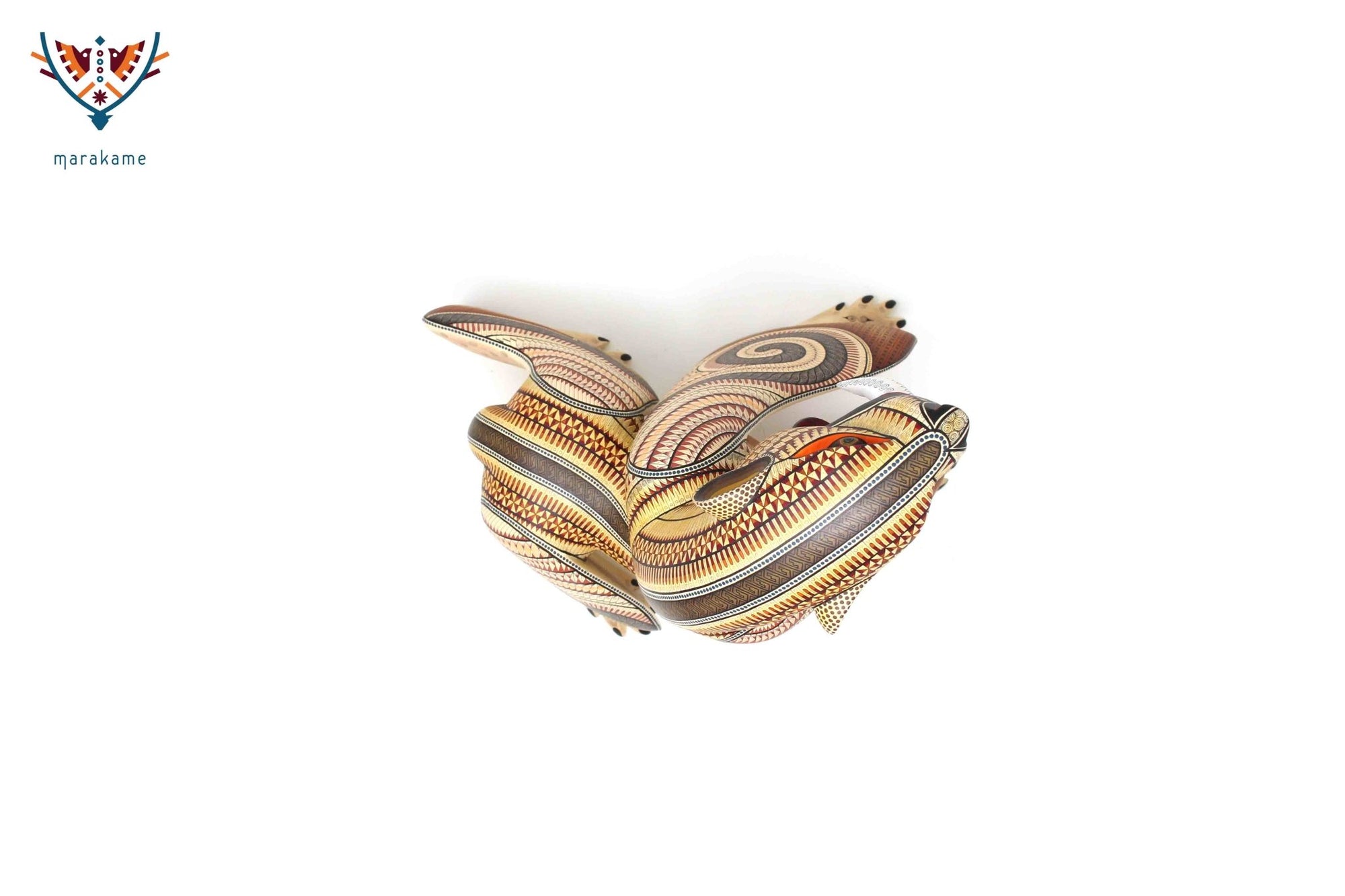 Esta selección especial de Alebrije oaxaqueño comisionada por Marakame a los mejores autores de alebrije moderno, es pintado a mano sobre talla en madera del árbol de copal (Bursera, spp), el cual crece a los alrededores de las comunidades de San Martín Tilcajete y San Antonio Arrazola, localidades de la región Zapoteca del Estado de Oaxaca, en el Sur de México.