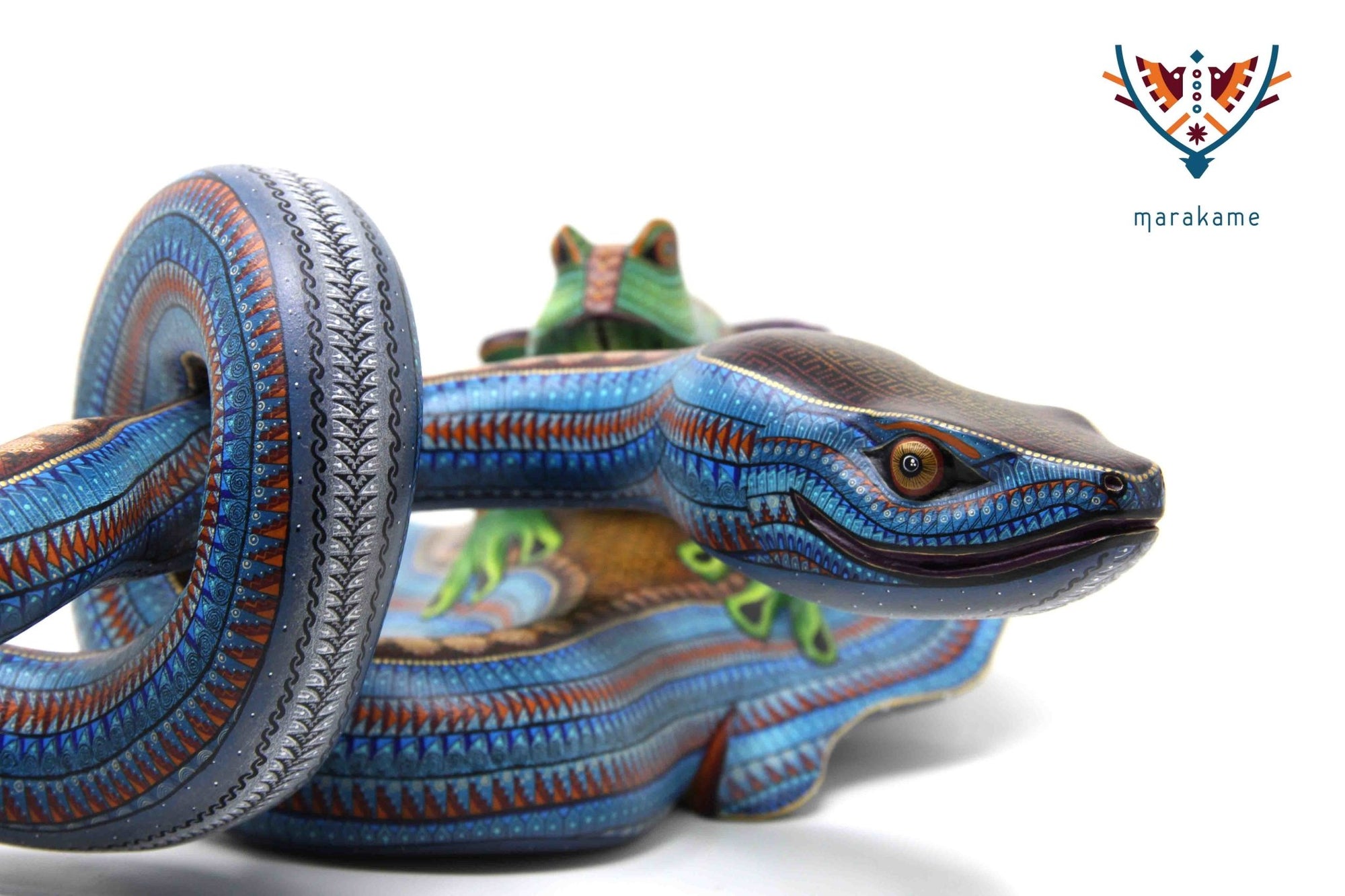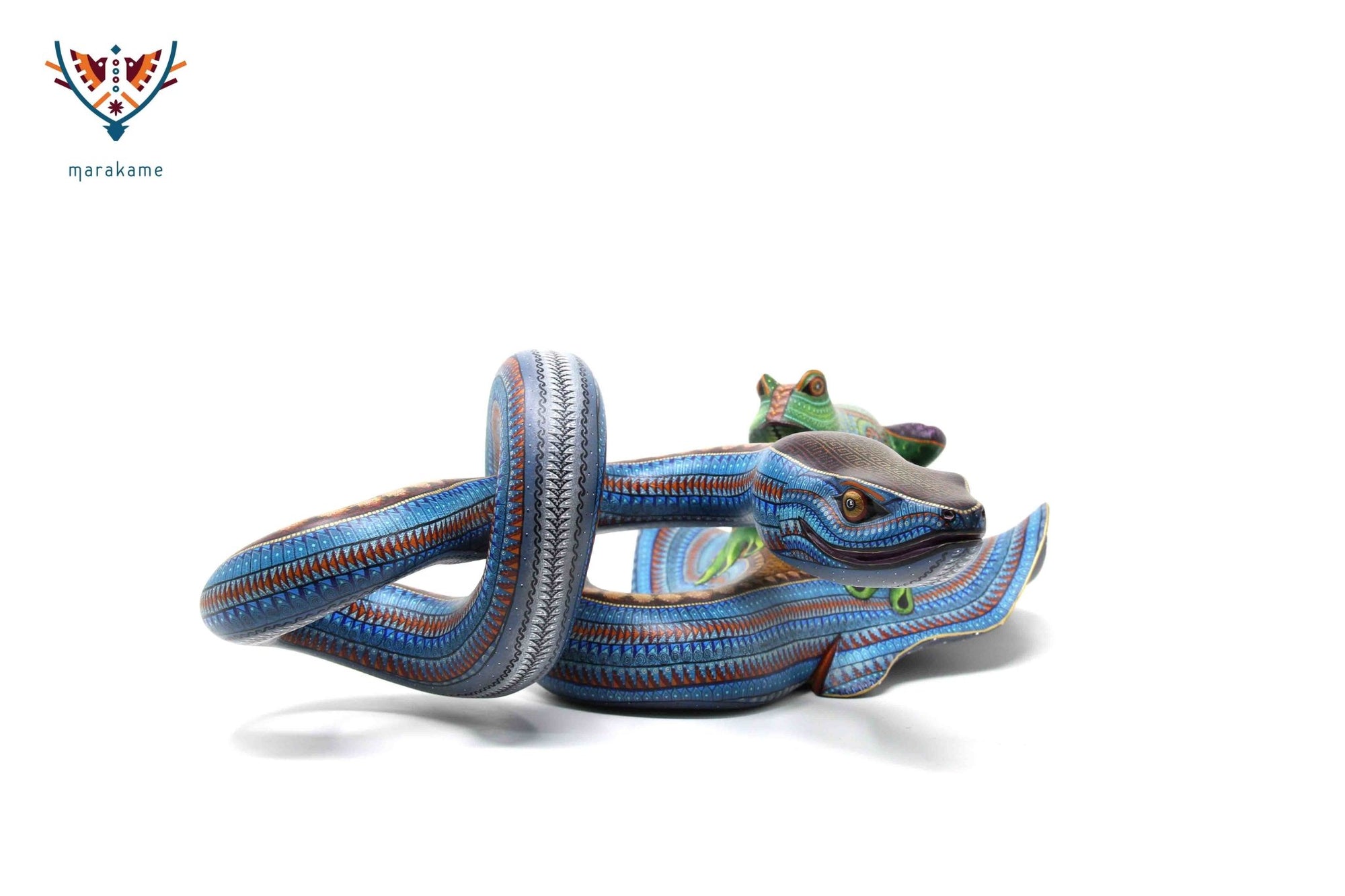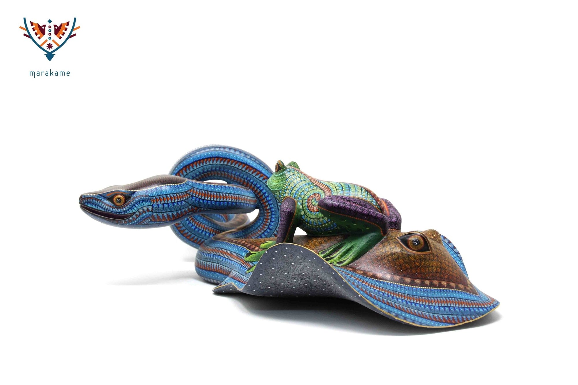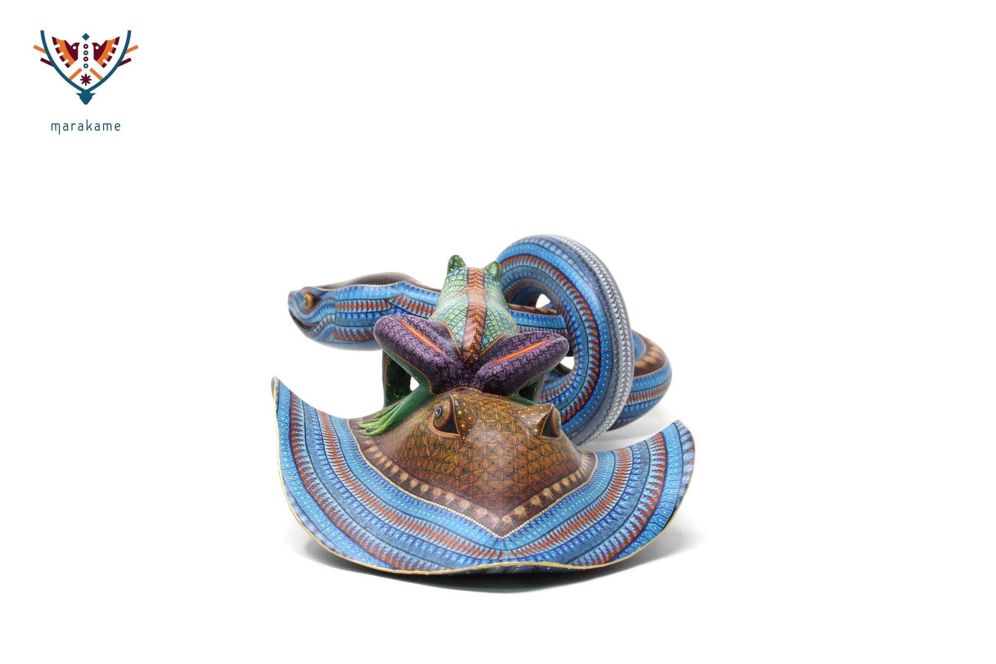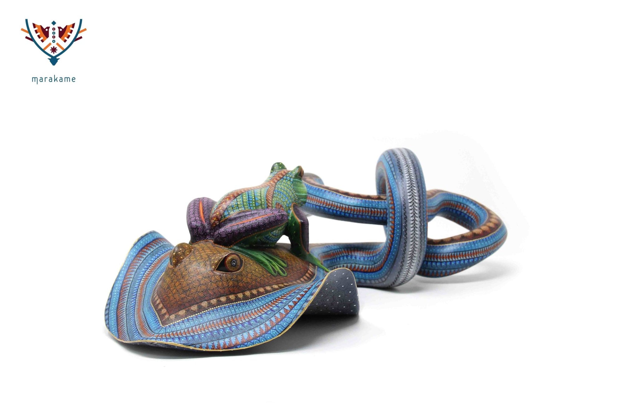 Esta selección especial de Alebrije oaxaqueño comisionada por Marakame a los mejores autores de alebrije moderno, es pintado a mano sobre talla en madera del árbol de copal (Bursera, spp), el cual crece a los alrededores de la comunidad de San Martín Tilcajete, localidad de la región Zapoteca del Estado de Oaxaca, en el Sur de México.