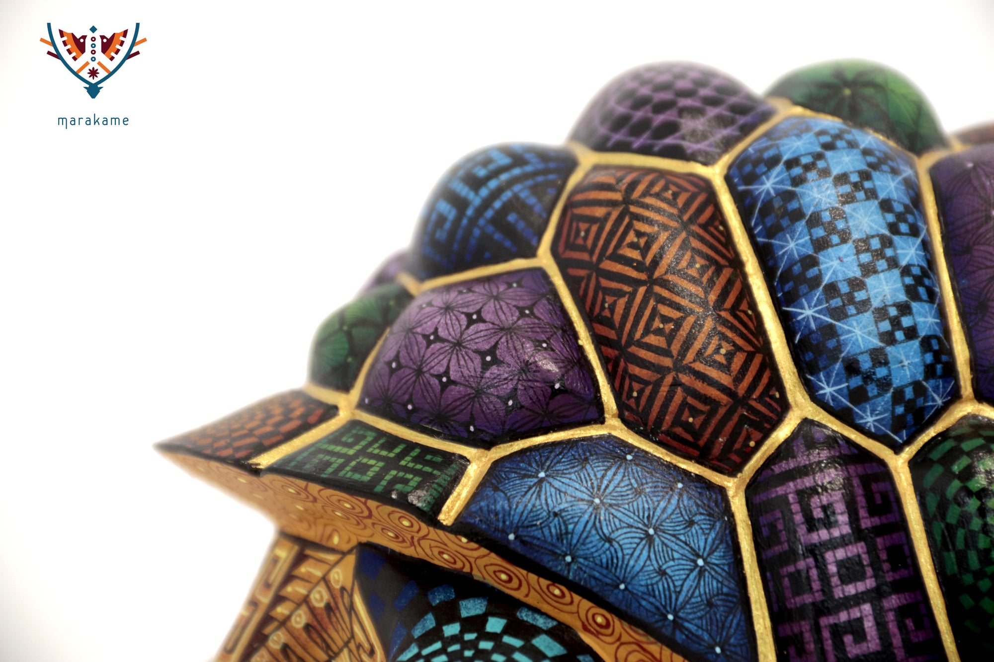 Esta tortuga alebrije, titulada Memoria que Camina, es una obra que combina paciencia, fortaleza y tradición. Cada segmento del caparazón está pintado a mano con patrones geométricos en tonos verdes, morados, azules y ocres, simbolizando los distintos ciclos de la vida y la sabiduría acumulada con el tiempo.