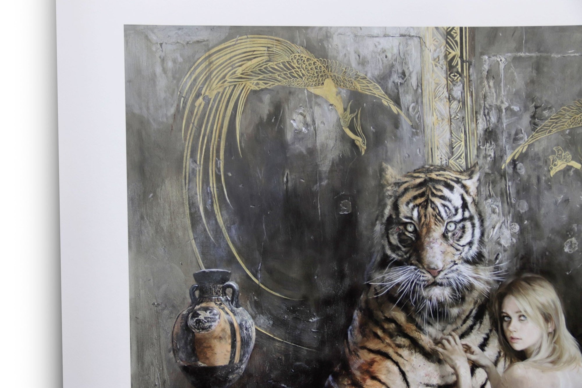 "Beti" presenta un cautivador equilibrio entre vulnerabilidad y poder. La joven, con su mirada introspectiva, contrasta con la intensidad del tigre, símbolo de fuerza y misterio. El fondo, con intrincados detalles dorados y tonos desgastados, crea un ambiente etéreo y onírico, característico del estilo de Guillermo Lorca. Esta obra es un homenaje a la conexión simbiótica entre la humanidad y la naturaleza, envuelto en la estética sublime del realismo mágico.