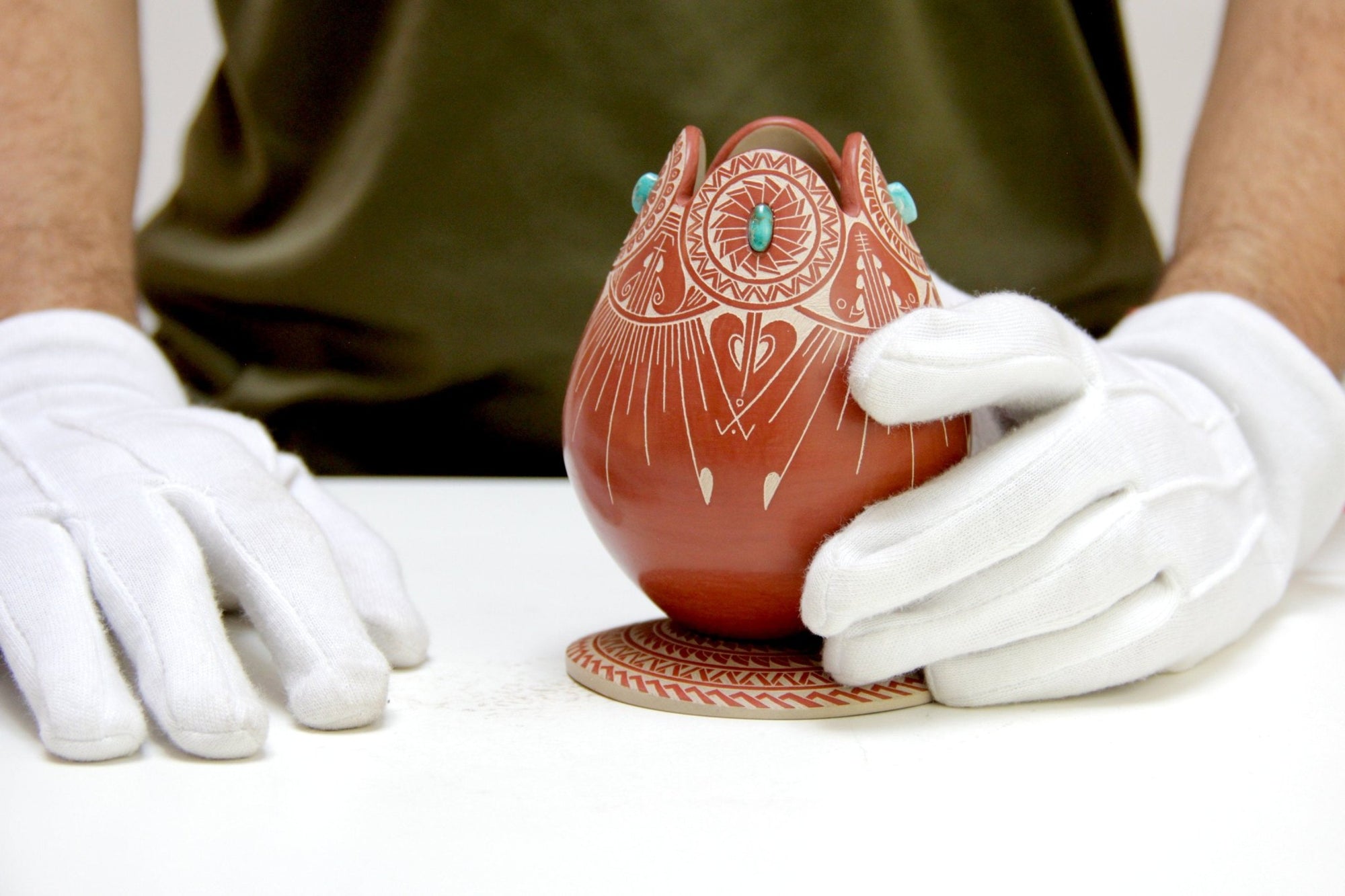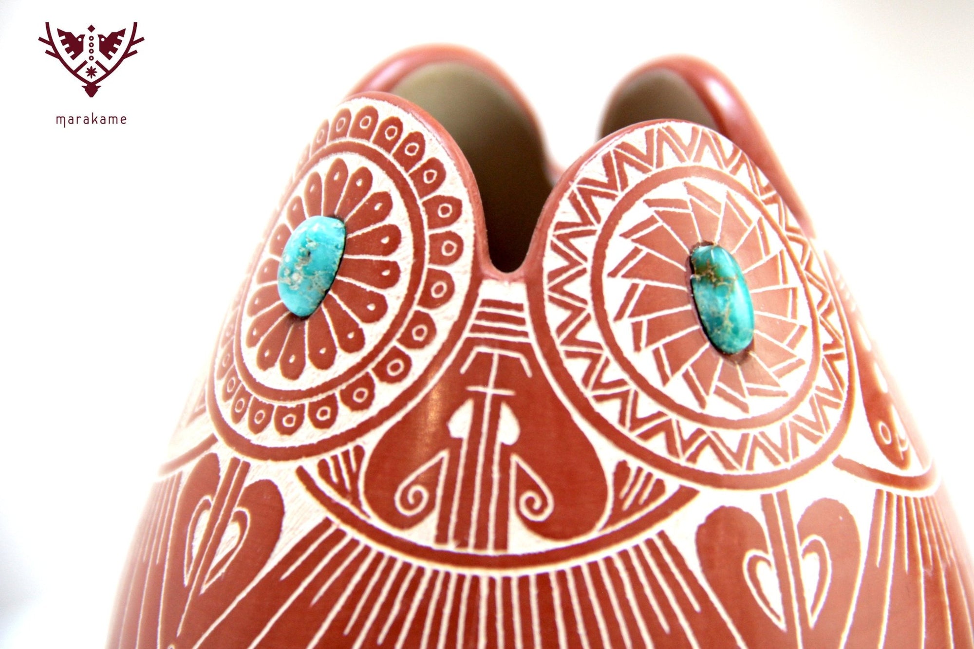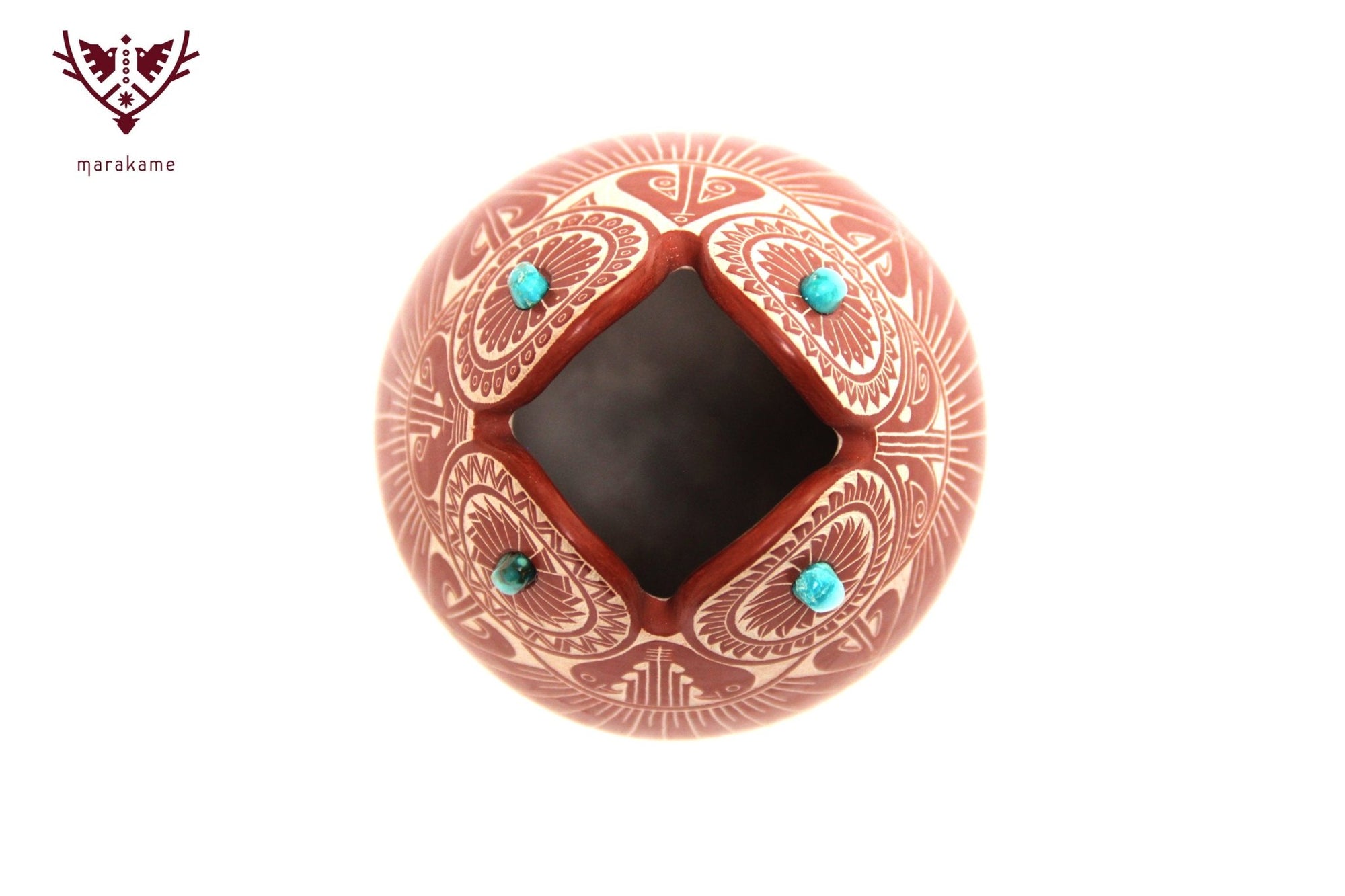 Cerámica de Mata Ortiz - Pieza roja con turquesas