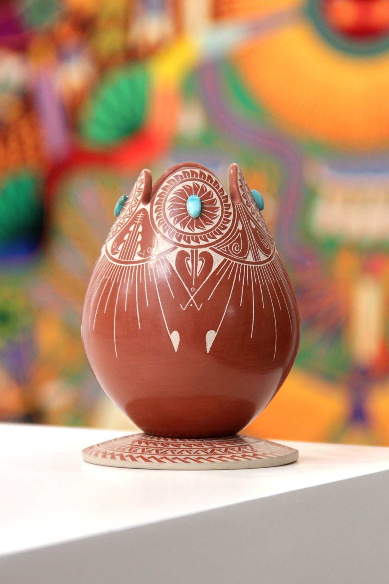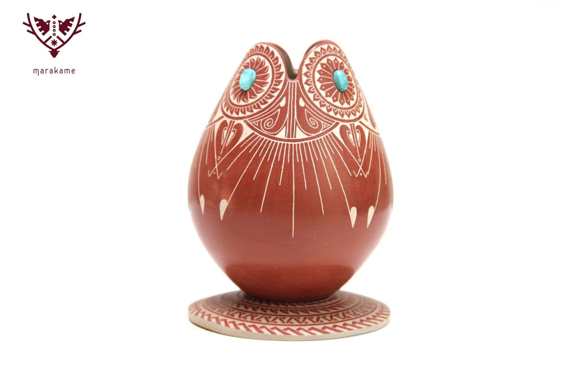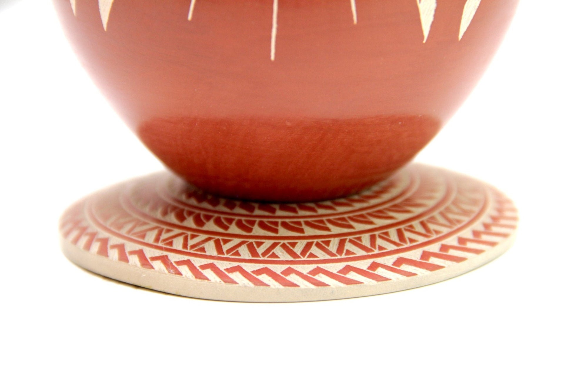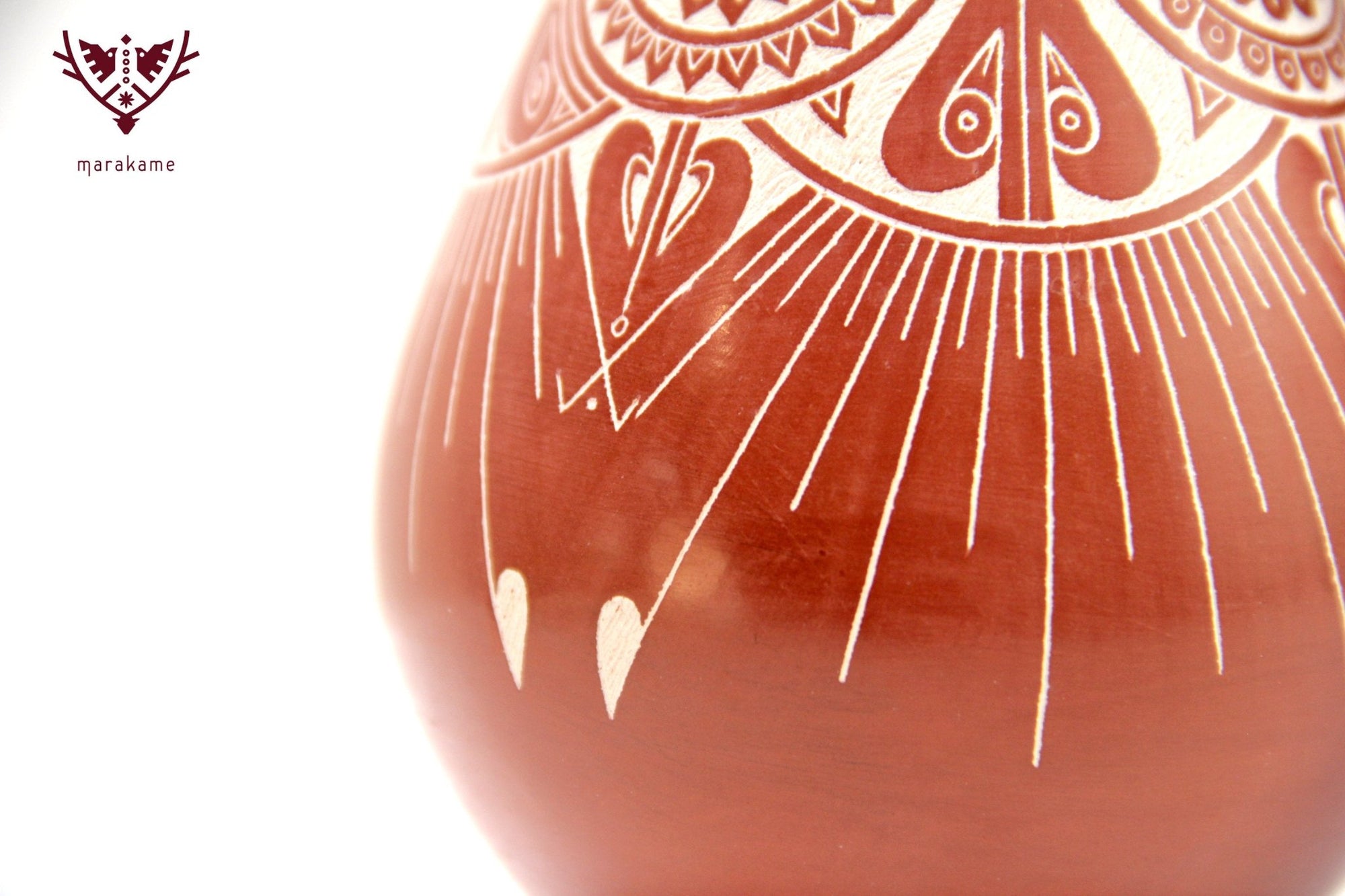 Esta delicada pieza de cerámica roja de Mata Ortiz es una joya artesanal que destaca tanto por su color vibrante como por su fina elaboración. Creada a mano por talentosos artesanos, cada línea y detalle geométrico en su superficie refleja la tradición y habilidad que caracteriza a la alfarería mexicana. Su tamaño compacto la convierte en el acento perfecto para decorar espacios pequeños, añadiendo un toque auténtico y lleno de color a cualquier rincón.