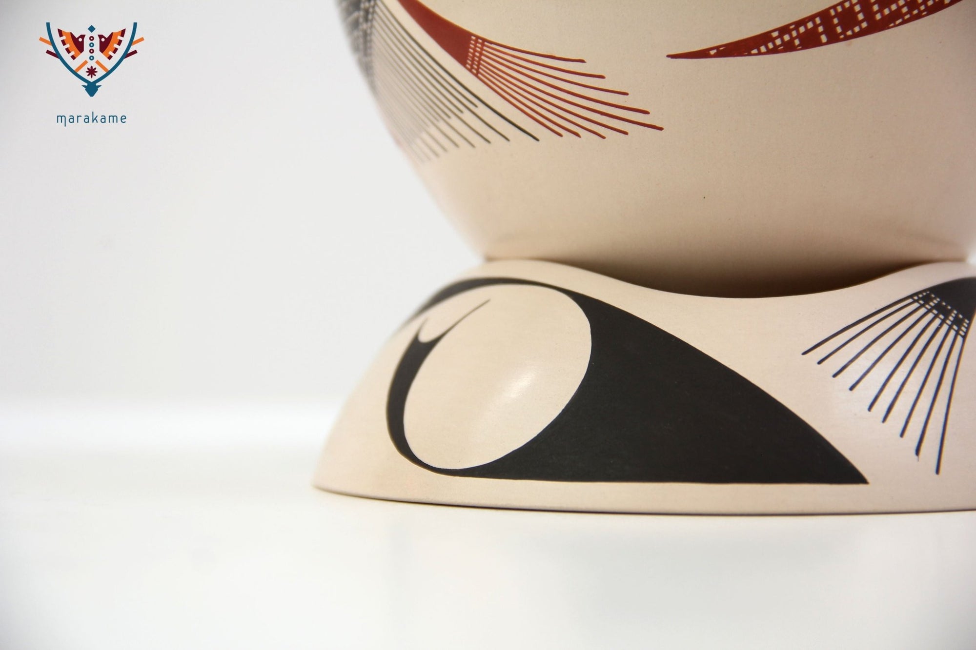 En esta pieza extraordinaria apreciamos la presencia de símbolos de aire (como el rehilete o remolino negro en una de sus caras) y la cercanía del diseño pictórico con la apariencia textil. La labor cerámica de Elías Peña es integradora: reúne en un mismo lugar y tiempo nociones que pertenecen a diferentes ámbitos, creando un bello matrimonio entre naturaleza y cultura.