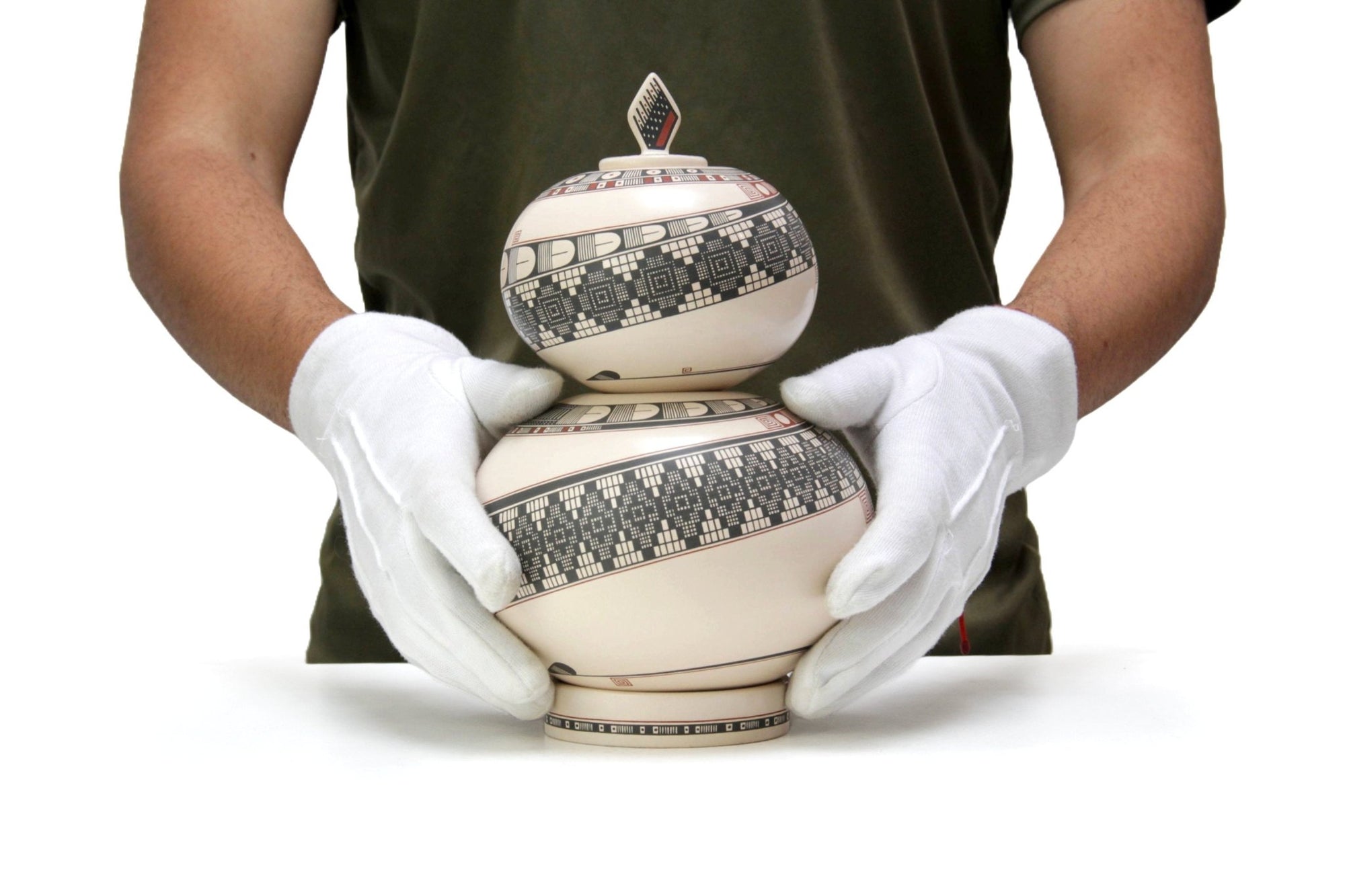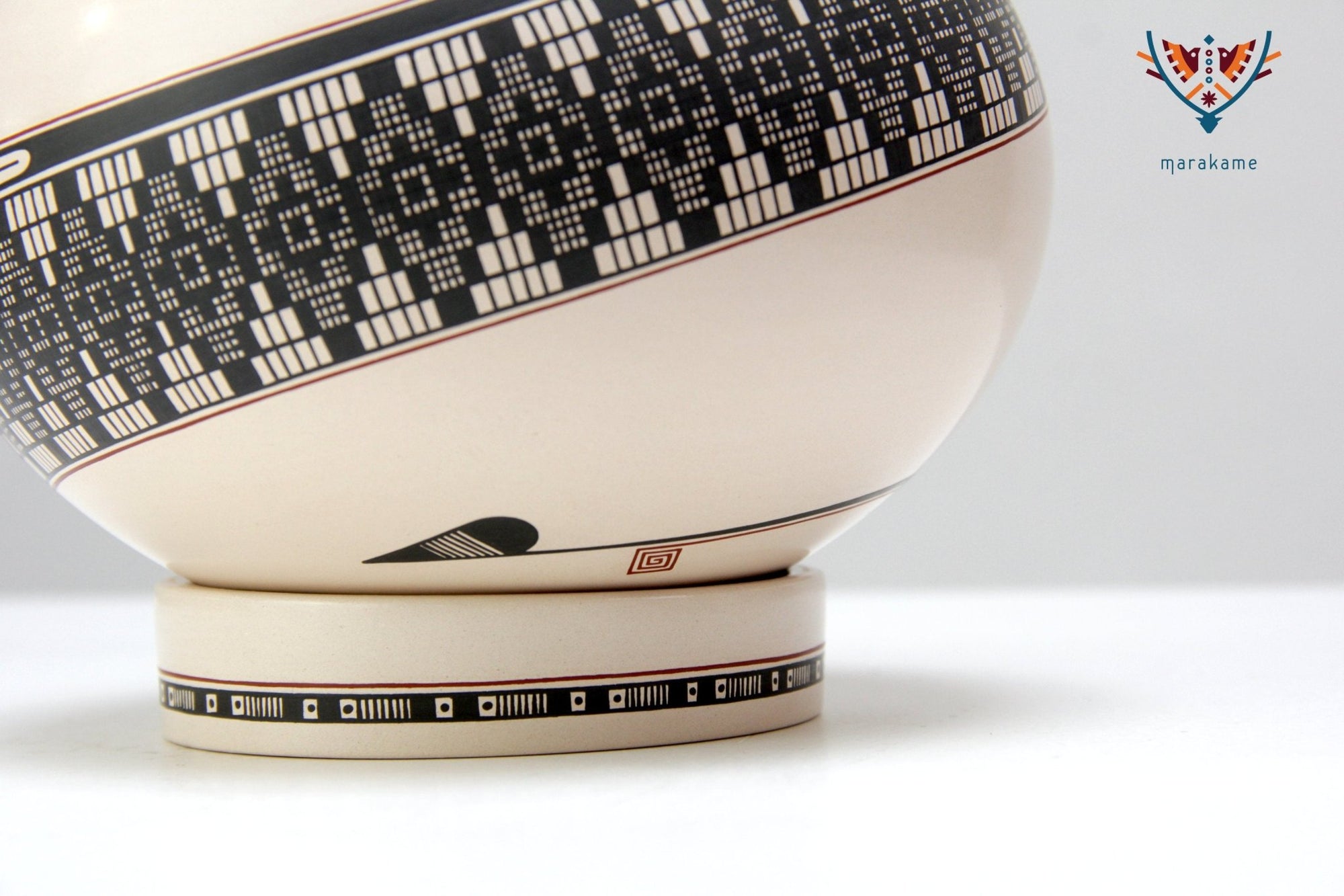 La cerámica tiene un toque elegante y sofisticado, con líneas suaves y curvas que invocan la belleza y la armonía. Los detalles geométricos pintados a mano crean un contraste interesante con la textura suave de la cerámica, haciendo que la pieza sea aún más atractiva. La cerámica es una pieza única y emotiva que invita a reflexionar sobre la belleza y la creatividad en la artesanía. Su diseño geométrico y sus detalles pintados a mano hacen que sea un regalo emocionante para cualquier amante de la cerámica y el arte.