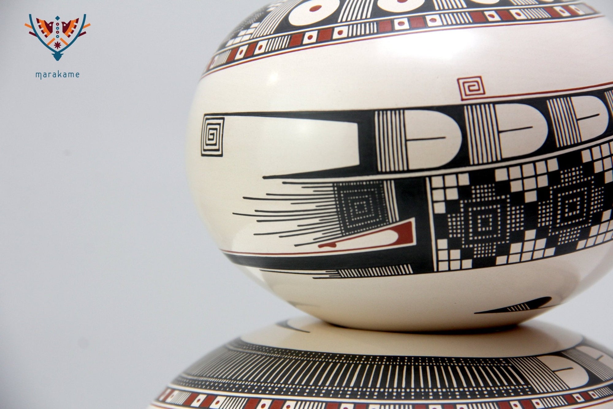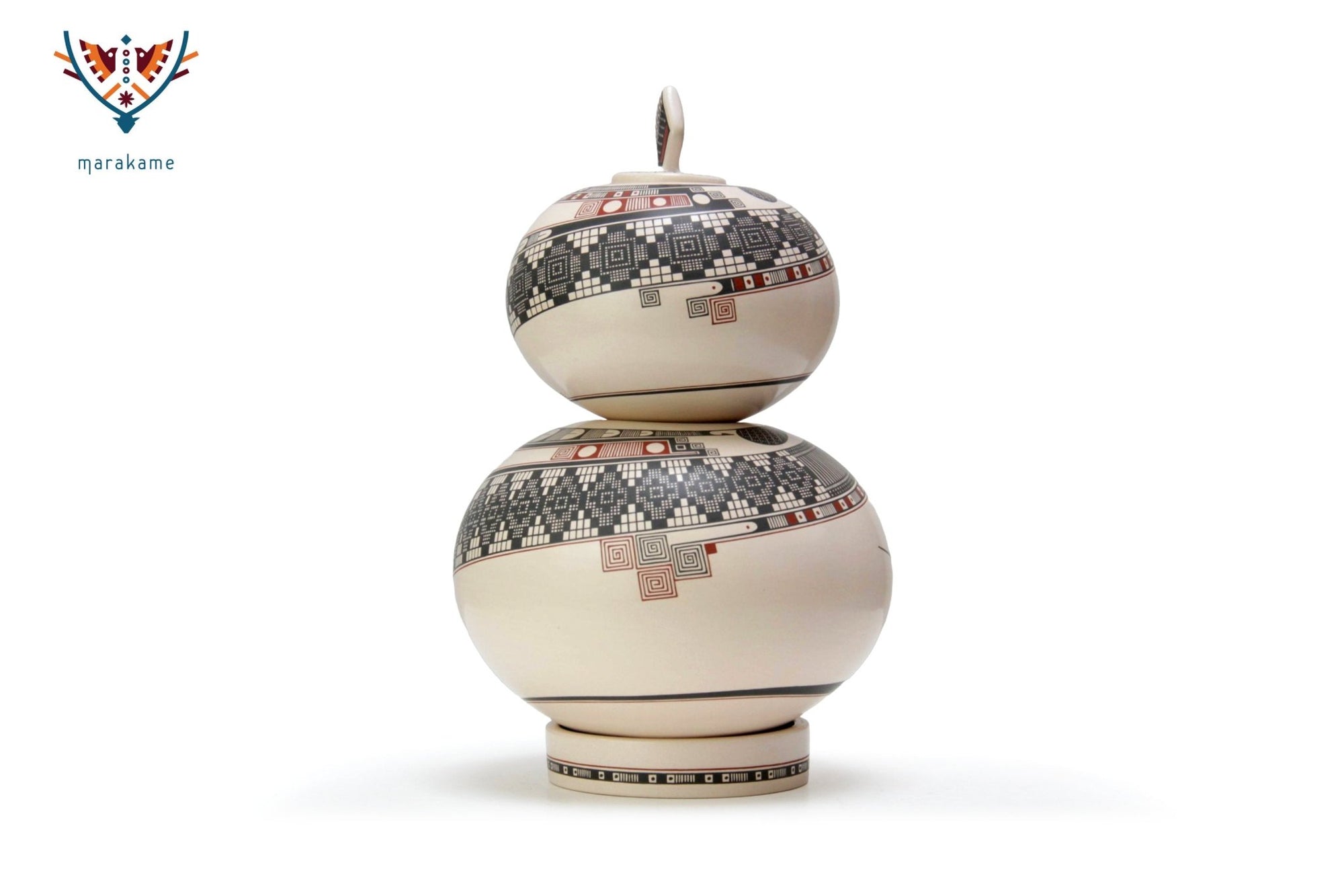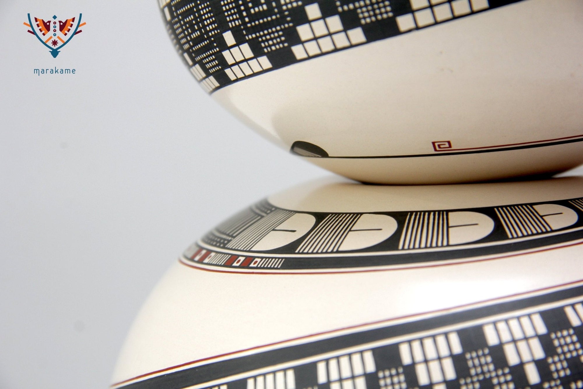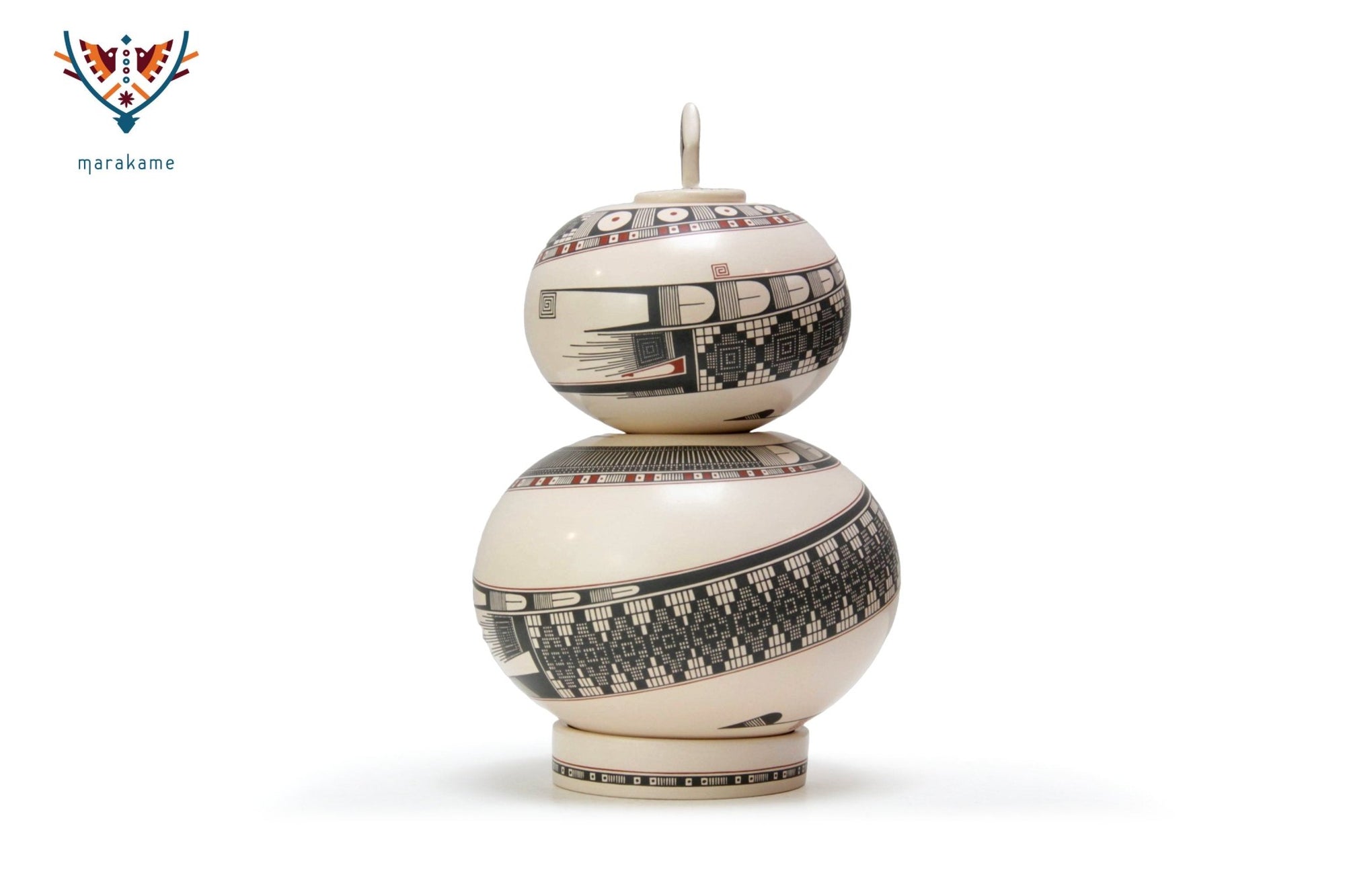 Esta hermosa pieza de cerámica presenta dos esferas redondas que se superponen en un efecto visual interesante, creando una composición dinámica y atractiva. La superficie de las esferas está ornamentada con detalles geométricos pintados a mano, que reflejan la habilidad y el talento del artista.