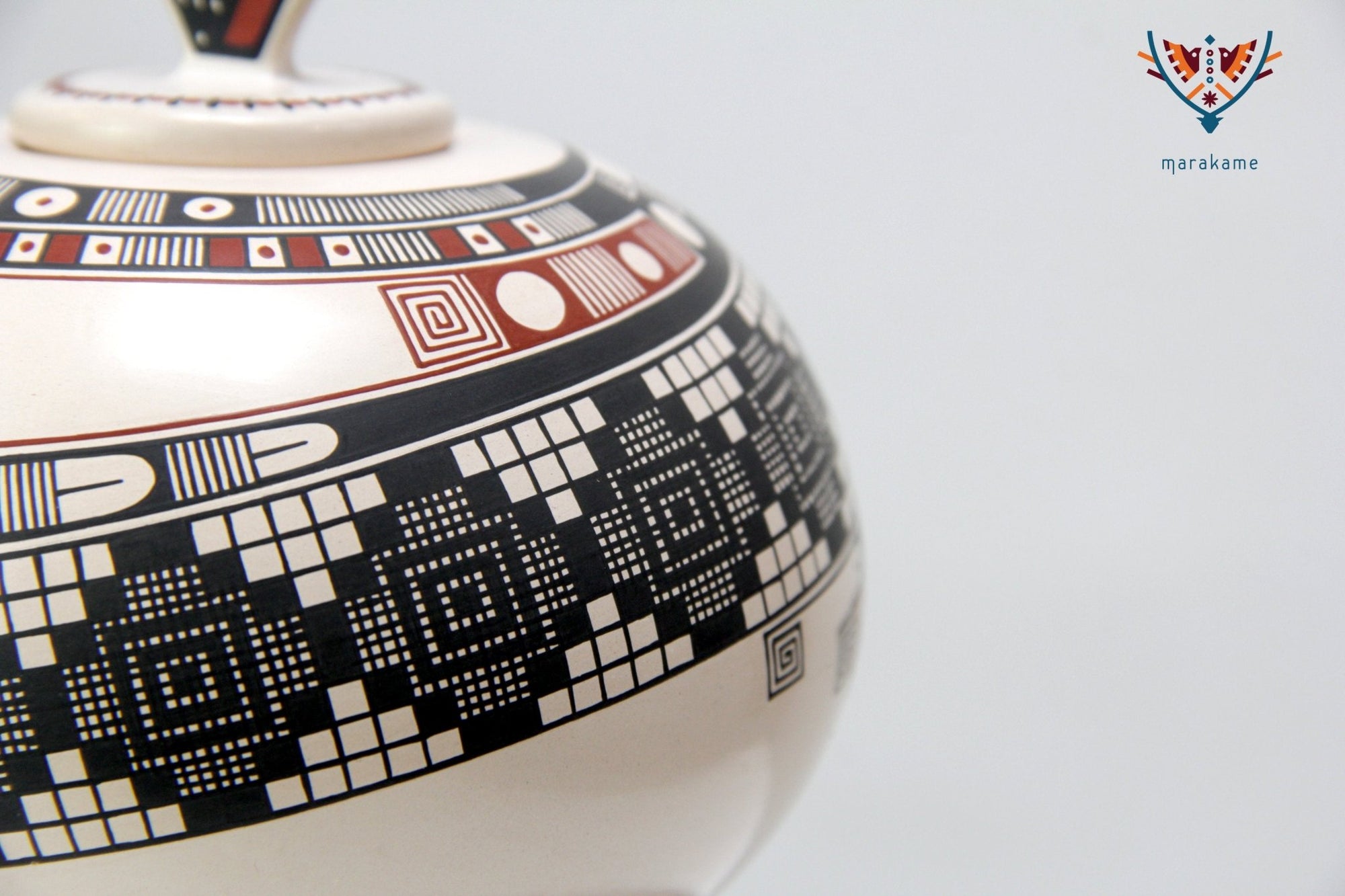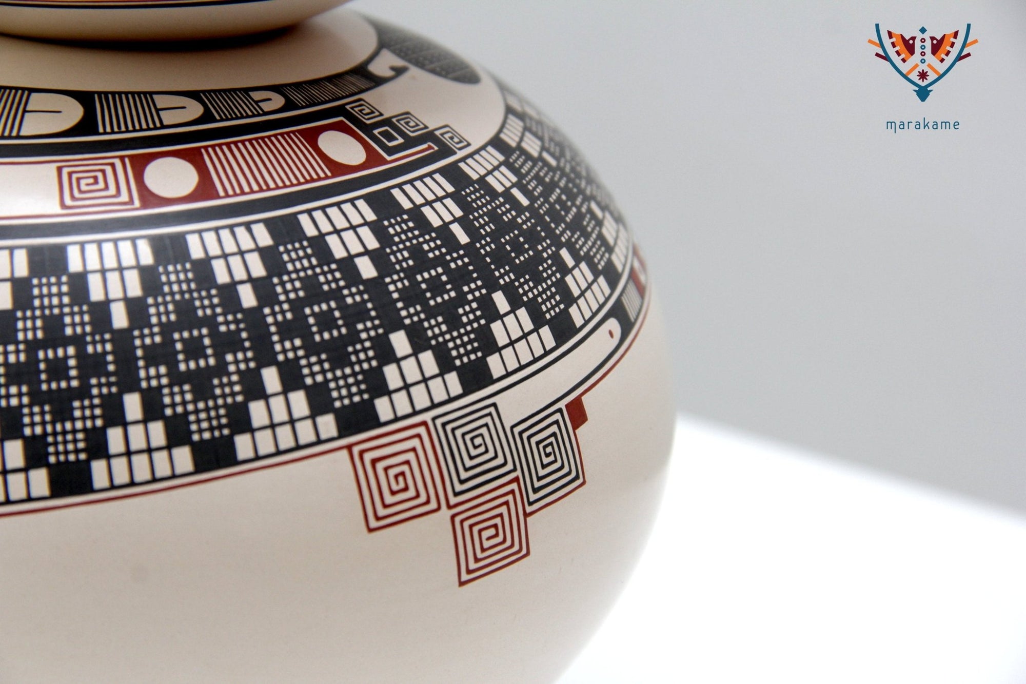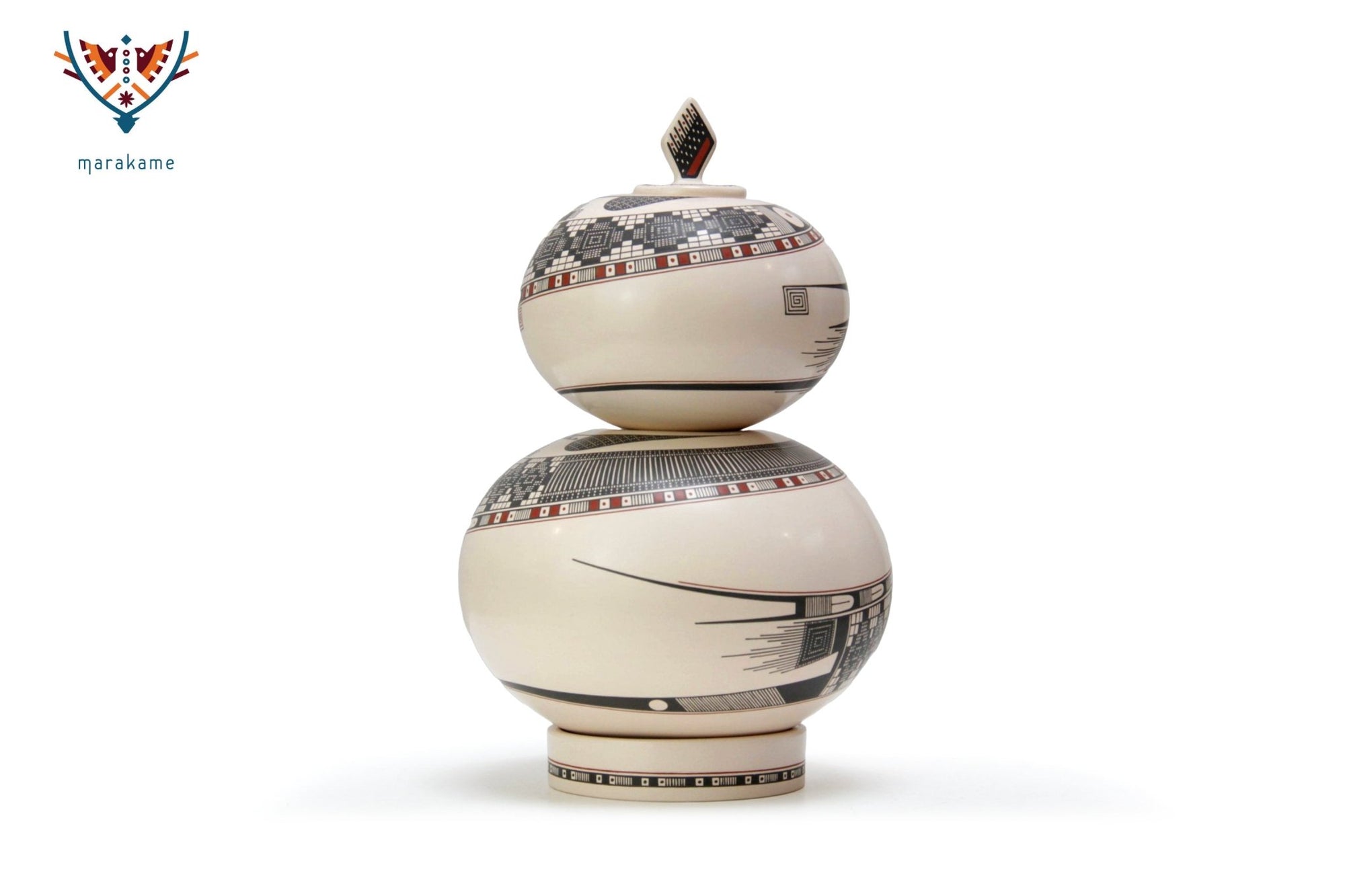 Esta hermosa pieza de cerámica presenta dos esferas redondas que se superponen en un efecto visual interesante, creando una composición dinámica y atractiva. La superficie de las esferas está ornamentada con detalles geométricos pintados a mano, que reflejan la habilidad y el talento del artista.