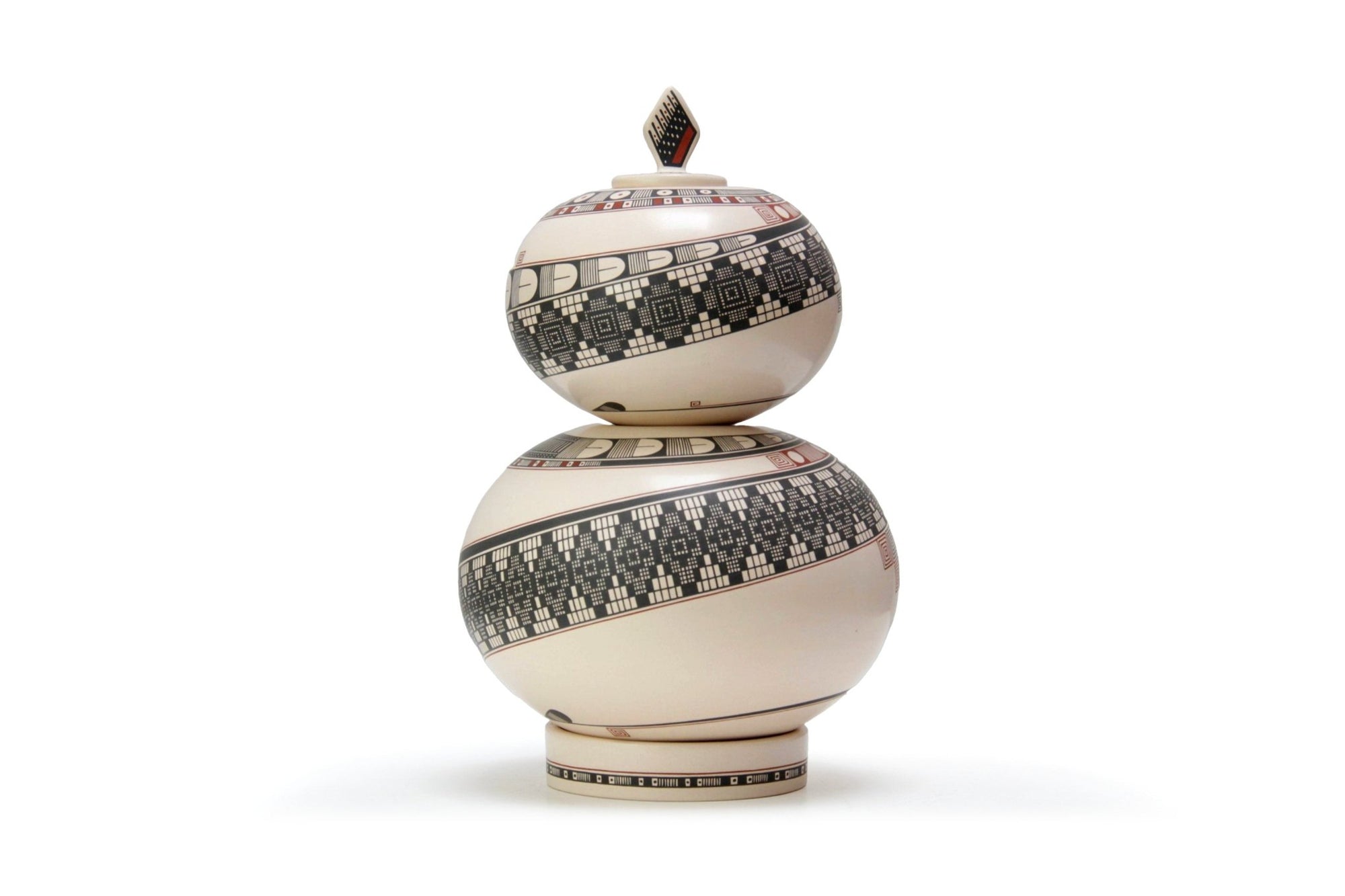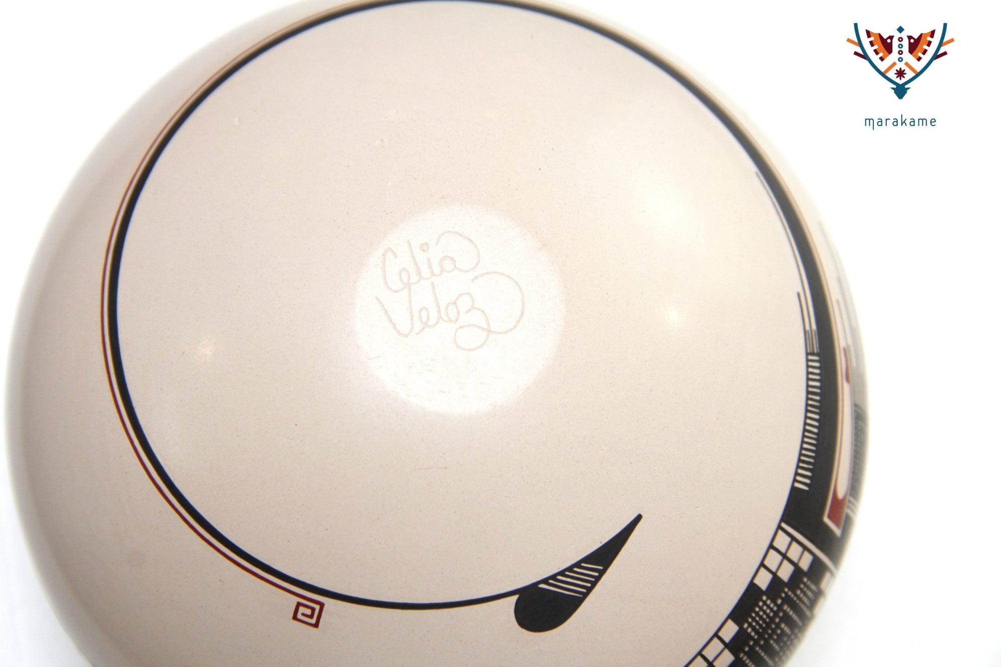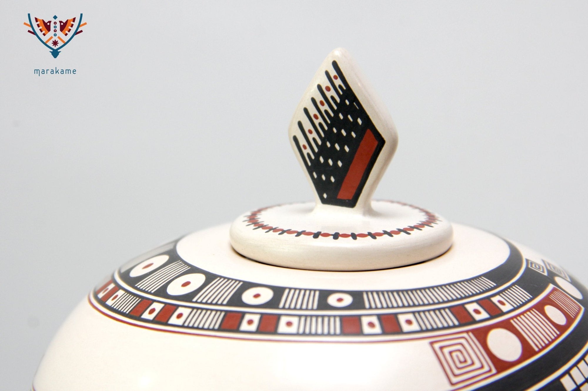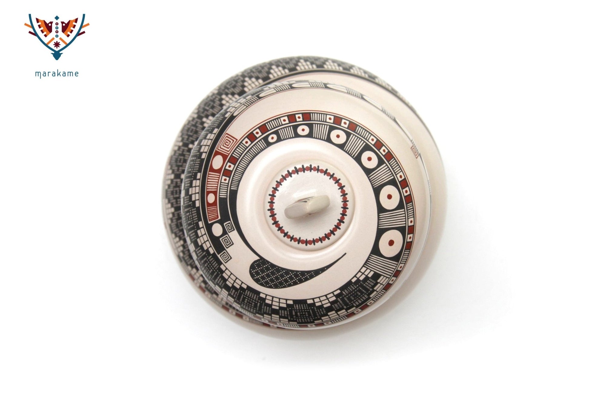 Esta hermosa pieza de cerámica presenta dos esferas redondas que se superponen en un efecto visual interesante, creando una composición dinámica y atractiva. La superficie de las esferas está ornamentada con detalles geométricos pintados a mano, que reflejan la habilidad y el talento del artista.