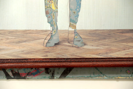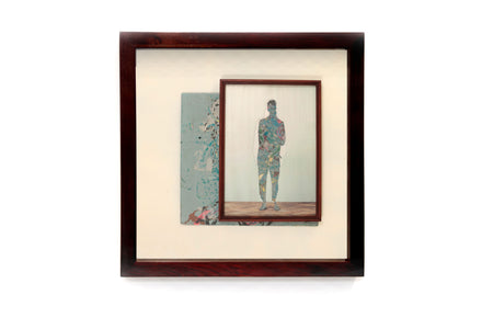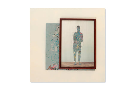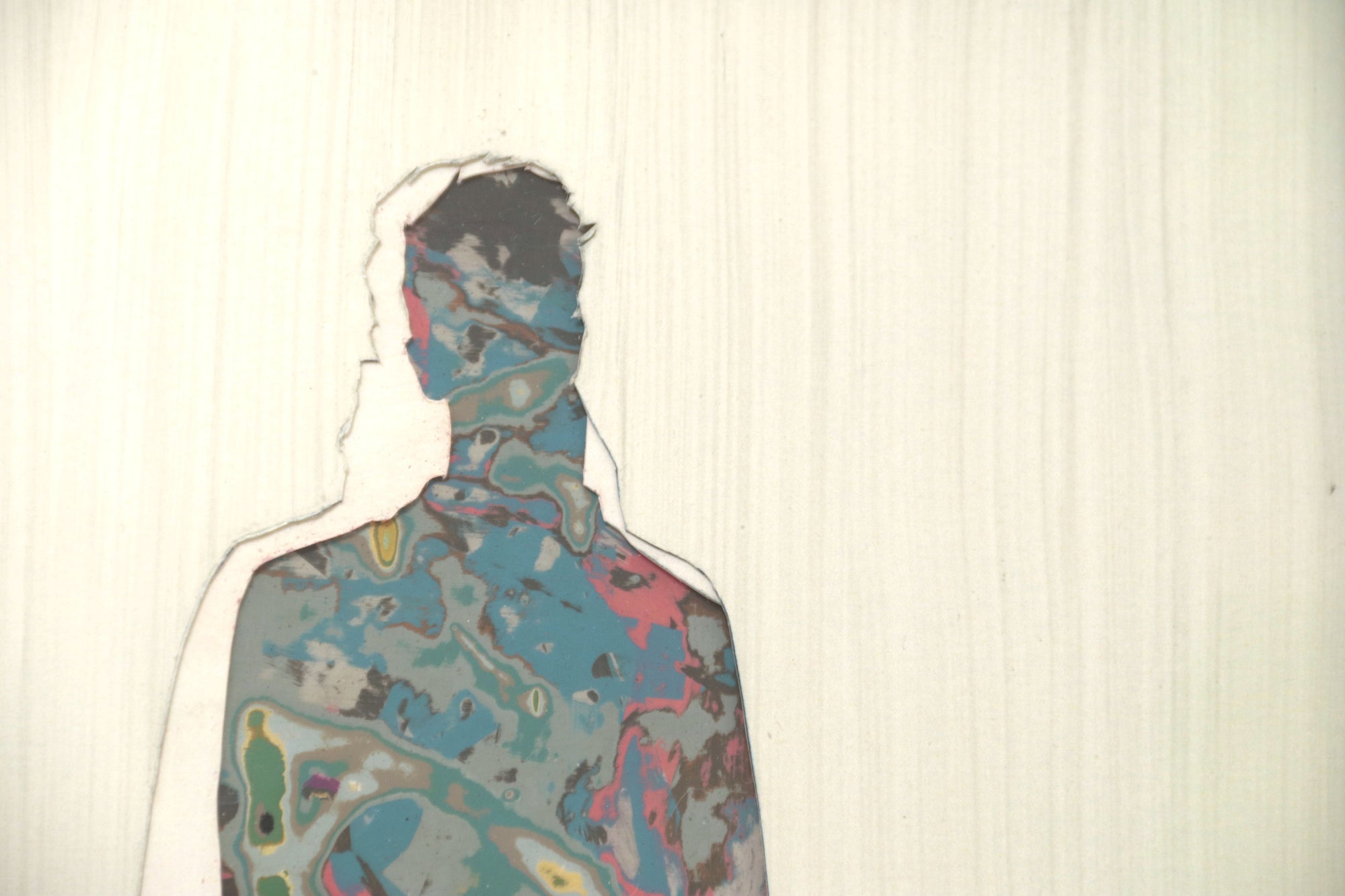 La figura central se erige como un contenedor de mundos invisibles: en lugar de mostrar la piel, se revela un mapa de colores, formas y texturas que sugieren lo que late debajo de lo aparente. La sombra duplicada, casi espectral, acompaña al cuerpo como recordatorio de que nuestra identidad nunca es unívoca, sino un tejido de memorias, emociones y capas ocultas. La superposición de materiales refuerza esta idea: lo visible es apenas la superficie de un entramado interior que permanece en constante movimiento y transformación.