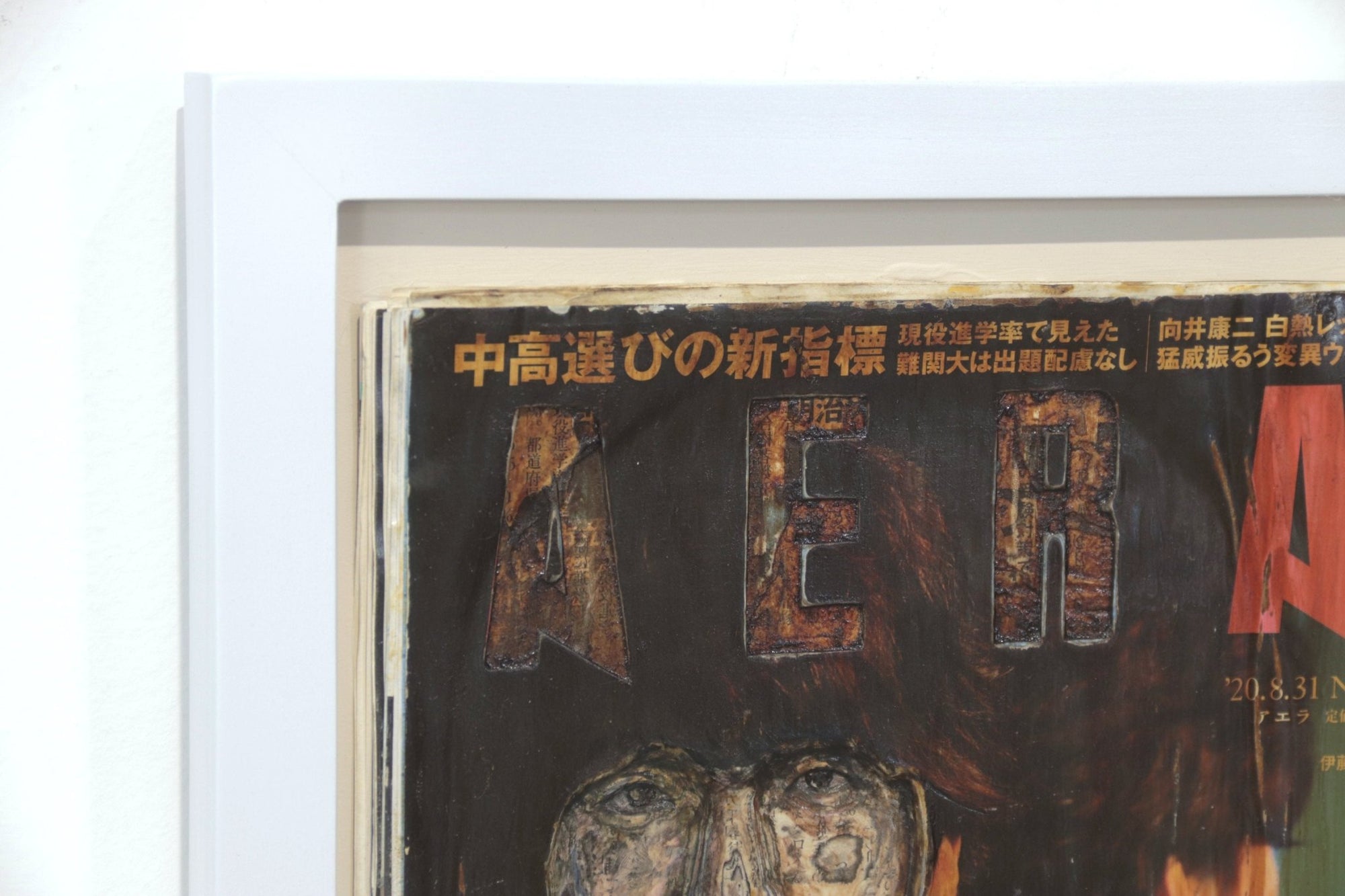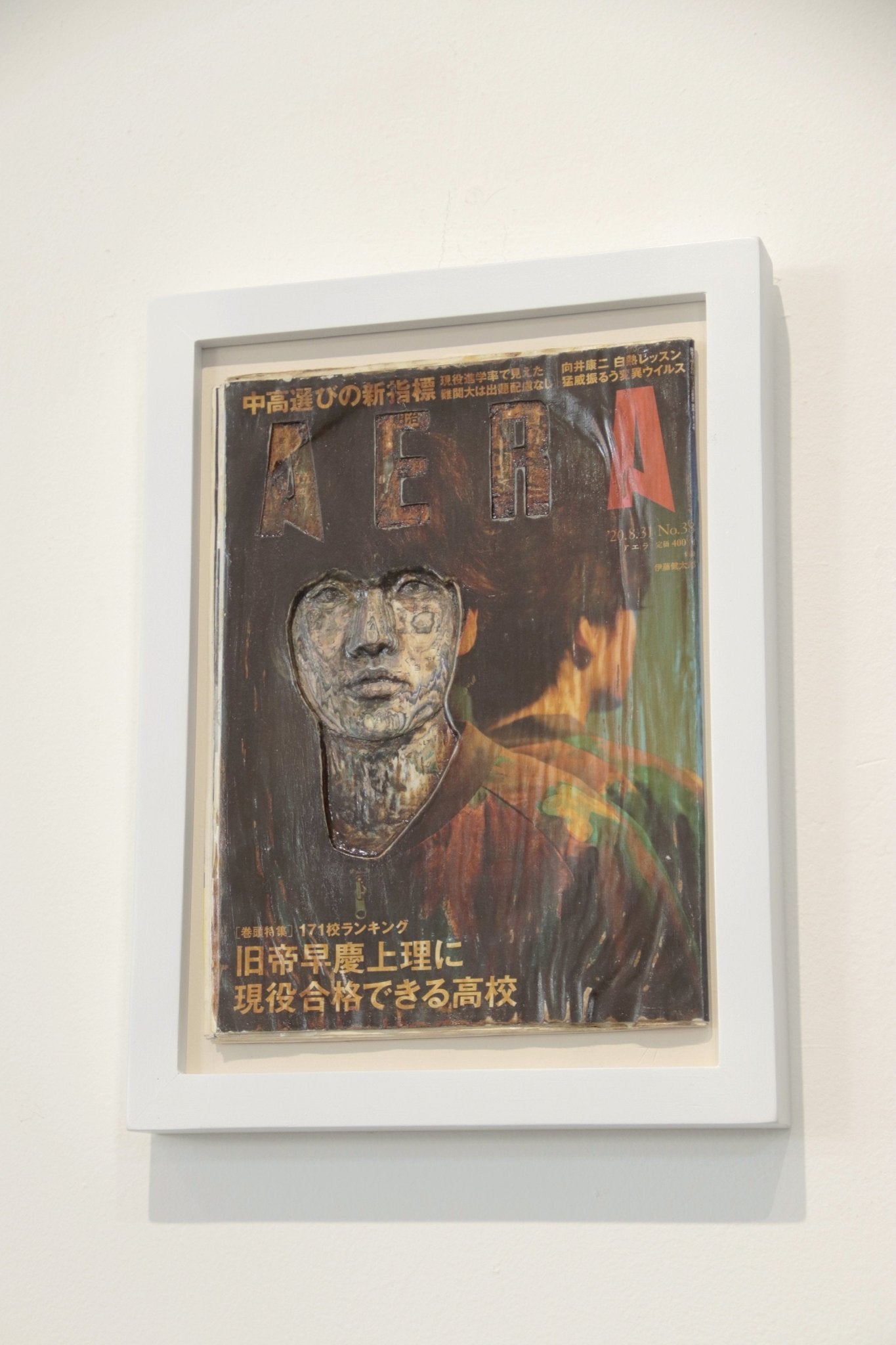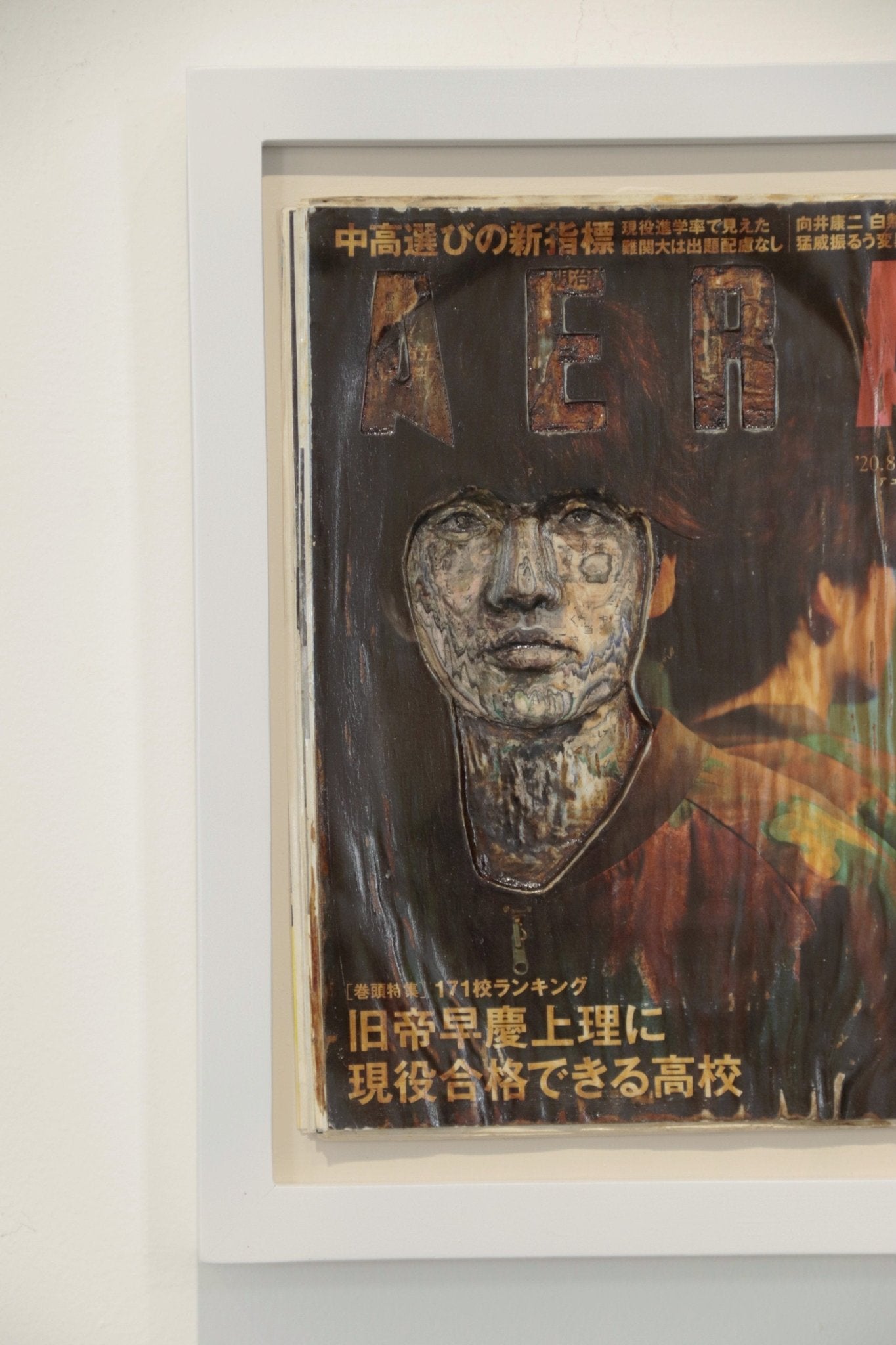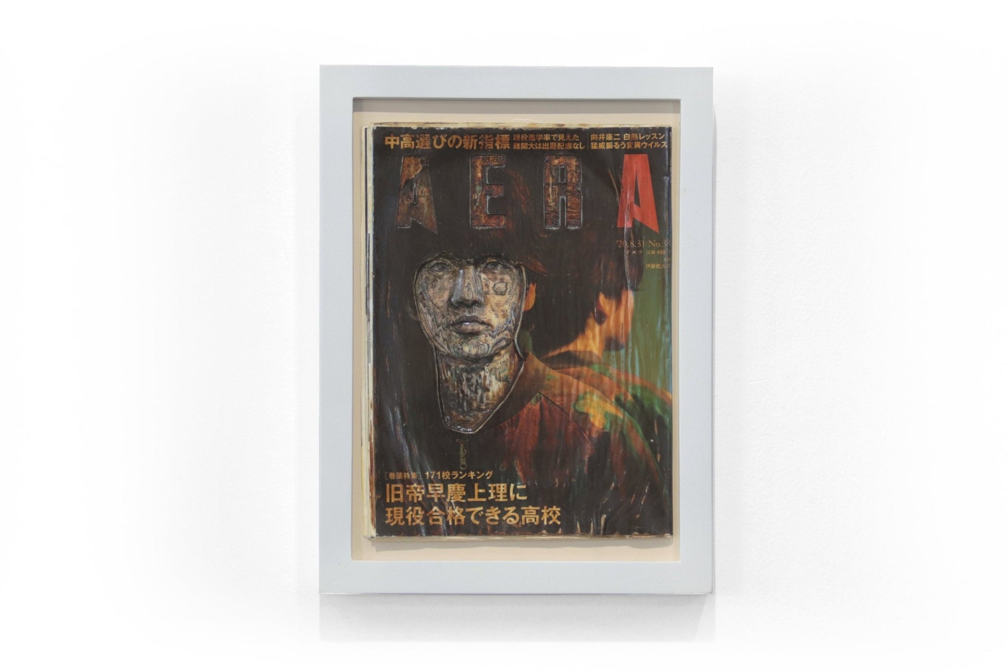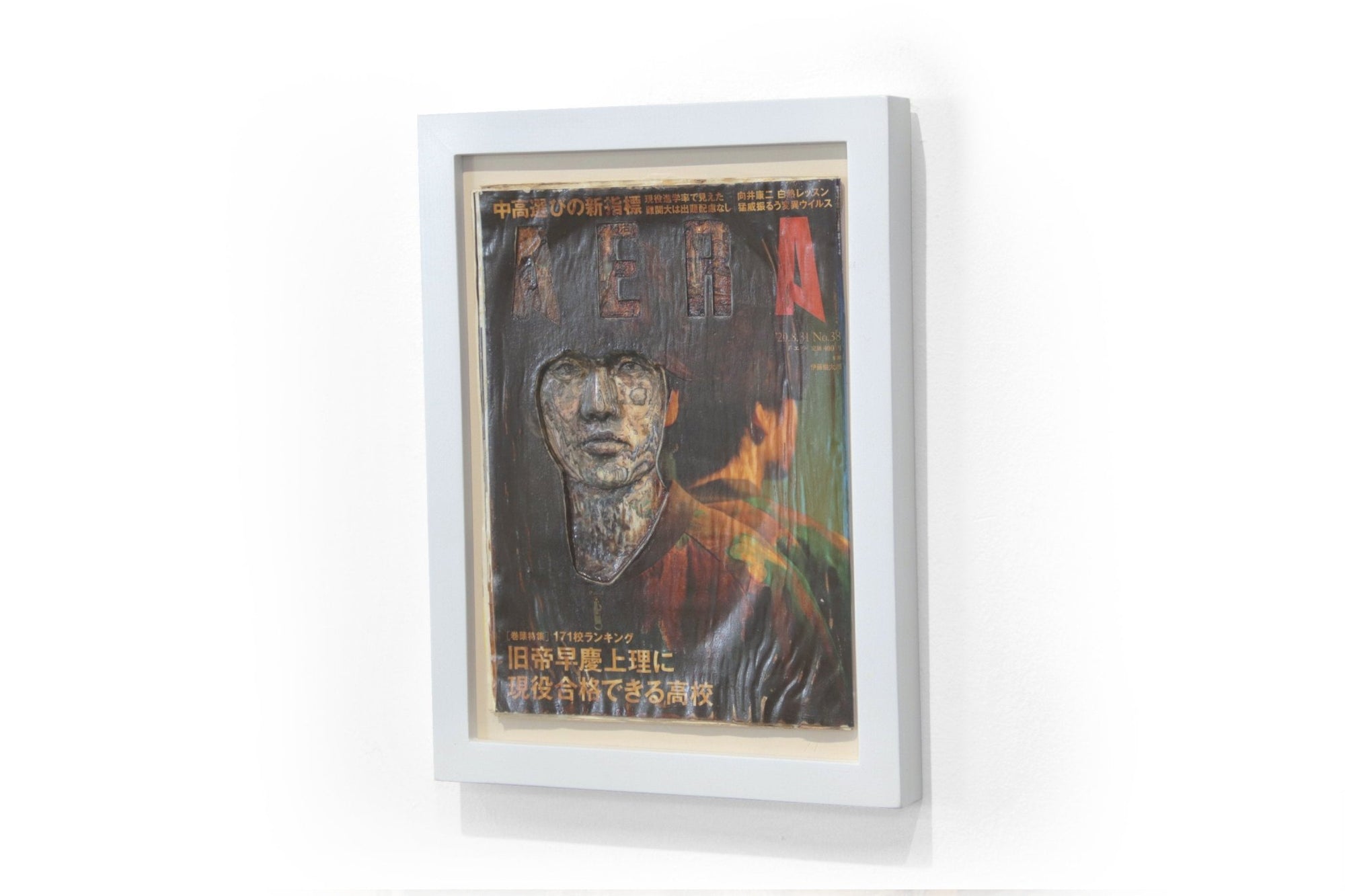"Colores Interiores (Kentaro Ito en Aera)" es una obra que combina técnicas de collage y resinas transparentes para explorar las capas de identidad y percepción en la sociedad contemporánea. Utilizando la portada de la revista Aera, que presenta al actor japonés Kentaro Ito, Taro Tokuyama transforma un elemento efímero y cotidiano en una obra de arte con profundidad conceptual.