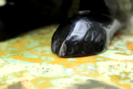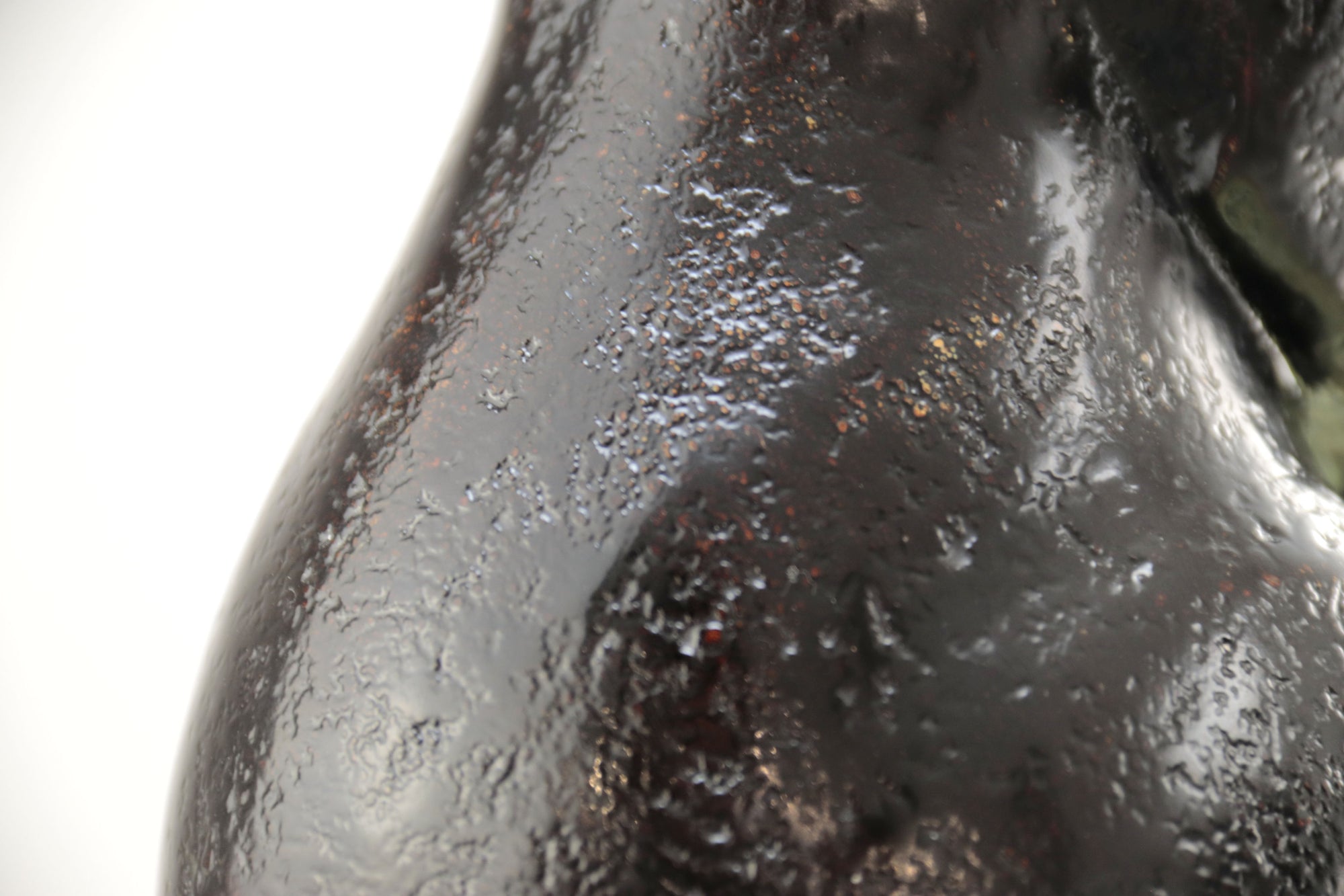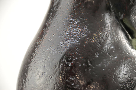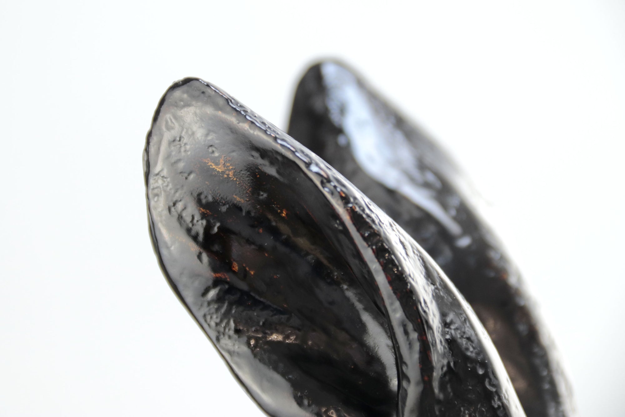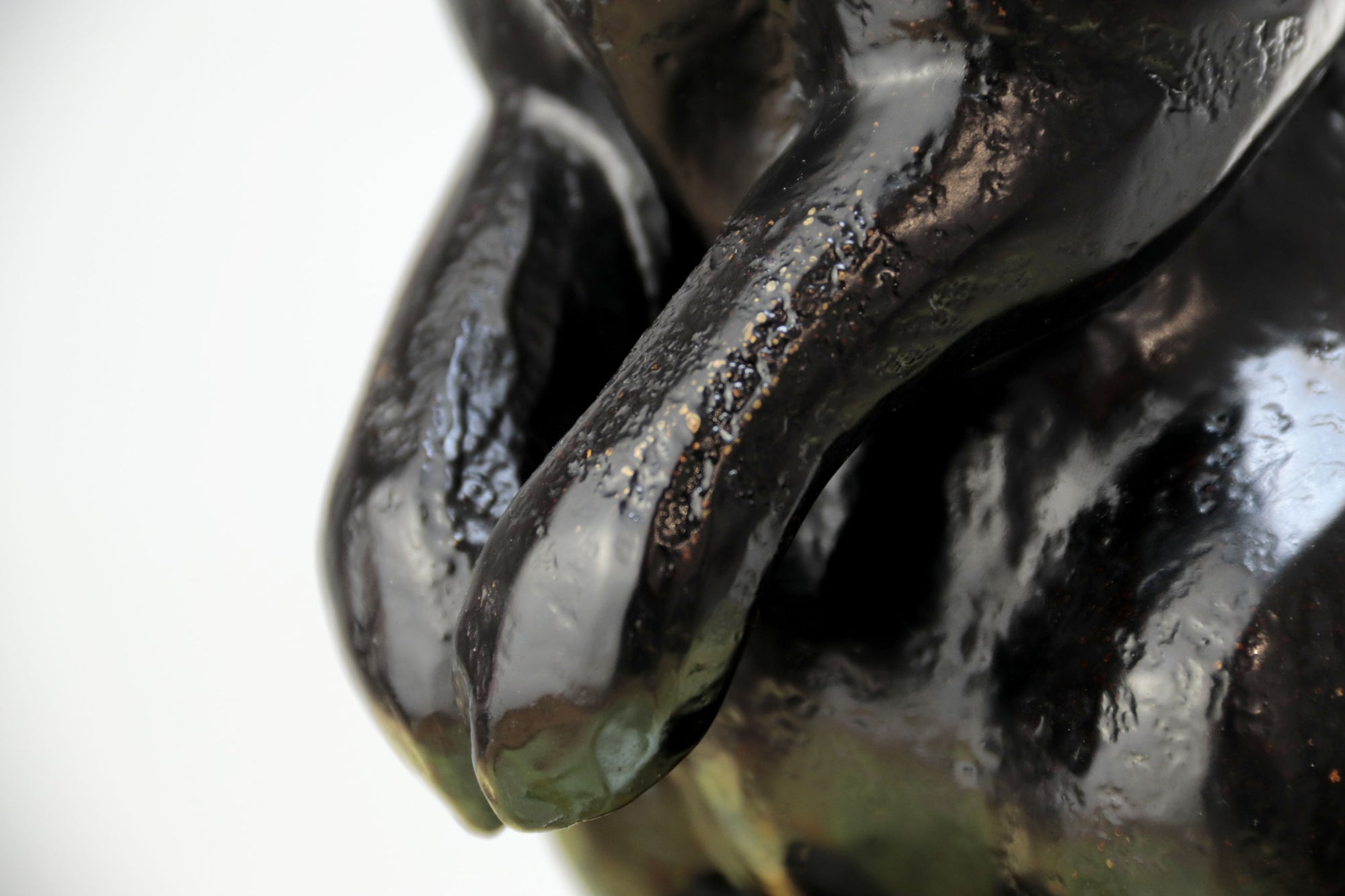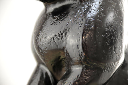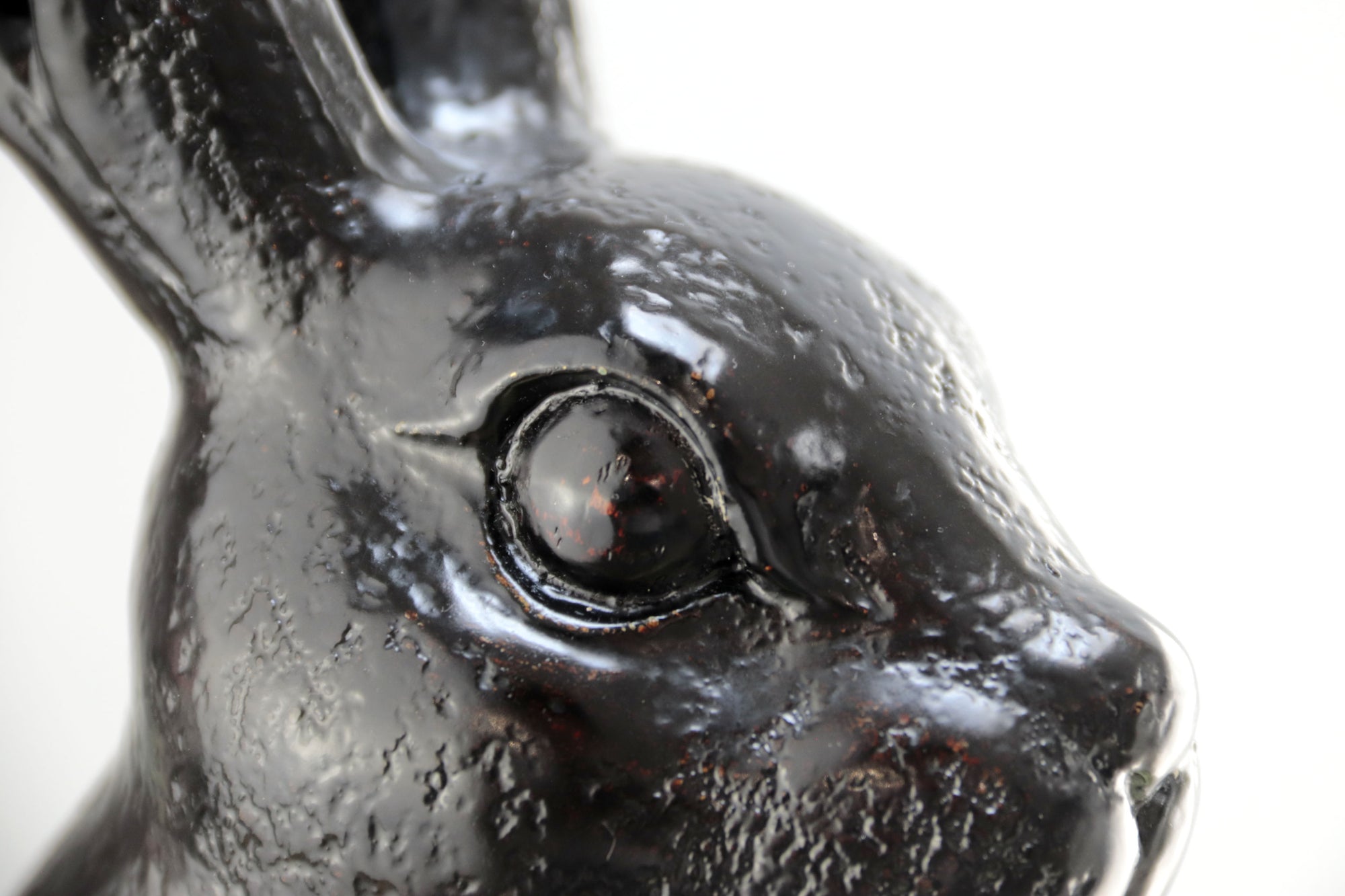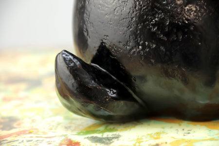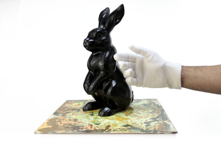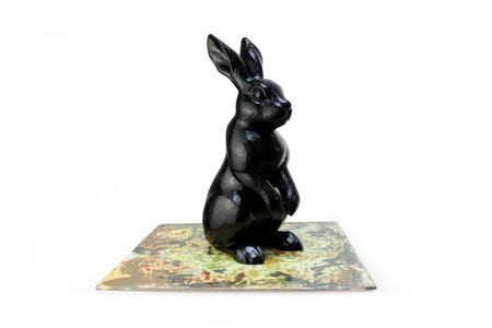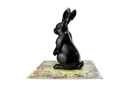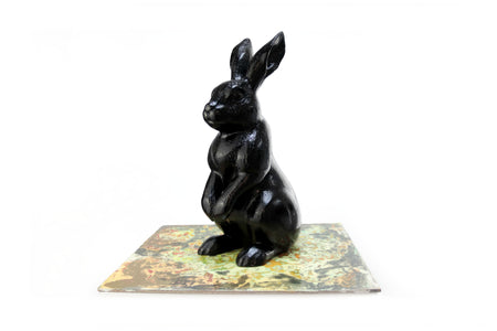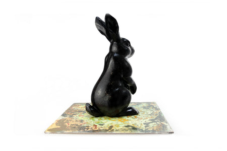 La figura del conejo emerge con una presencia silenciosa y enigmática, envuelta por la profundidad del negro que la recubre. Su superficie pulida refleja la luz como si contuviera algo latente bajo la piel, una energía interior que se sugiere más que se muestra. La base colorida actúa como contrapunto: un mapa de emociones o pensamientos que parecen irradiar desde el interior hacia el entorno. La obra plantea la tensión entre lo visible y lo oculto, lo que se revela sólo a quien observa con detenimiento.