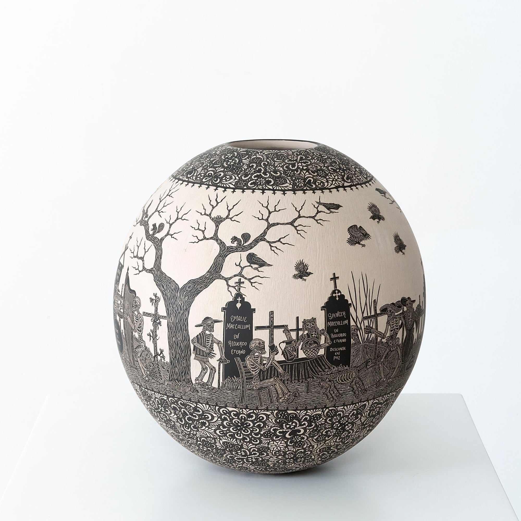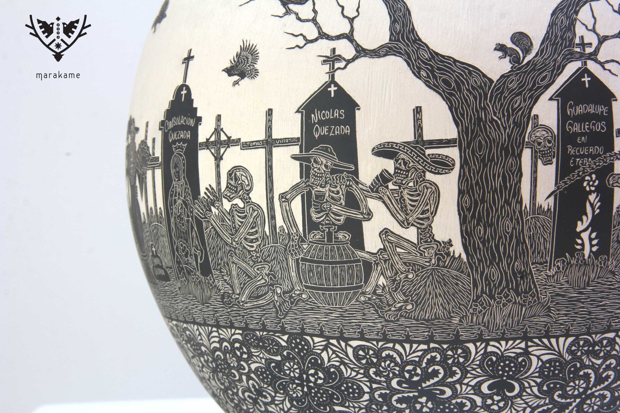 En esta pieza de cerámica de Mata Ortiz, se representa el Día de Muertos, una de las tradiciones más importantes de México, donde se honra a nuestros ancestros. En este caso, se honra a los primeros ceramistas, que sentaron la base para las siguientes generaciones en Chihuahua.