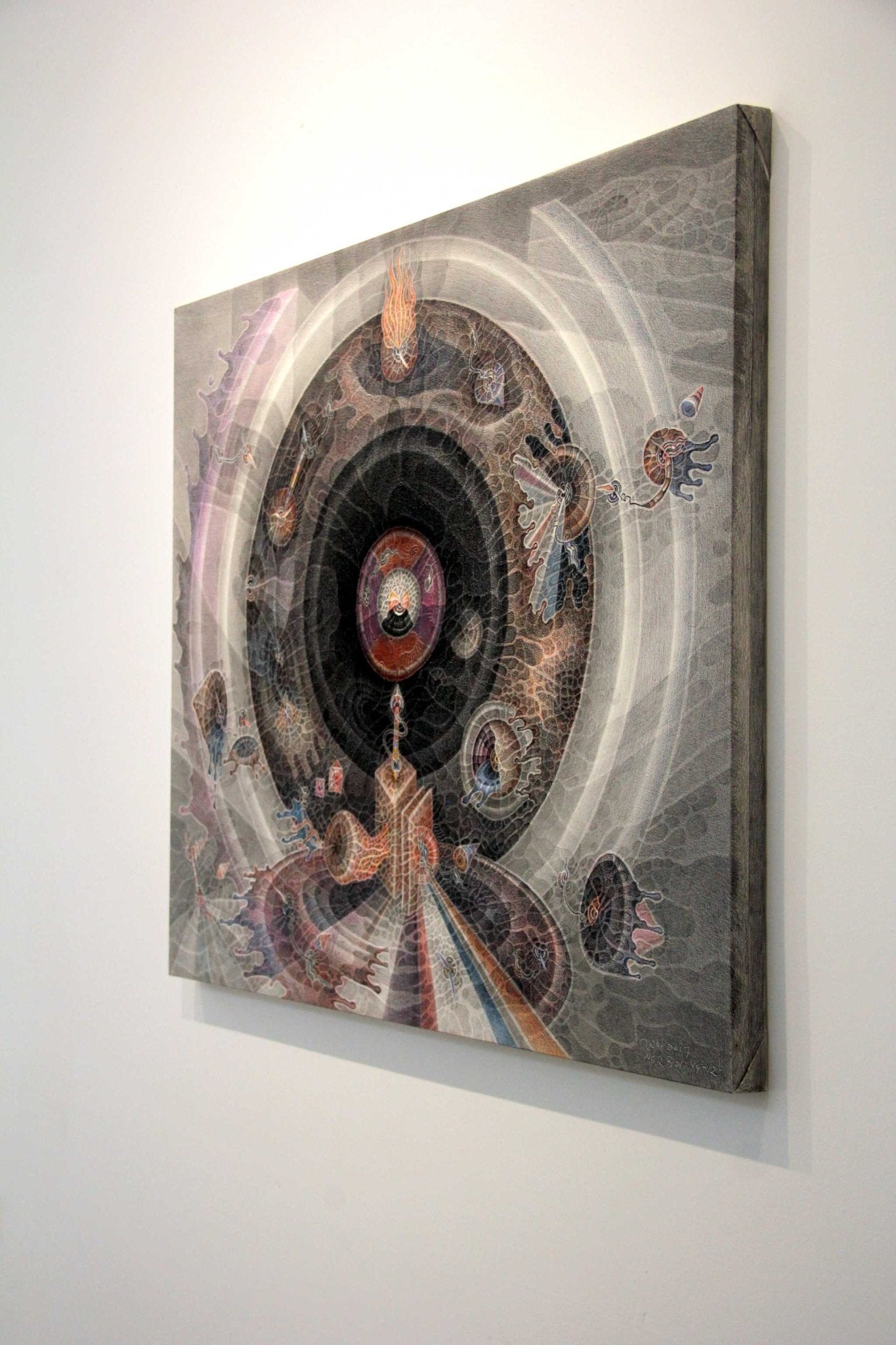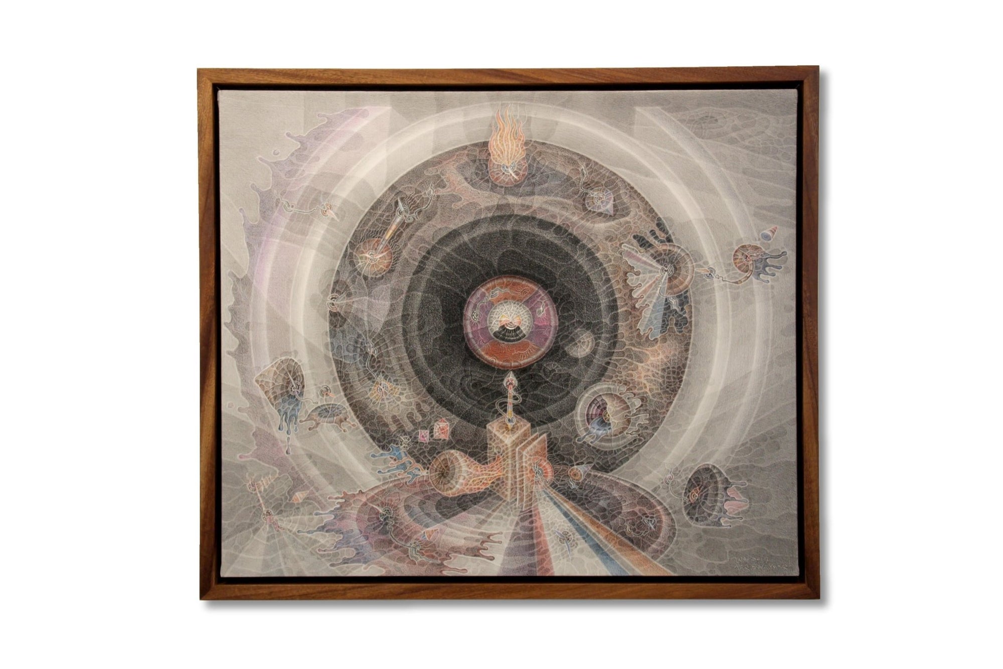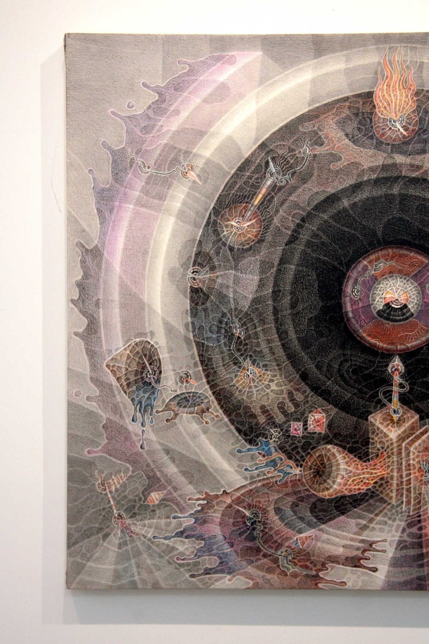 El trabajo de Wirantawan, aunque moderno, resuena con la perspectiva filosófica hindú balinesa y se caracteriza por la geometría sagrada, donde líneas armoniosas crean símbolos que impactan en el subconsciente. Los círculos, representando la perfección de la naturaleza, son recurrentes en su obra, reflejando patrones cíclicos de la vida. Su arte contrasta dualidades de luz y oscuridad, creando profundidad y dimensión en formas surrealistas.