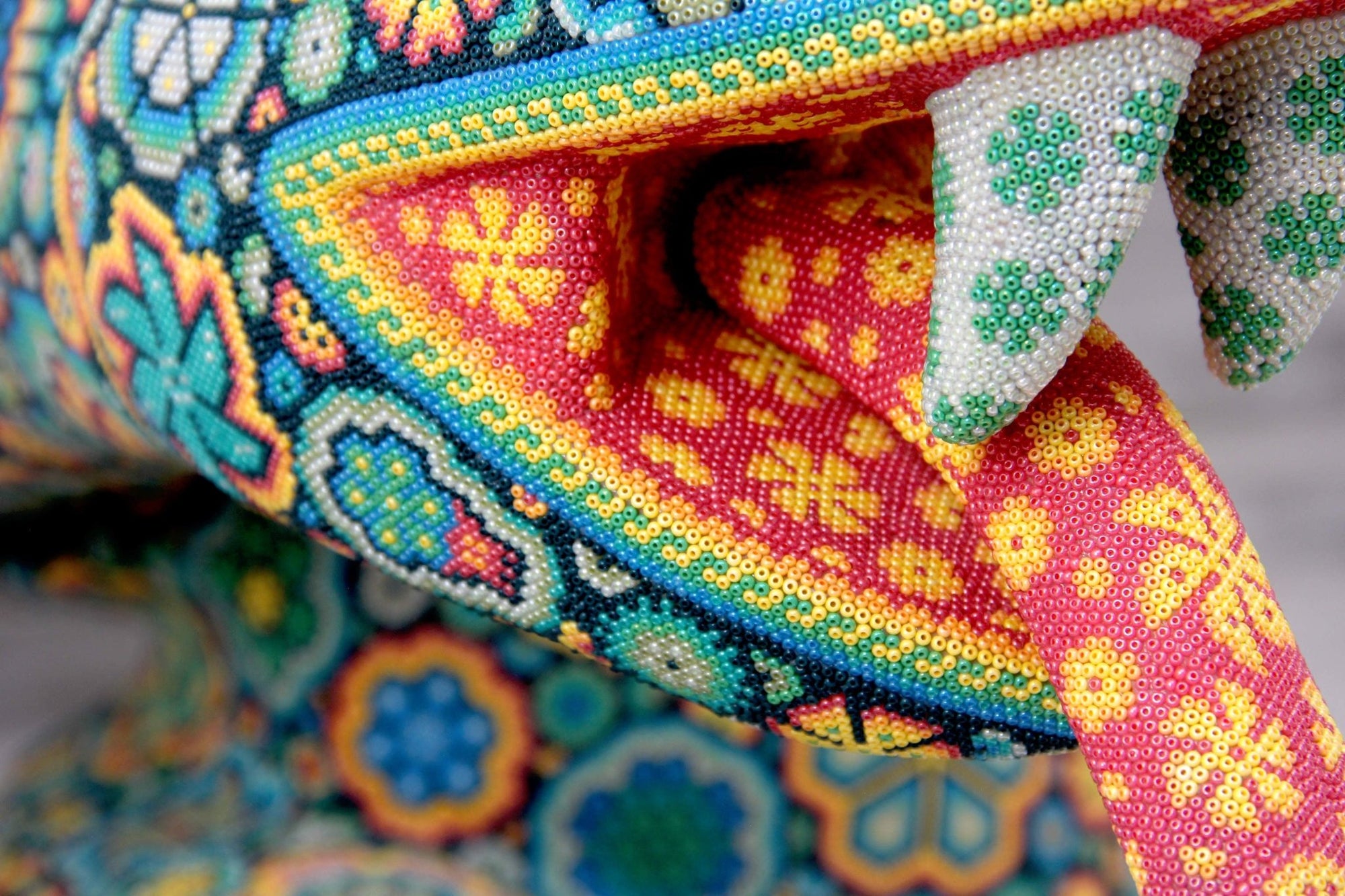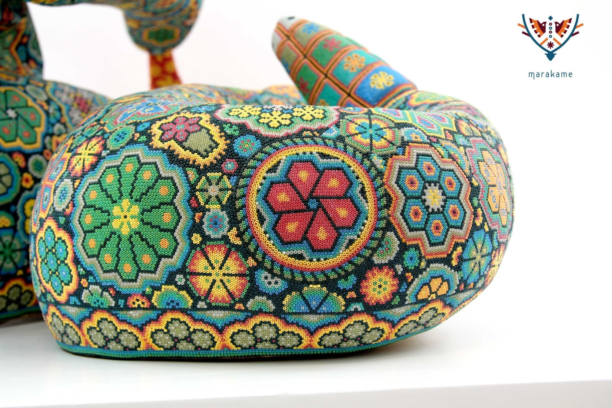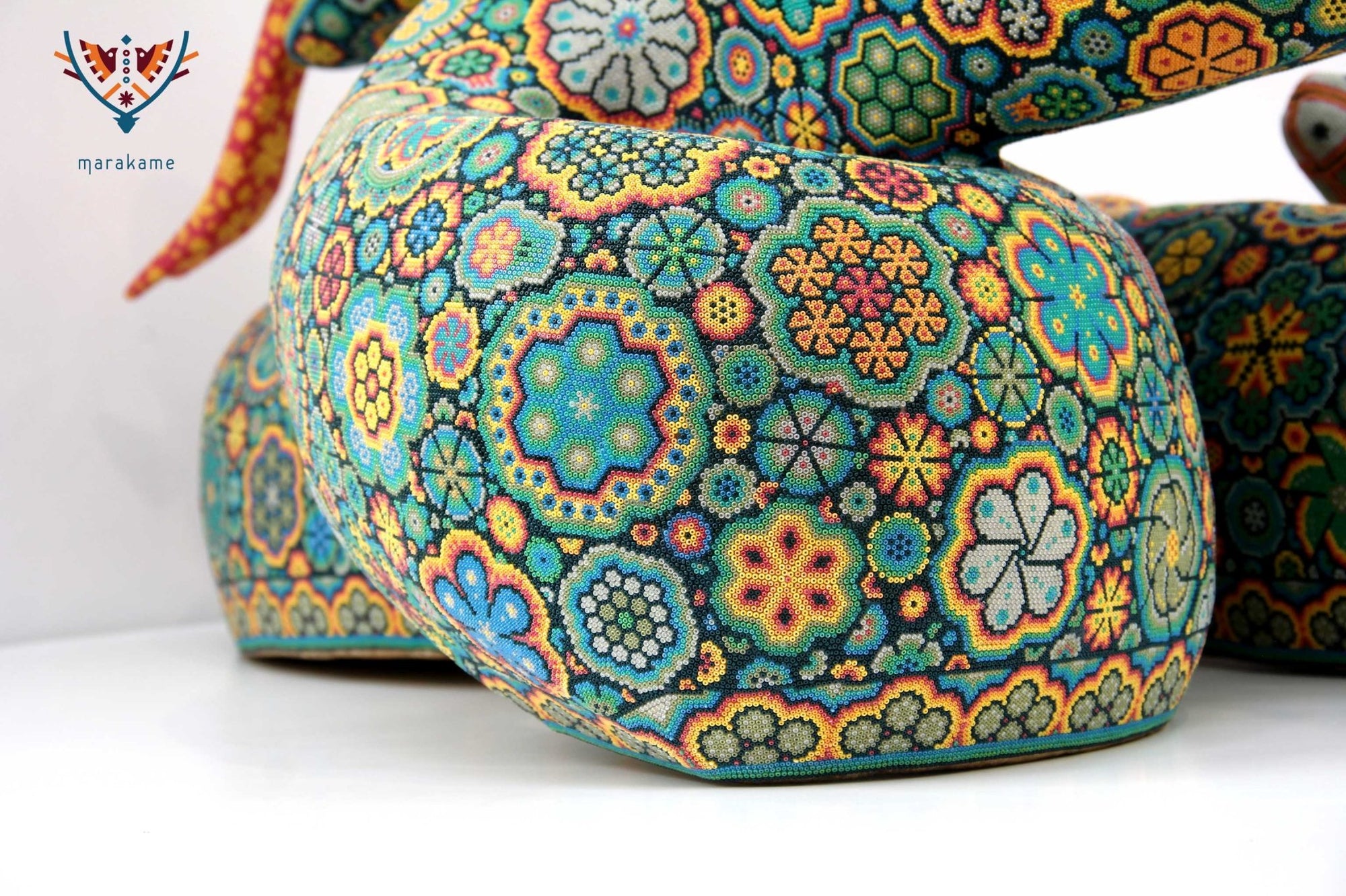 Marakame innova e integra las habilidades de los artistas Zapotecas, fusionando las piezas logradas por ellos con la destreza visual y manual de los Wixárika al pegar chaquiras de tamaño diminuto una a una, desde 20 mil hasta más de 500 mil (como en esta pieza), durante períodos que van de entre 15 y 300 días.