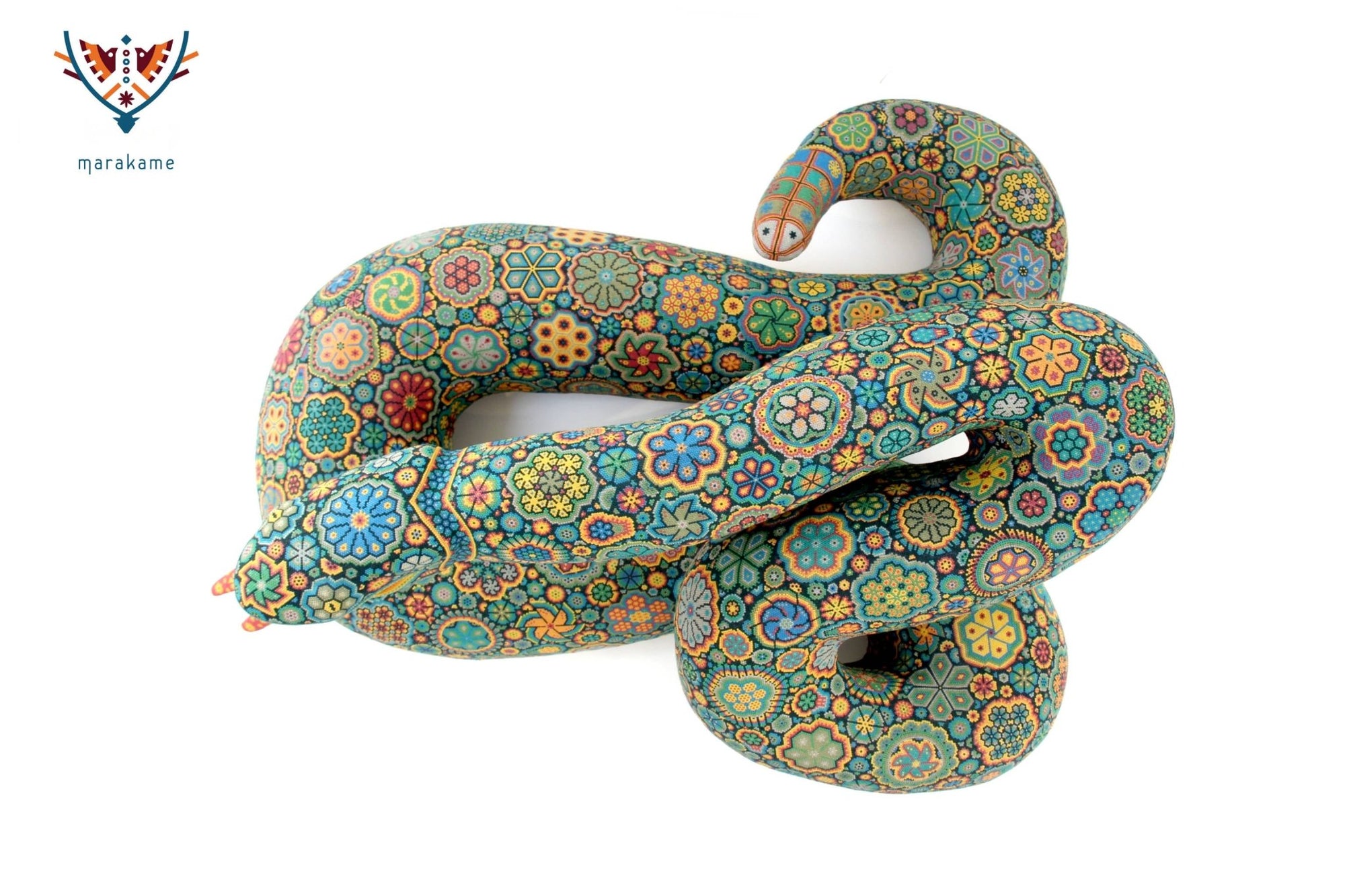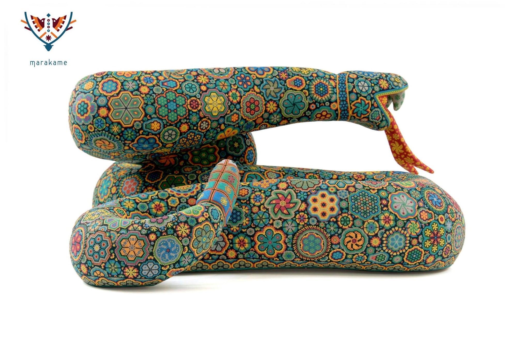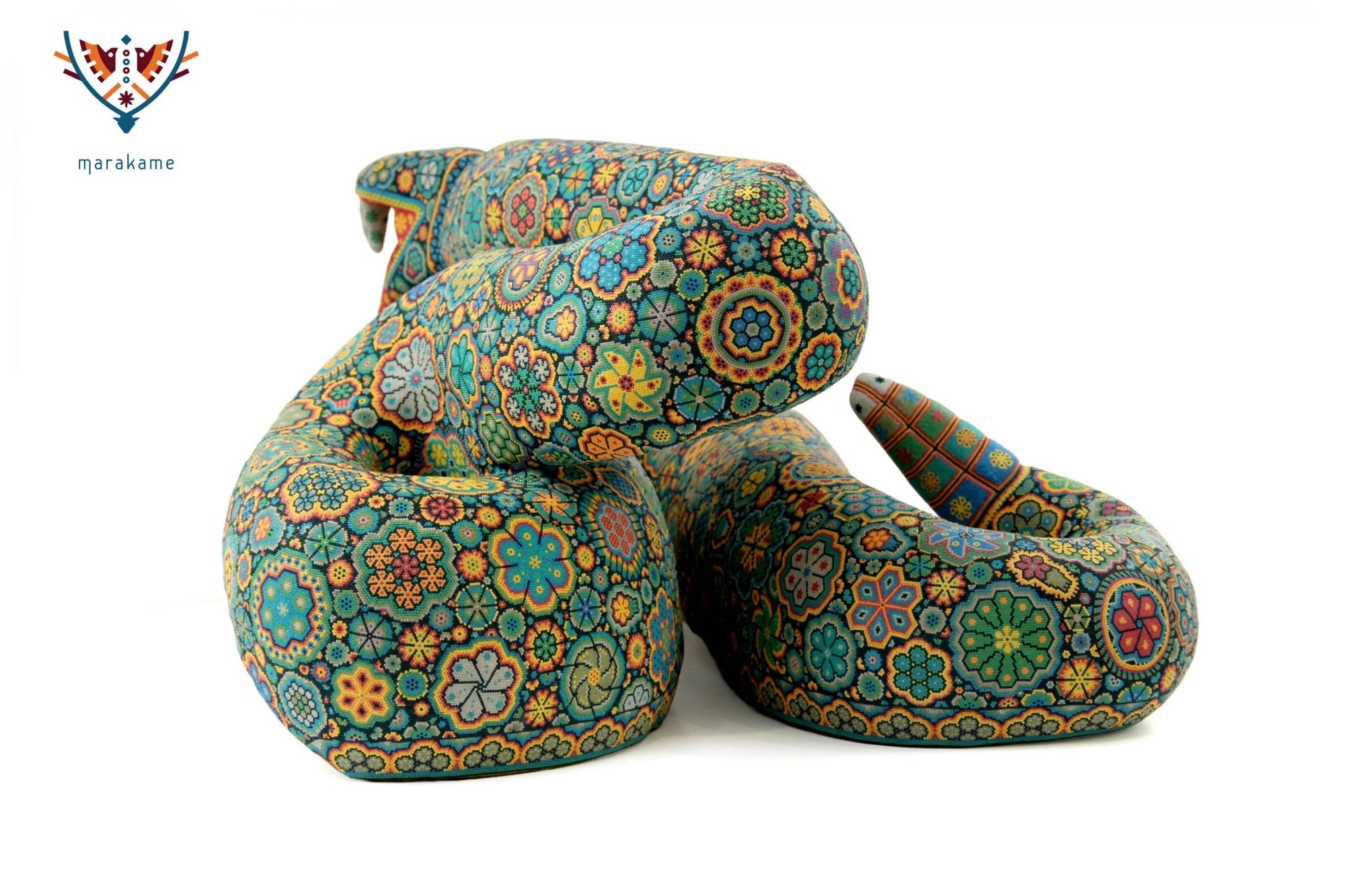 Marakame innova e integra las habilidades de los artistas Zapotecas, fusionando las piezas logradas por ellos con la destreza visual y manual de los Wixárika al pegar chaquiras de tamaño diminuto una a una, desde 20 mil hasta más de 500 mil (como en esta pieza), durante períodos que van de entre 15 y 300 días.